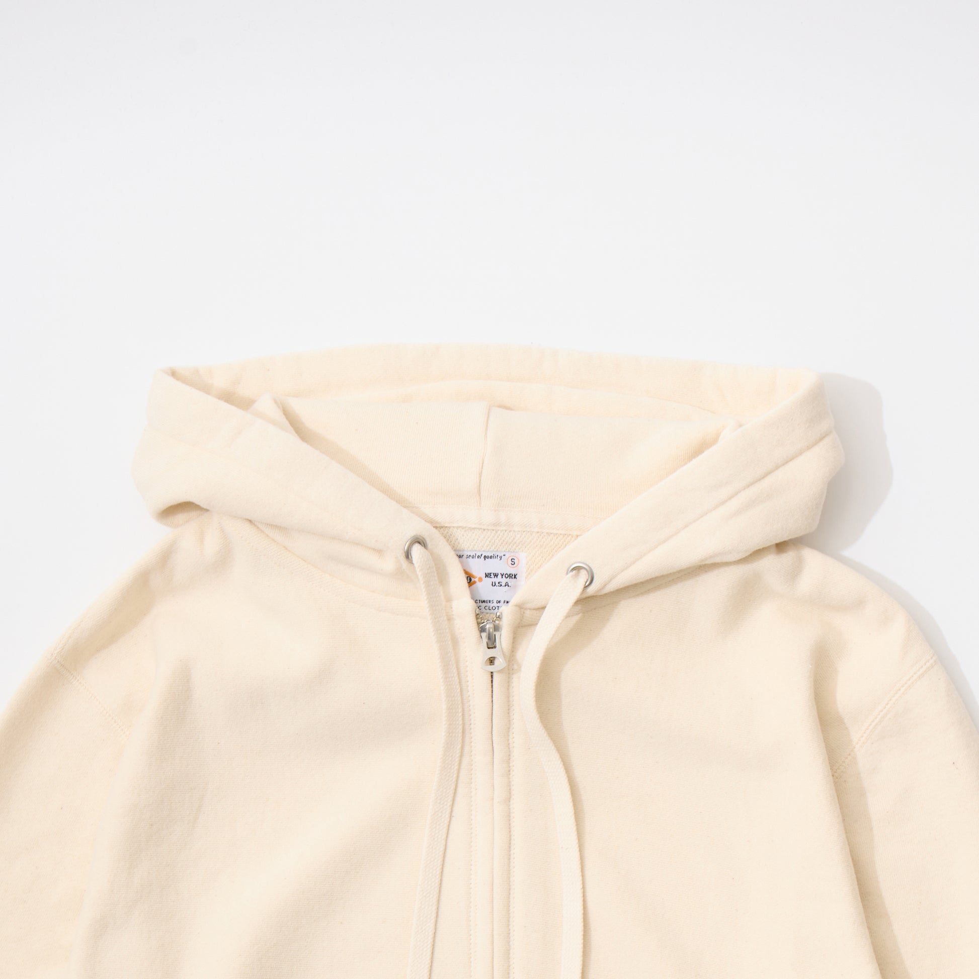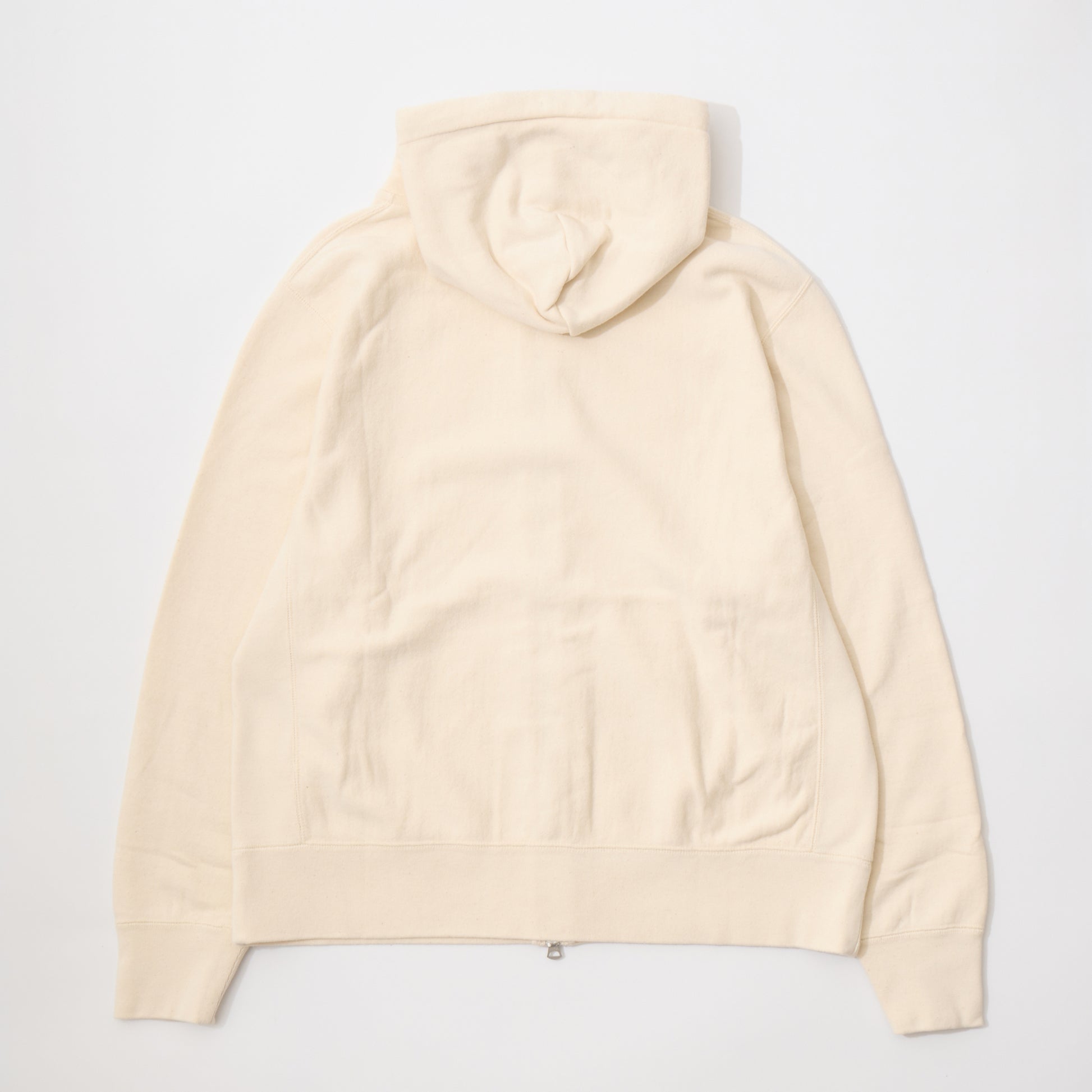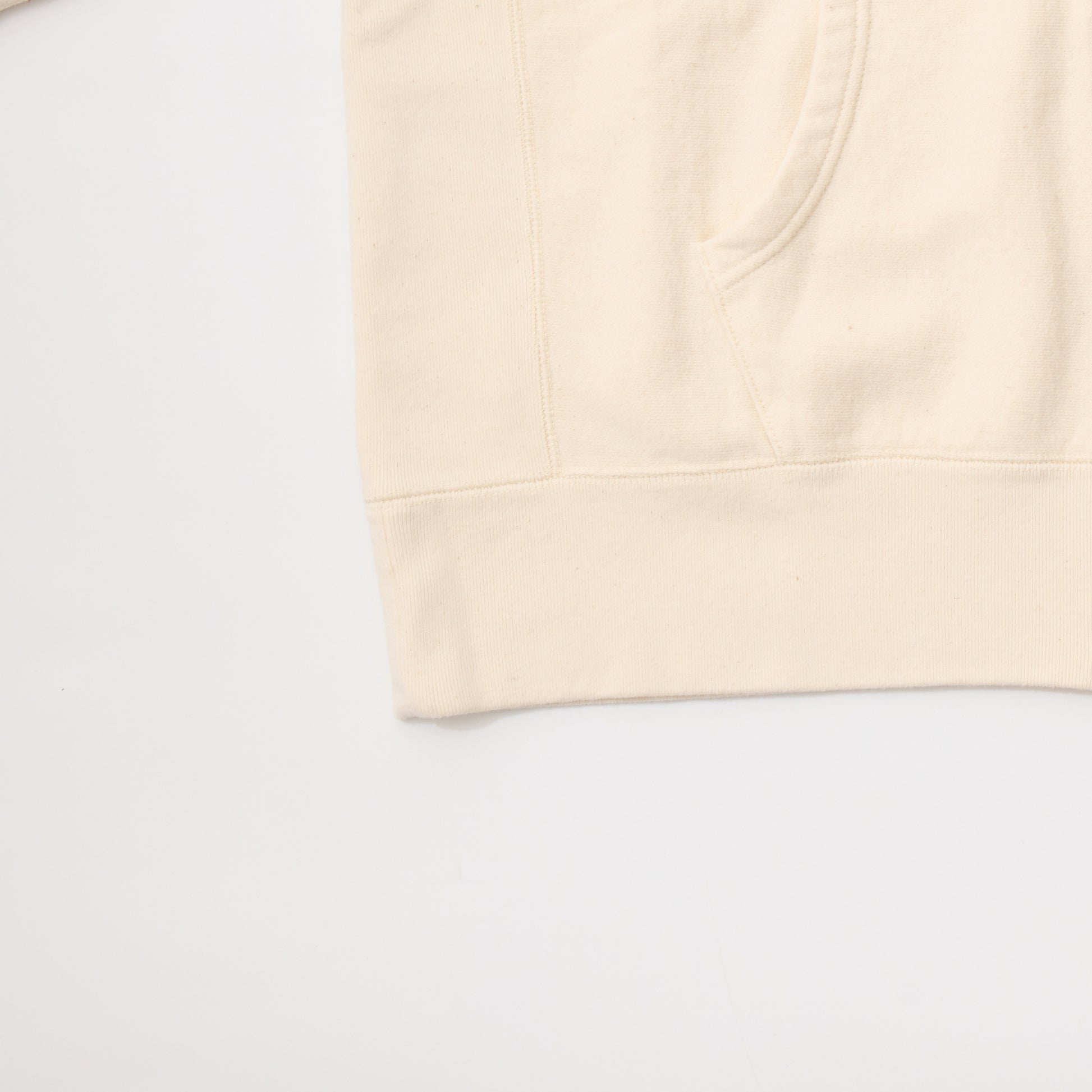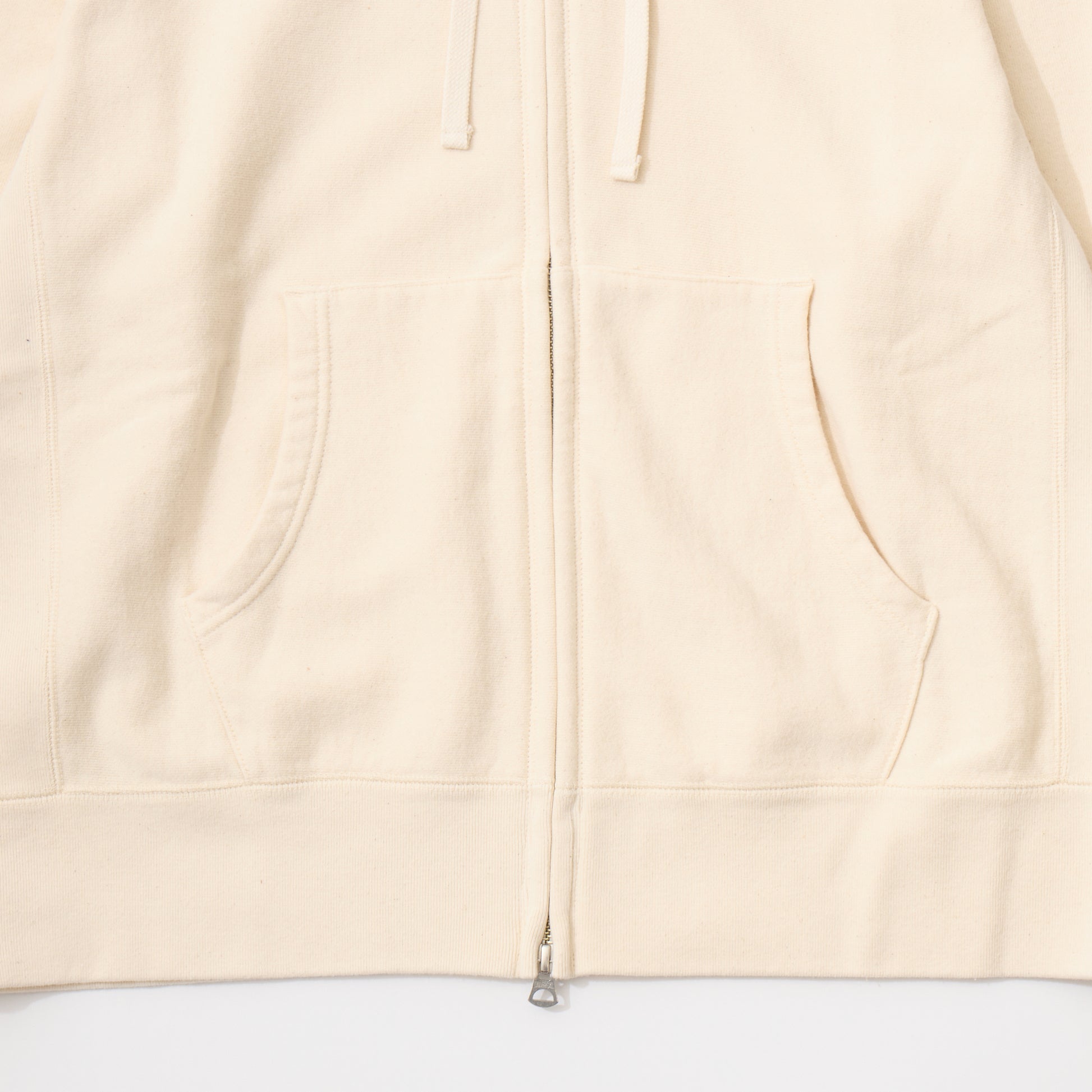 A full-zip parka made from lightweight French terry (non-brushed sweatshirt fabric) with moderate thickness and resilience. Featuring an inverse weave construction that places the fabric horizontally to reduce vertical shrinkage, while side rib panels prevent horizontal shrinkage and enhance ease of movement. Designed with a convenient double zipper and finished with a kangaroo pocket on the front.