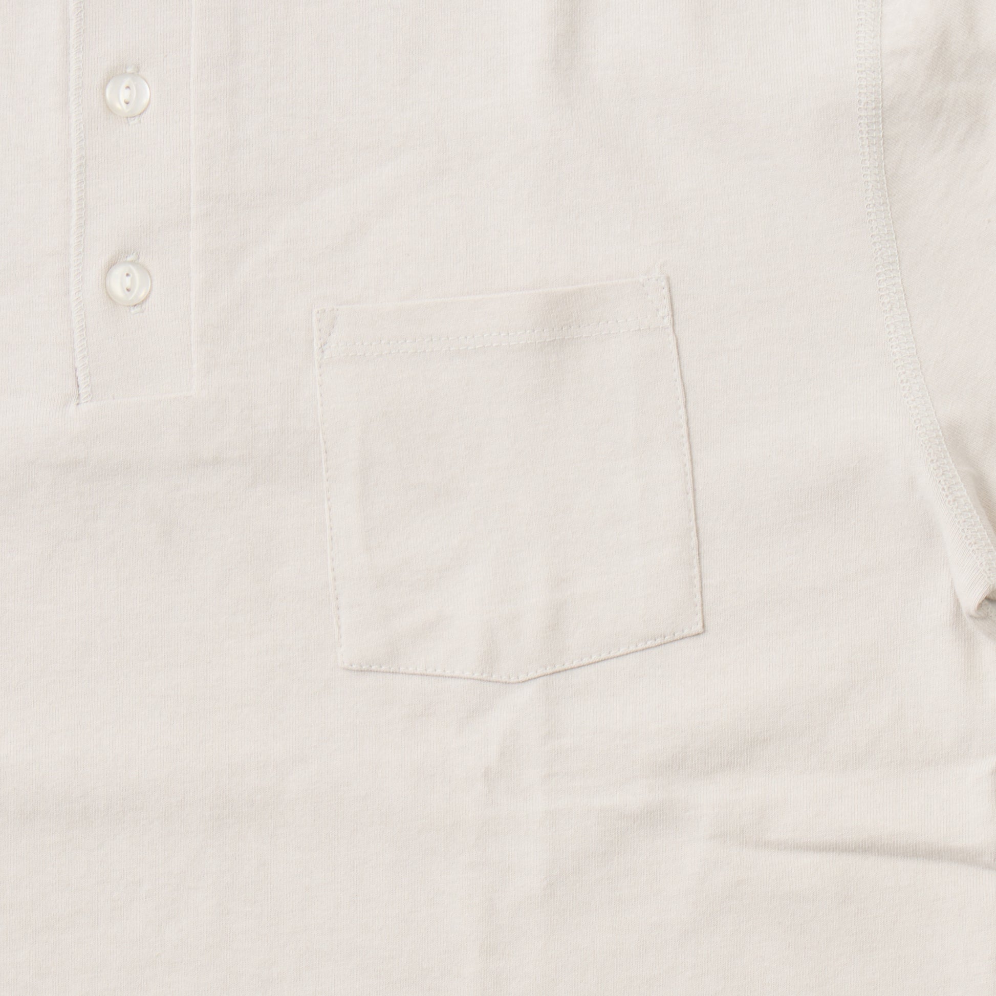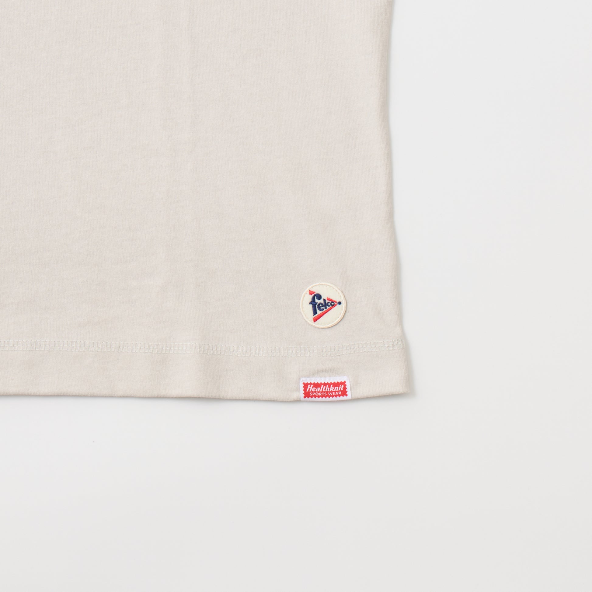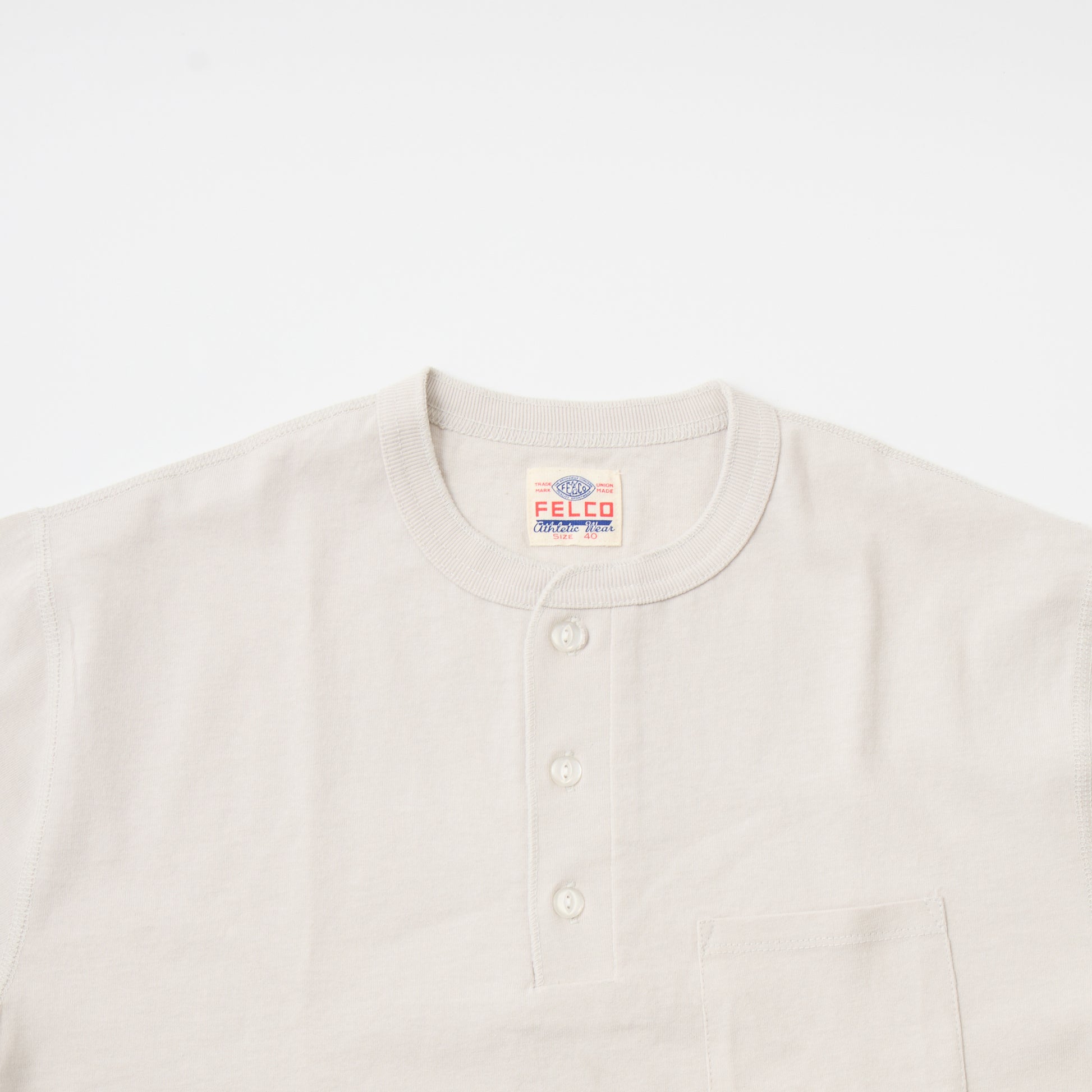 HEALTH KNIT(ヘルスニット)とFELCO(フェルコ)のダブルネームとなるS/S HENLEY NECK POCKET-T U.S.COTTON OPEN END JERSEY。ヘルスニットのアイコンになっている3つボタンヘンリーネックTシャツに胸ポケットを付けて別注したフェルコとのコラボレーションの1枚です。風合いの良いU.Sコットンに抗菌防臭、吸汗速乾にして特注で編み立てた生地を使用。フラットシーマと呼ばれる特殊なミシンを使用した4本針のステッチが特徴。左裾に付けられたFELCO(フェルコ)のワッペンとヘルスニットのタグがちょっとしたアクセントになっています。ネックに付いている透明なキャッツアイボタンがヴィンテージ感を出しています。
