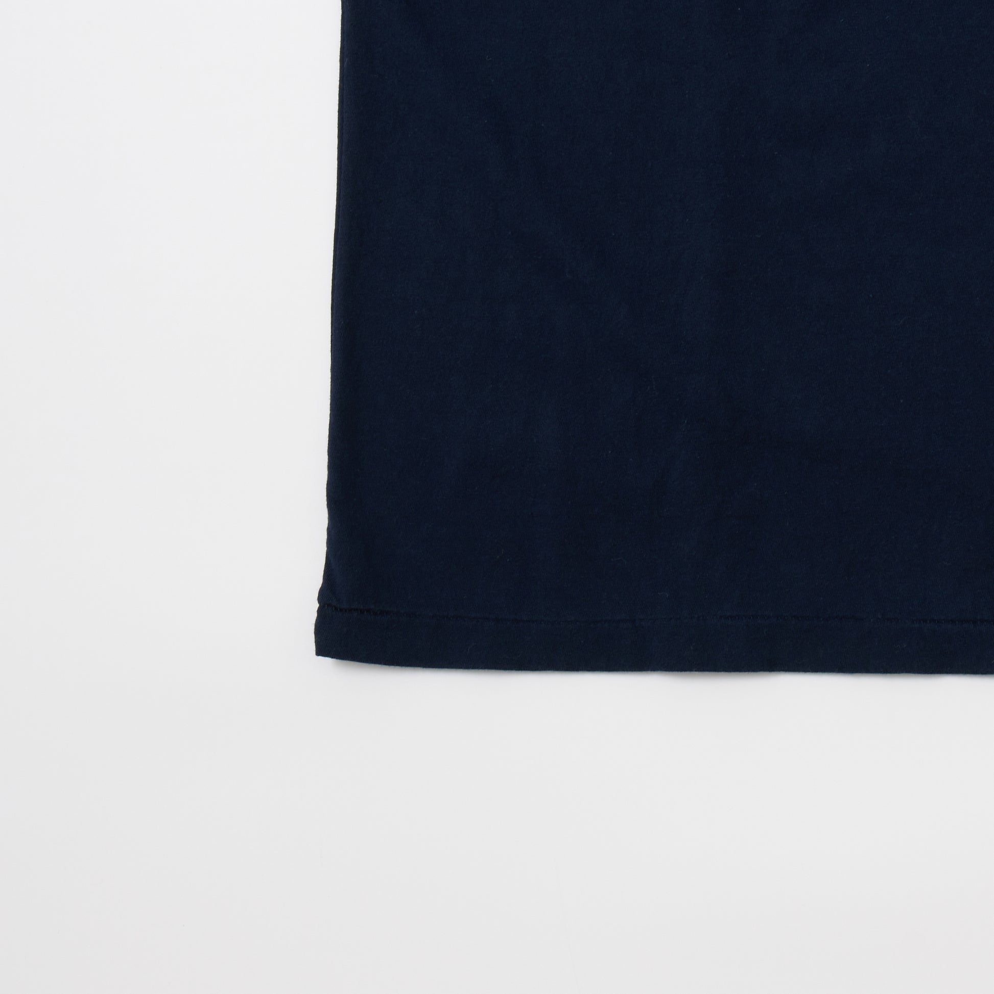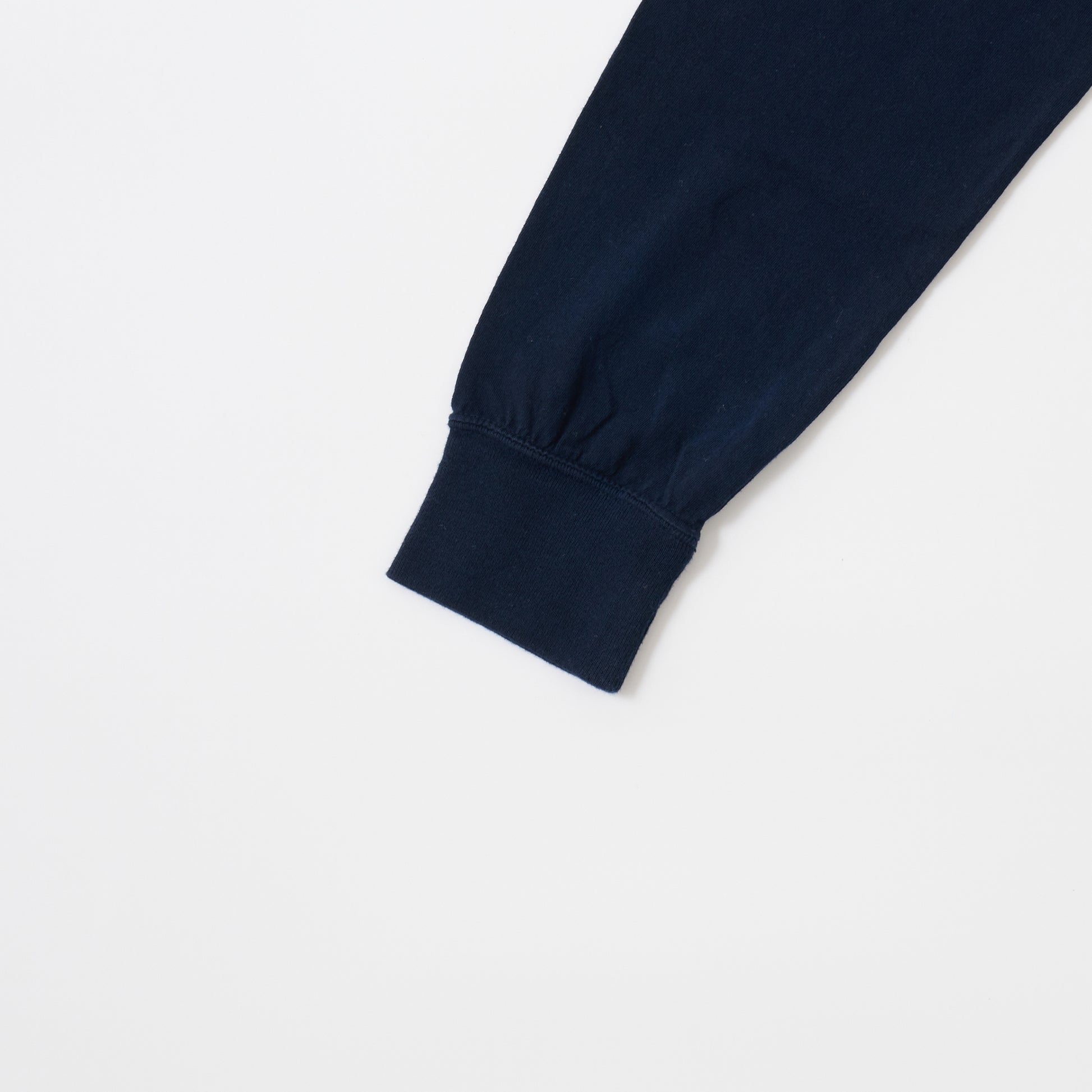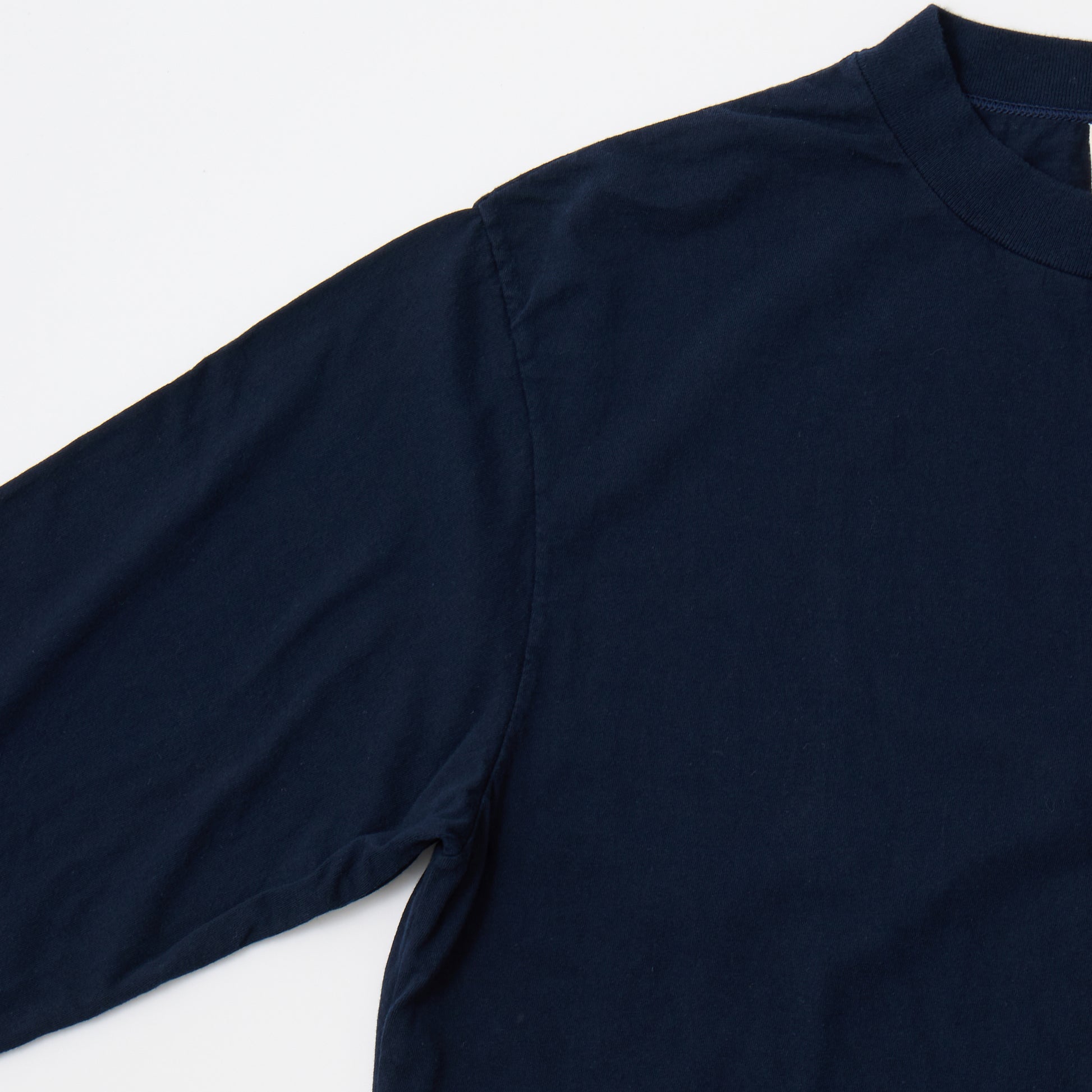 USA コットンを使った70年代に多く見られた太めのネックリブで首元の詰まった、ハイクルーが特徴的長袖ポケットTです。レーベルには、HI-CRU と記されています。70年代に各ブランドからBEEFY -T とかHI-CRU -Tと記された、ややネックリブが首元まで詰まったT-SHIRTの事です。やや短めの着丈、身幅の広めのボックスシルエットになっていて袖口はリブがついております。半袖と同じ生地で18'S ジャージーコットン の柔らかくて肌触りの良いサラッとした生地ですので長く着られる1枚です。