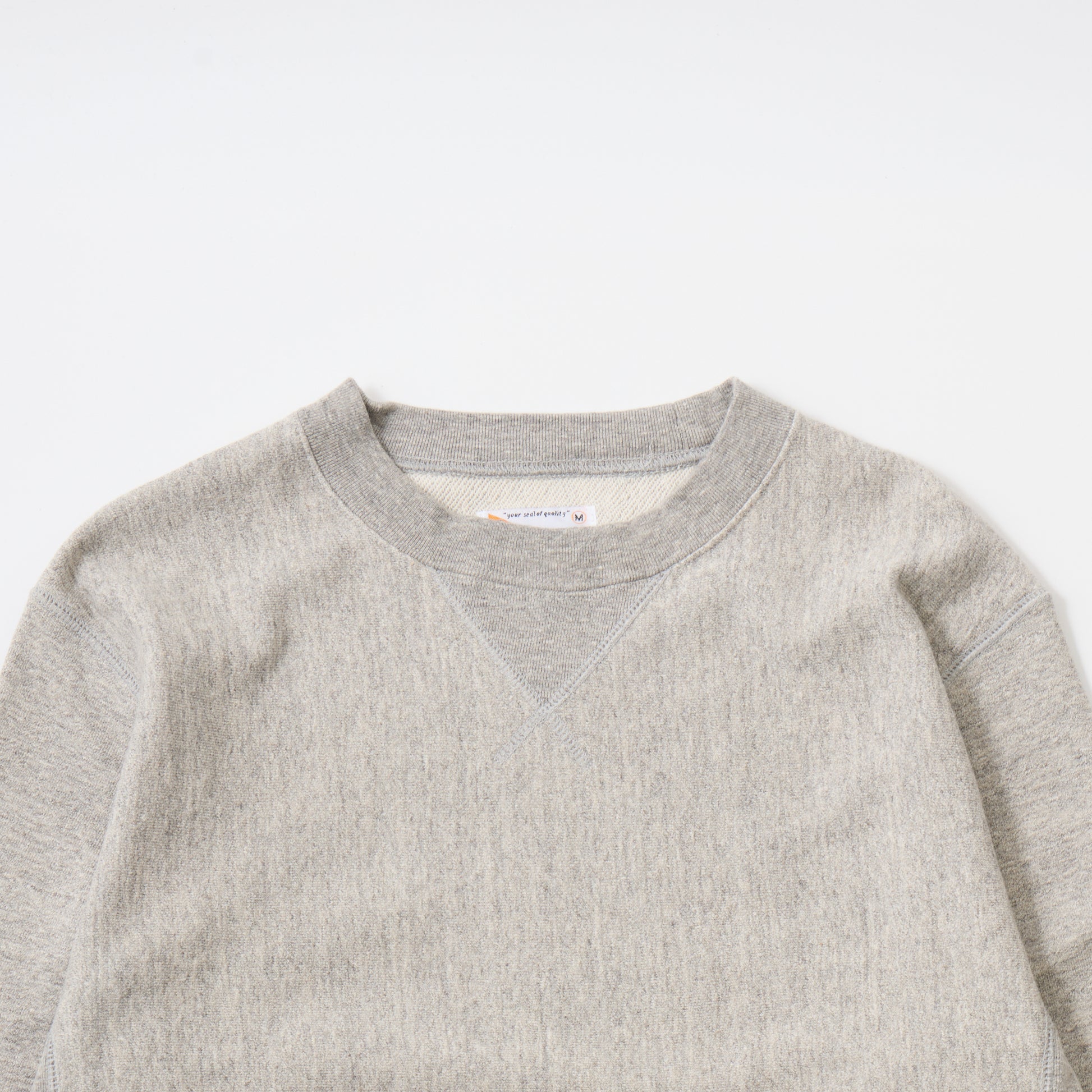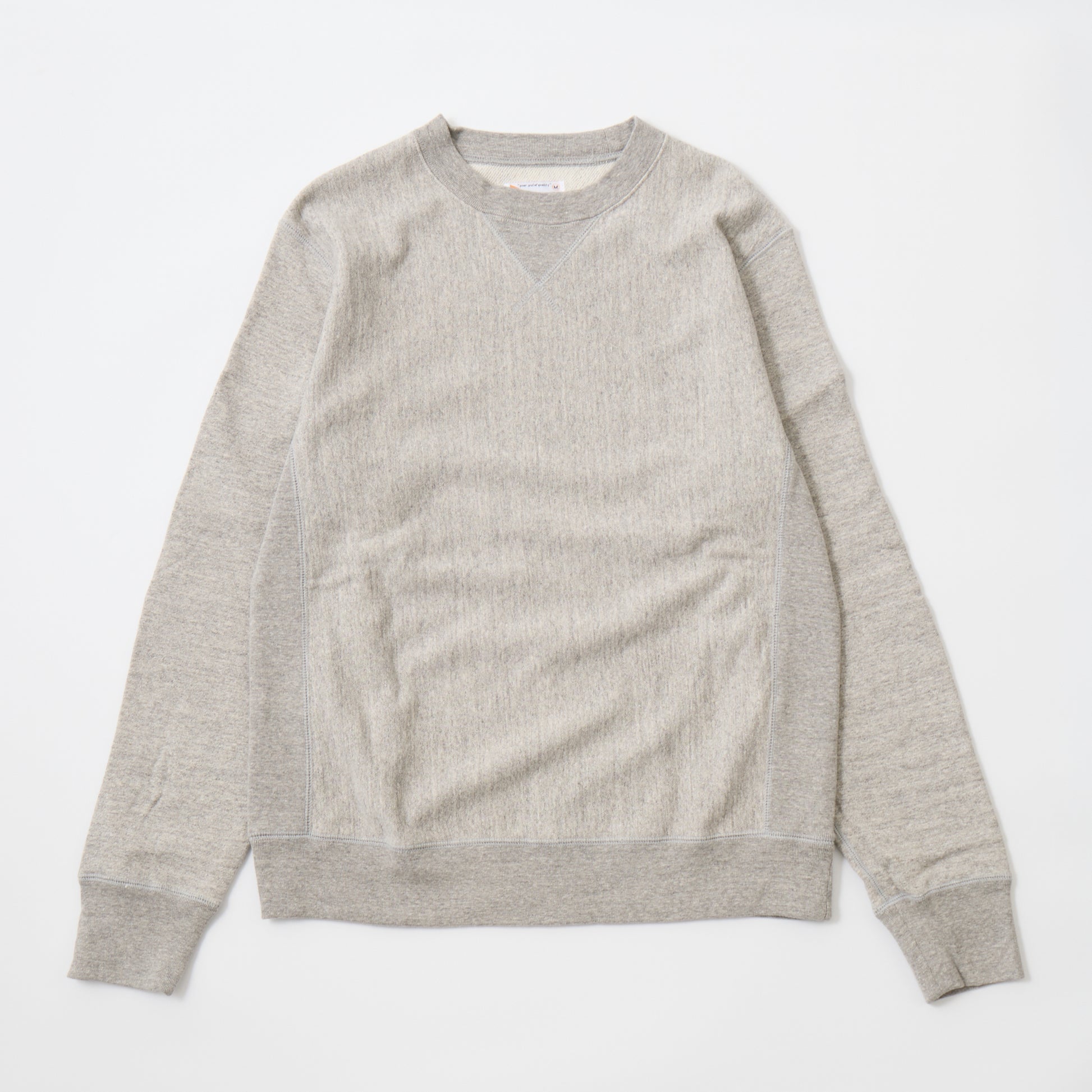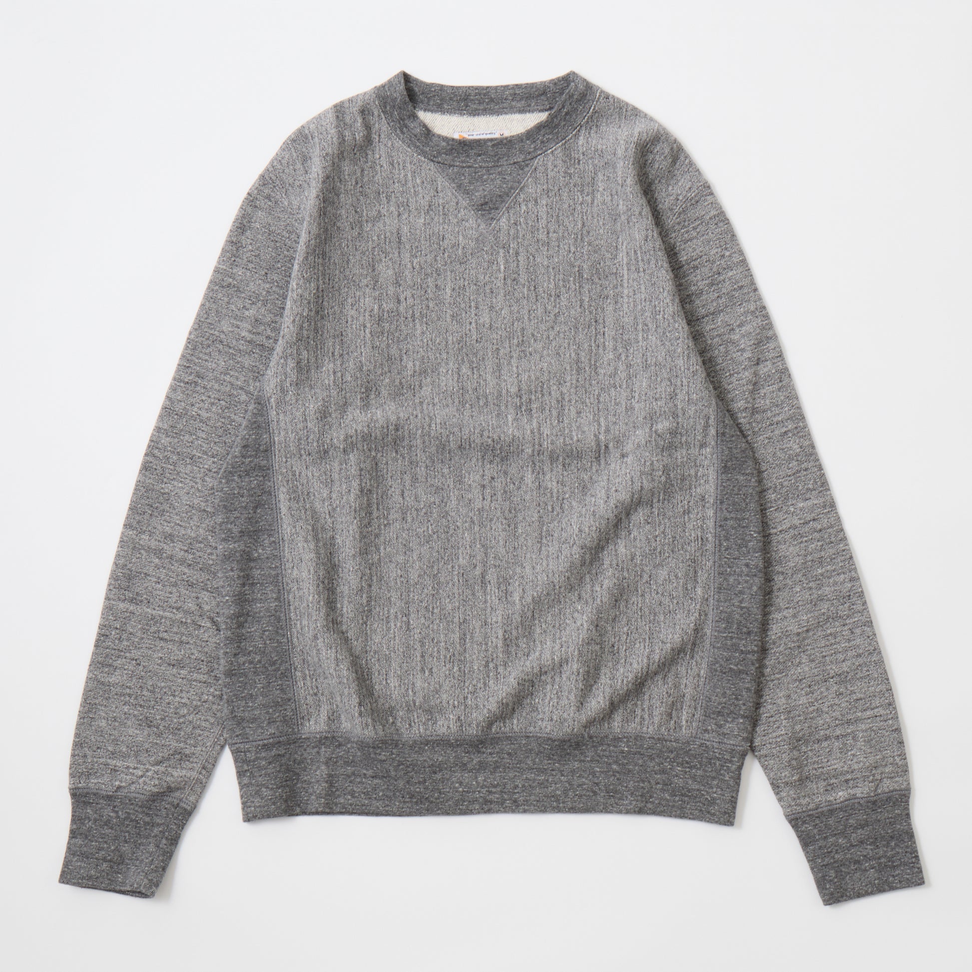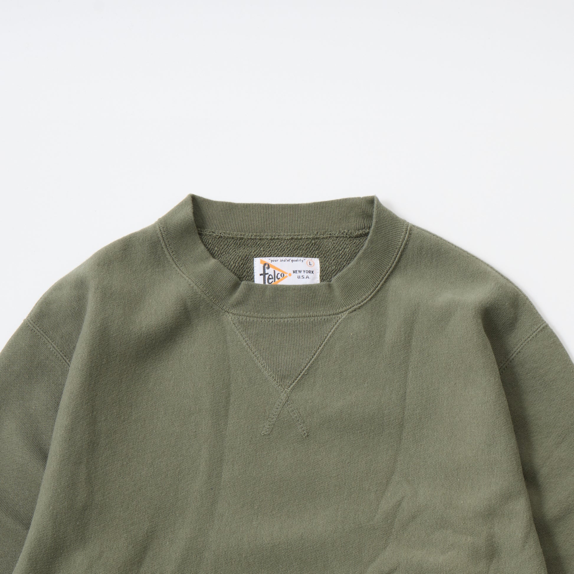 FELCO(フェルコ)の12oz TERRY INVERSE WEAVE V GUSSET SWEAT。程よい厚みとコシのあるライトウェイトのフレンチテリー(裏起毛していないスウェット生地)素材を使用した、セットインスリーブのVガゼットクルーネックスウェット。生地を横向きに使用することで縦の縮みを軽減し、サイドリブが横縮み防止と動きやすさを実現したインバースウィーブの仕様。程良くゆとりを残したサイズバランスで春先や秋口は1枚で着易く、冬にはインナーとして使いやすいウェイトで、年間通して汎用性の高いアイテムです。