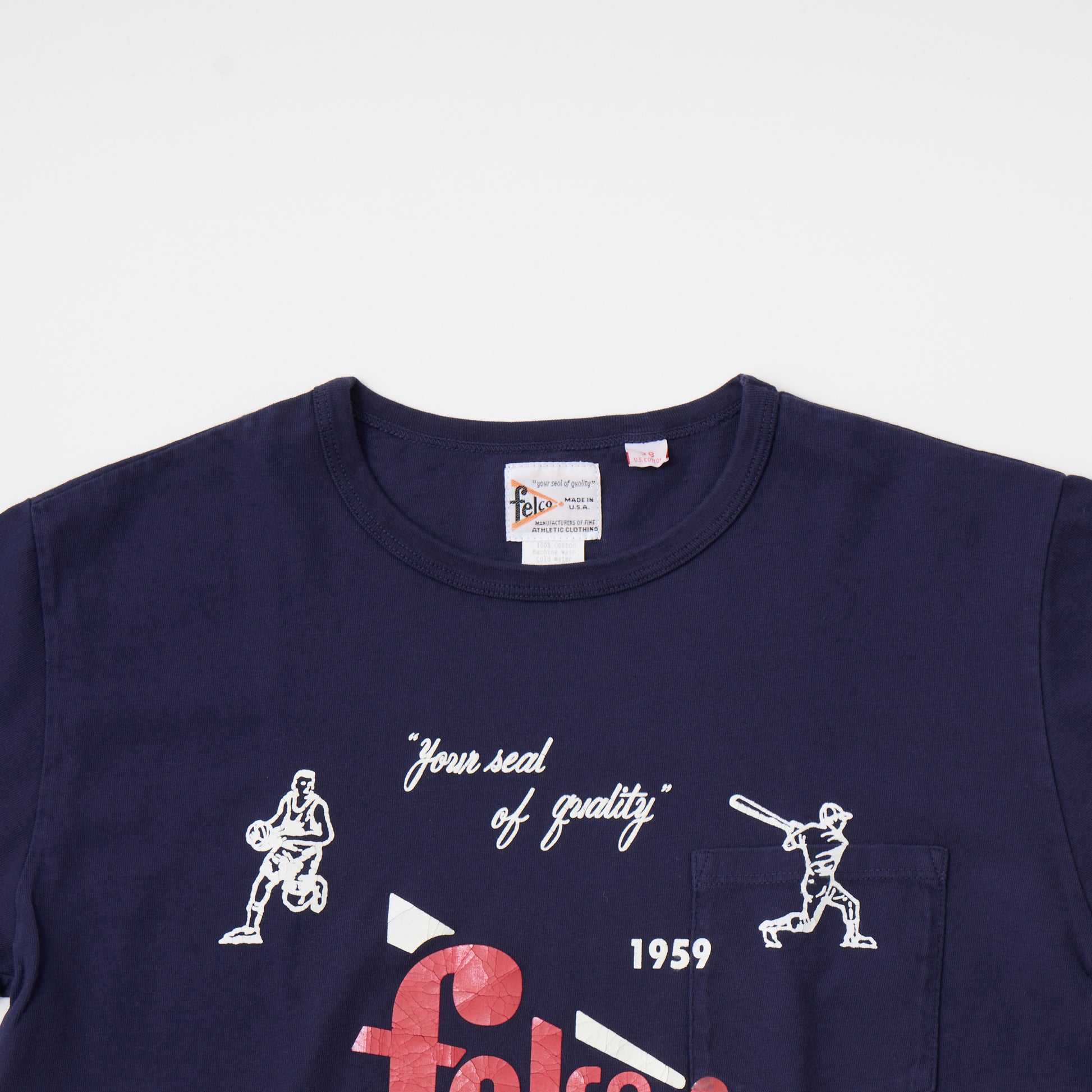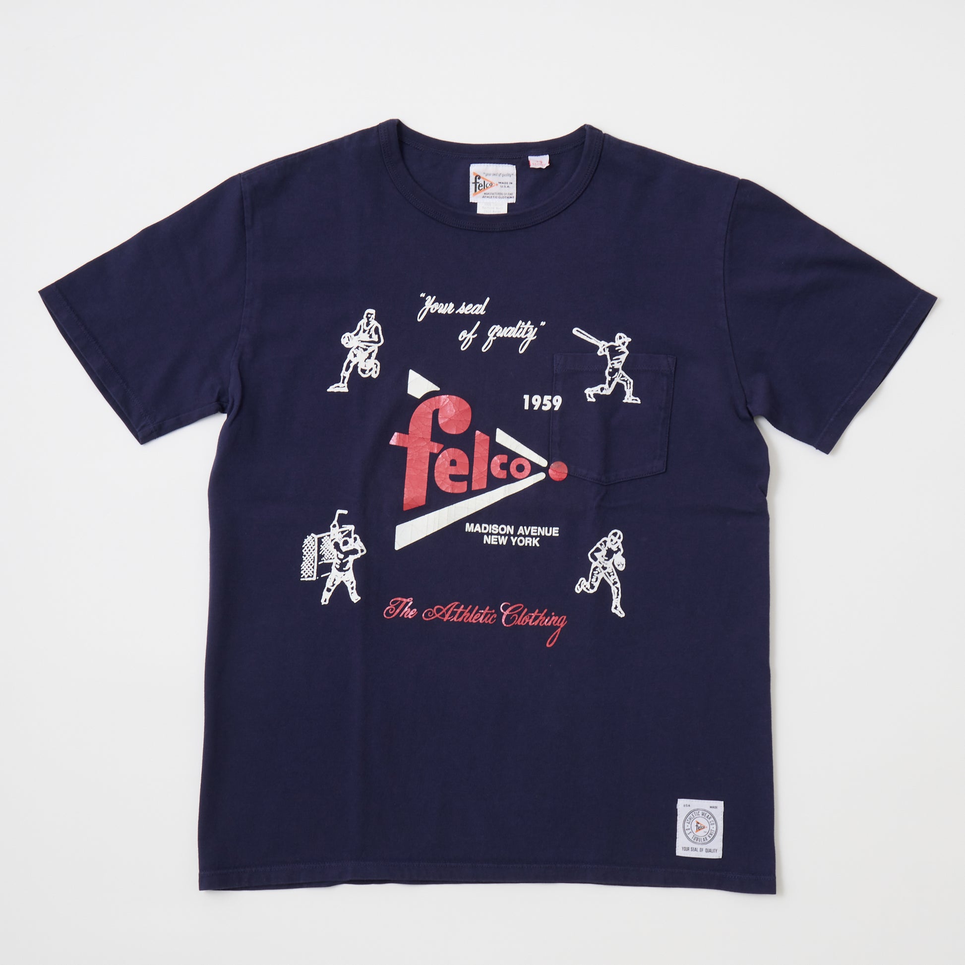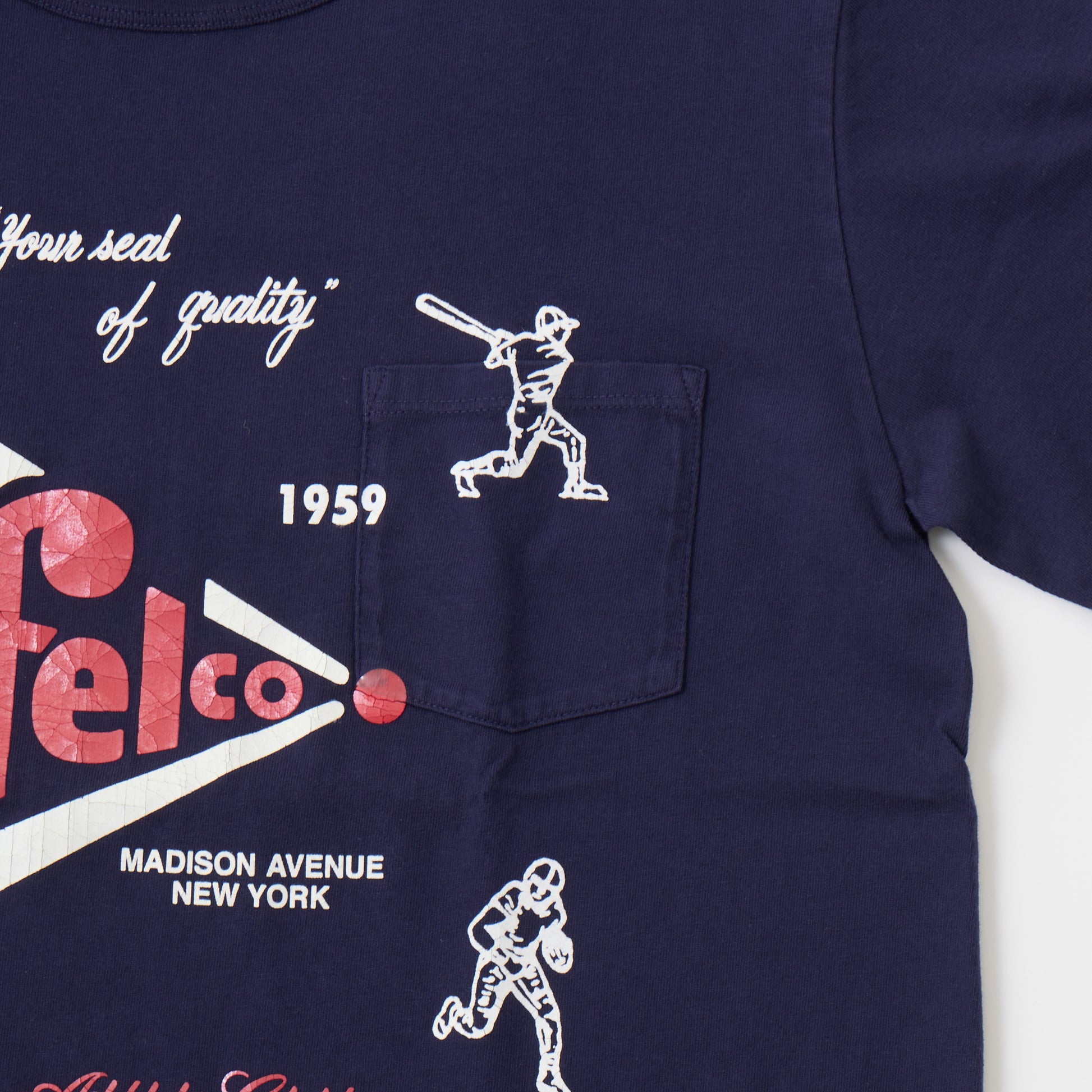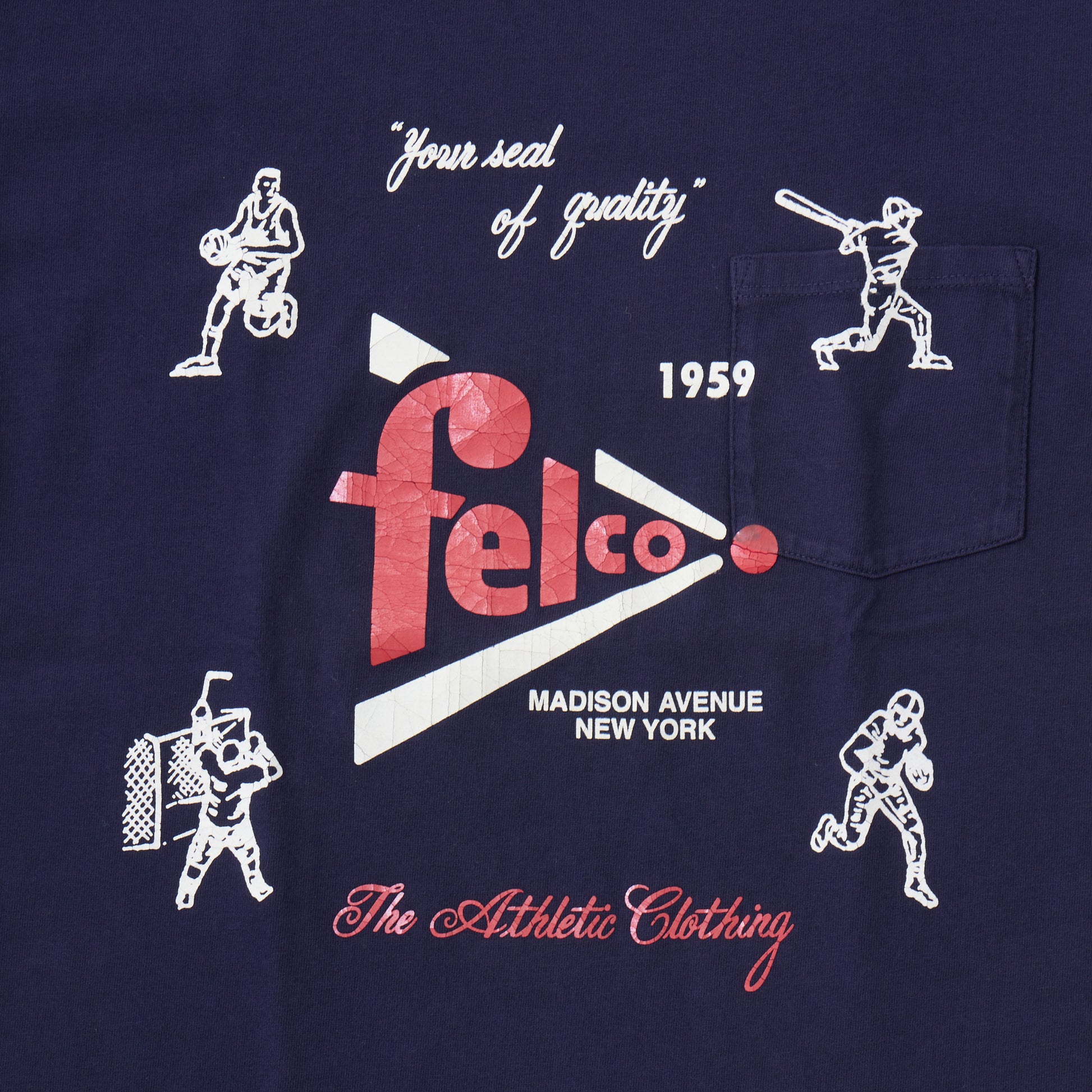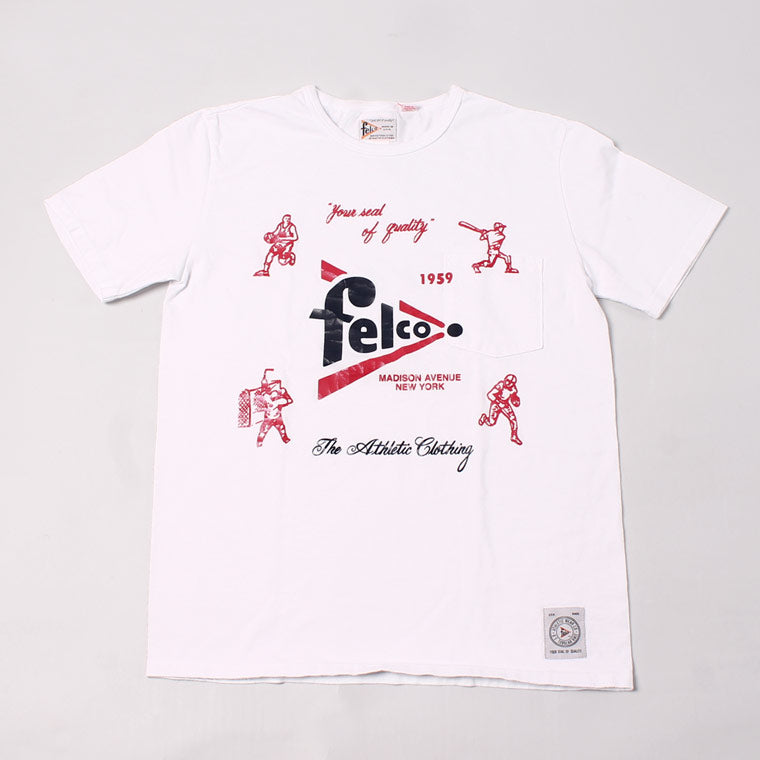 縫い目のない丸胴ボディのアメリカ製のクルーネックポケットT。アスレチックブランドであるFELCOのアイコンとなる野球・アメフト・アイスホッケー・バスケットボールのアメリカ4大スポーツがデザインされていてラバープリントがされている1枚。やや短めの着丈でリラックス感のある、アメリカらしいボックスシルエットが特徴です。年々減少しつつあるアメリカ製というのも大きな魅力。クルーネック部分はバインダーで伸びにくい仕様になっています。ポケットの上からプリントされている珍しいプリントTシャツです。ラバープリントなので経年変化で多少ひび割れた様になるのが特徴のプリントになります。