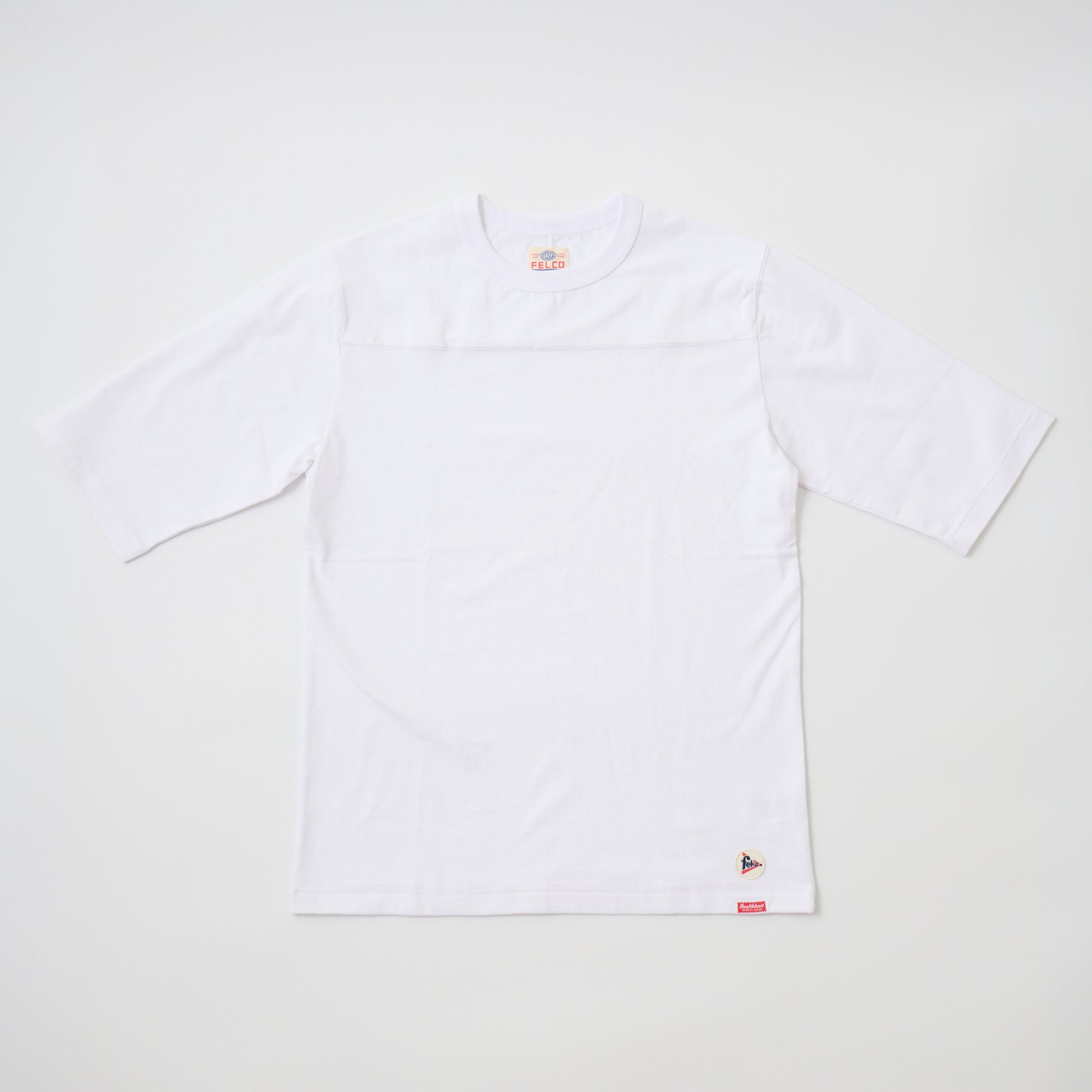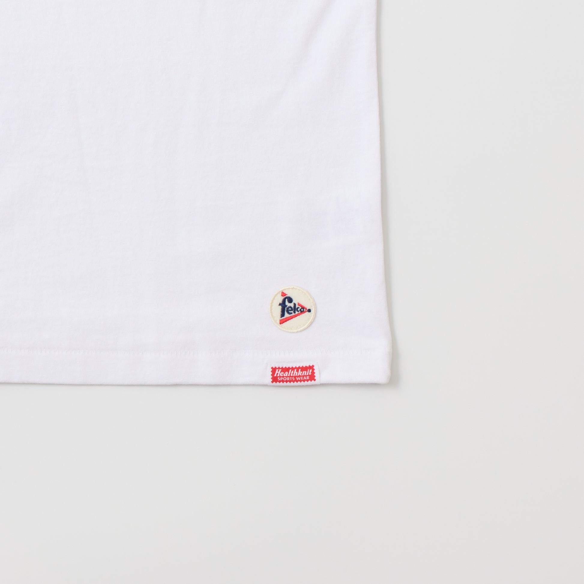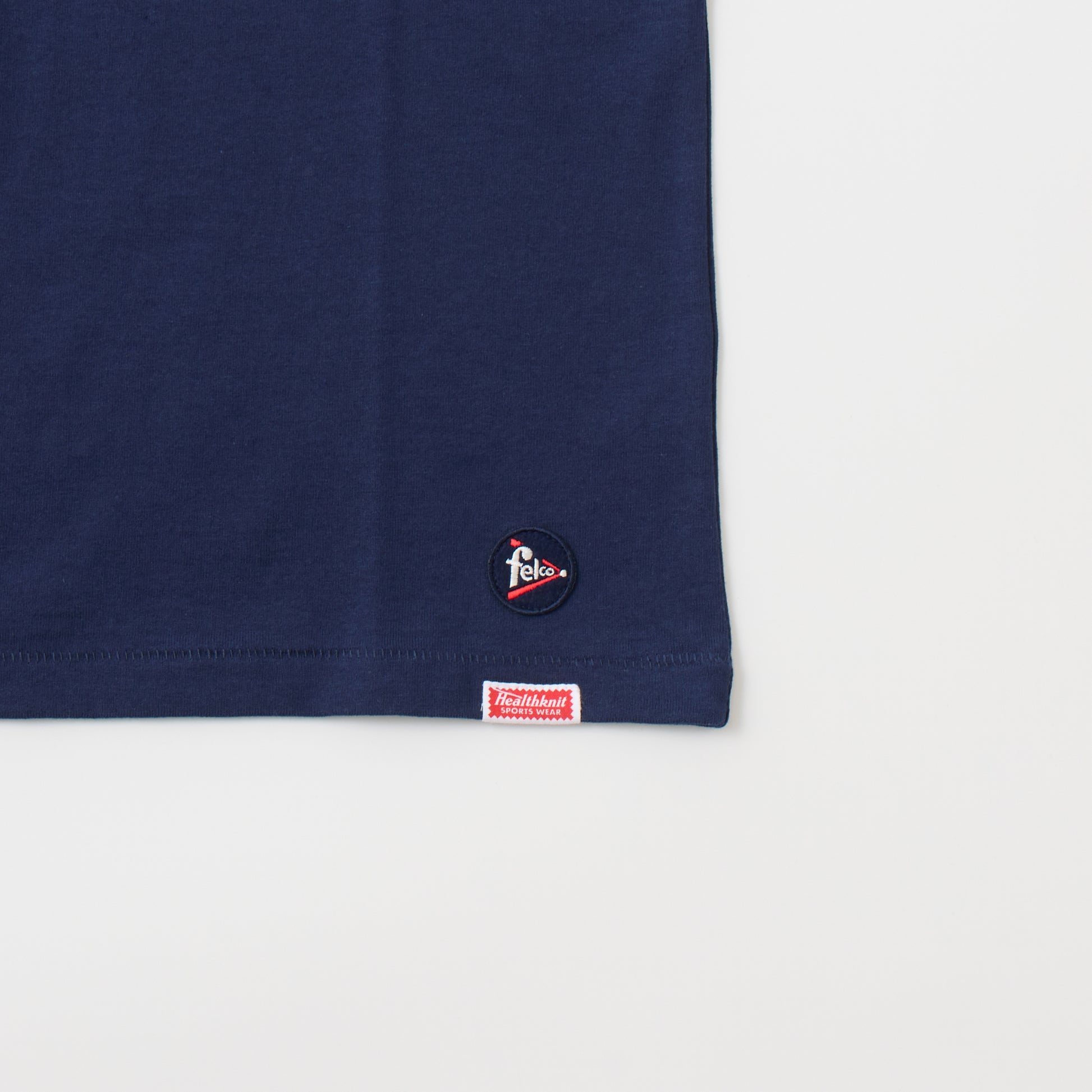 HEALTH KNIT(ヘルスニット)とFELCO(フェルコ)のダブルネームとなるHALF SLEEVE FOOT BALL T OPEN END JERSEY U.S.COTTON。5分袖丈のフットボールジャージーの型を別注したフェルコとのコラボレーションの1枚です。風合いの良いU.Sコットンに抗菌防臭、吸汗速乾にして特注で編み立てた生地を使用。シャリ感のある昔ながらの肌触りの素材。肩に縫い目のないオールドライクなフットボールシャツのデザインは体にフィットするように考え抜かれています。左裾に付けられたFELCO(フェルコ)のワッペンととヘルスニットのタグがちょっとしたアクセントになっています。