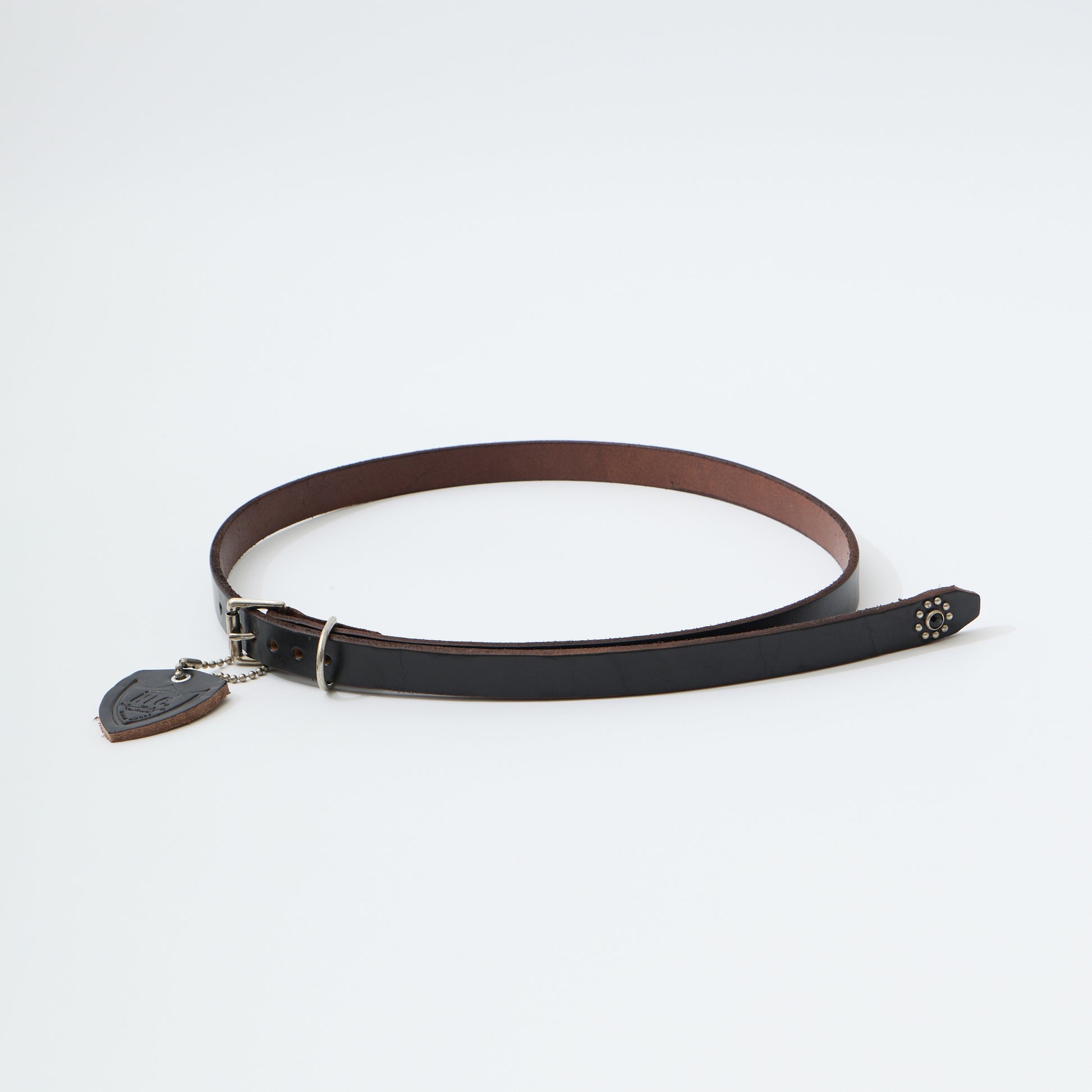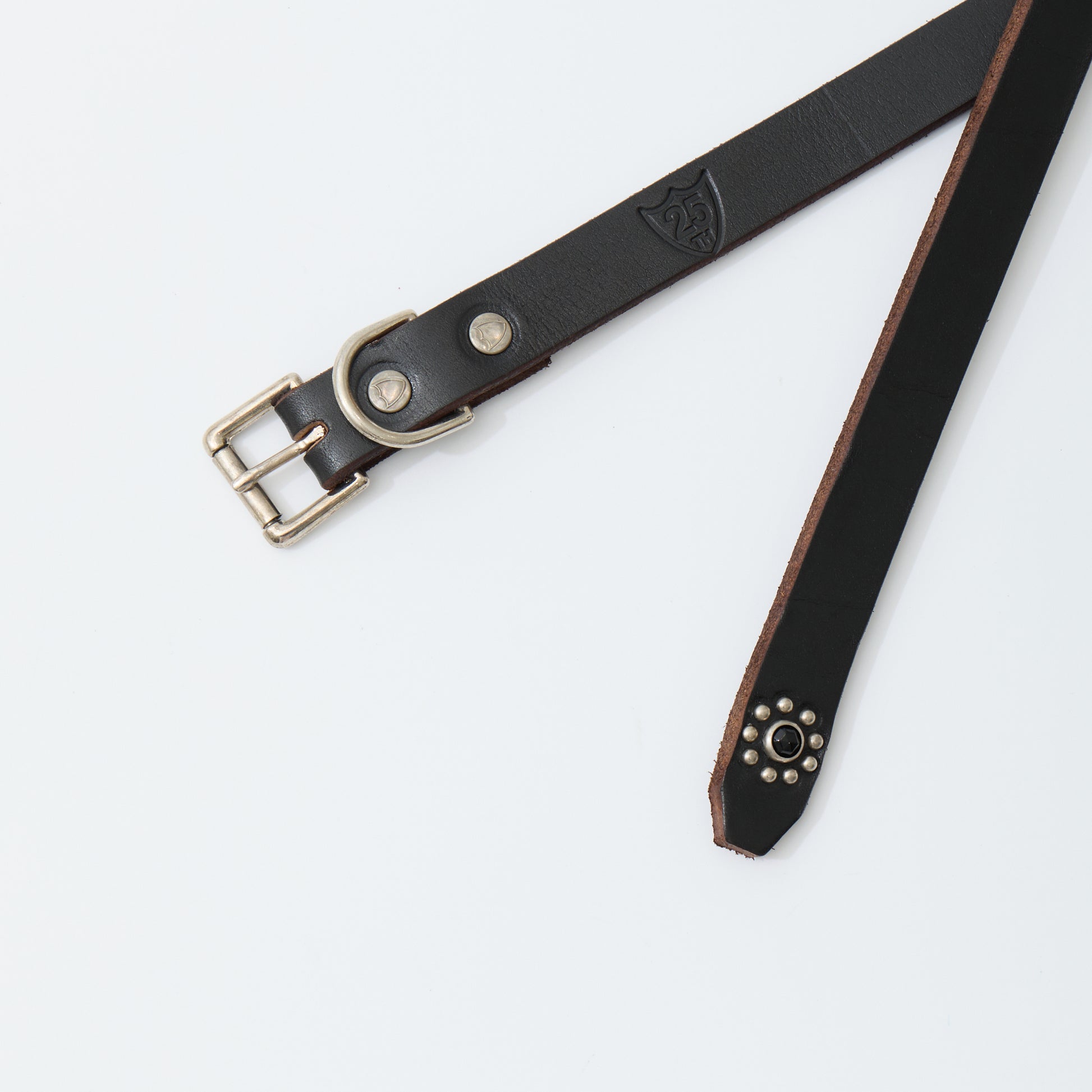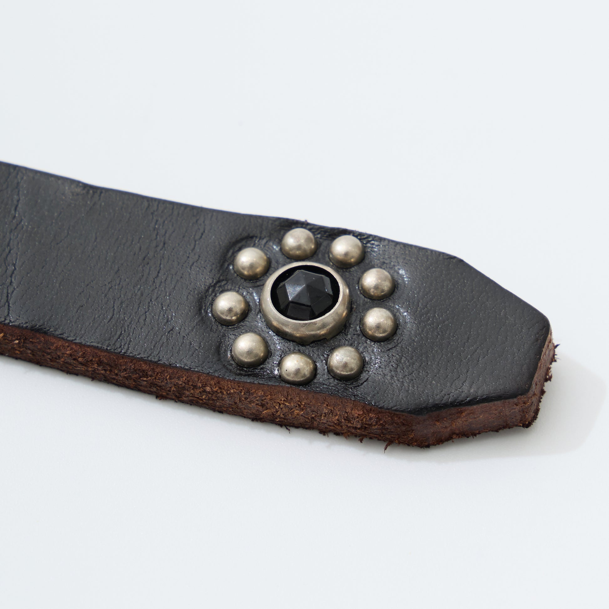 HTC(エイチティーシー)の25TH 1POINT END FLOWER STONE 0.75。0.75インチ幅のブラックカラーのスタッズベルト。エンド部分のみの装飾になりエイチティーシーの中でもシンプルなデザイン。良い意味でインパクトの少ない仕上がりは様々なスタイルとの相性が良く、レザーアイテムならではの経年変化も楽しんで頂ける1本。