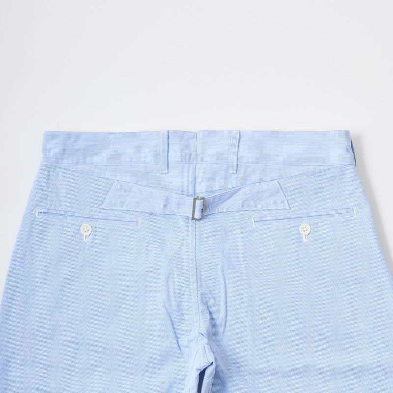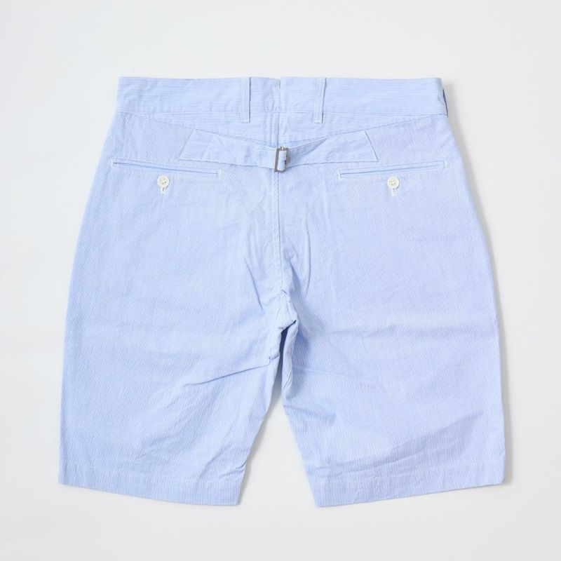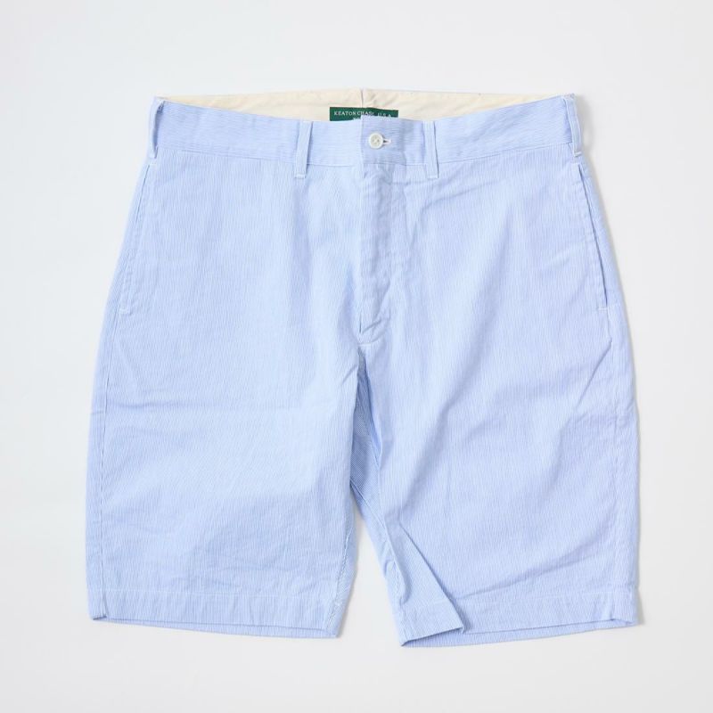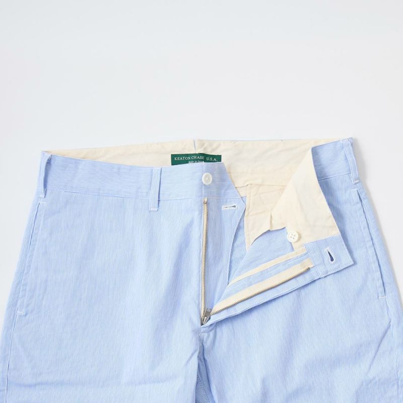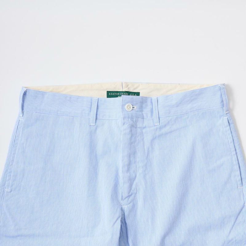 KEATON CHASE USA (キートンチェイスUSA)のBERMUDA SHORT W/BUCKLE BACK HIGH COUNT CORDLANE。日本生産ラインからのリリースとなるバミューダ―ショーツ。細身で裾に向かって緩やかにテーパードされた綺麗なシルエットのショーツ。細身のショーツなのでローファーなどシューズを選ばない使い勝手良いショーツ。前立てはジップフロント、コインポケット、バックシンチ、股のガゼットクロッチが特徴的なディテール。清涼感のあるコードレーン素材が夏らしい軽やかなスタイリングに仕上げてくれます。