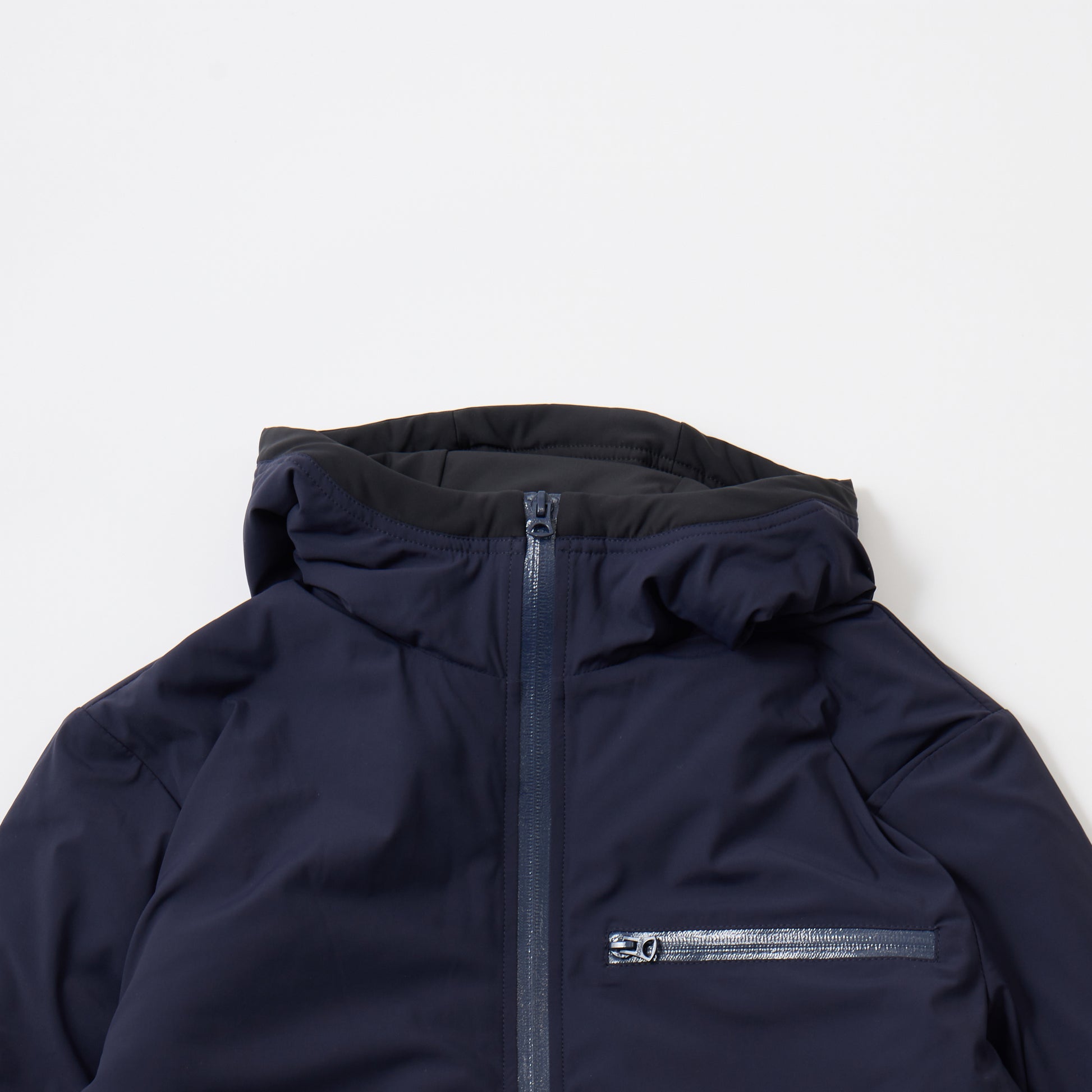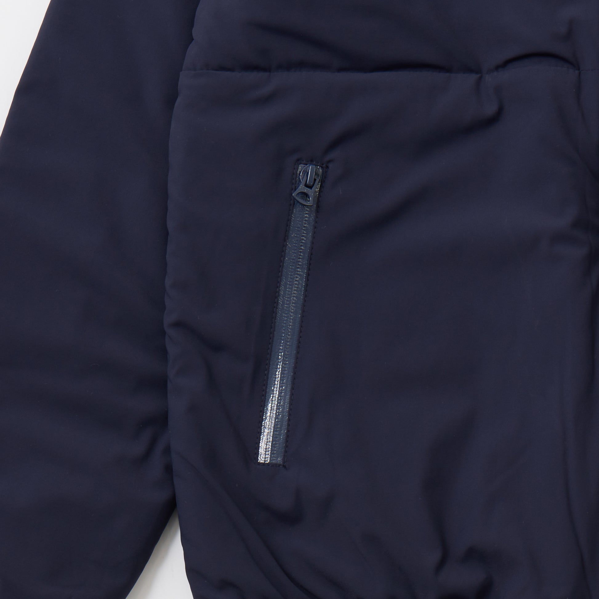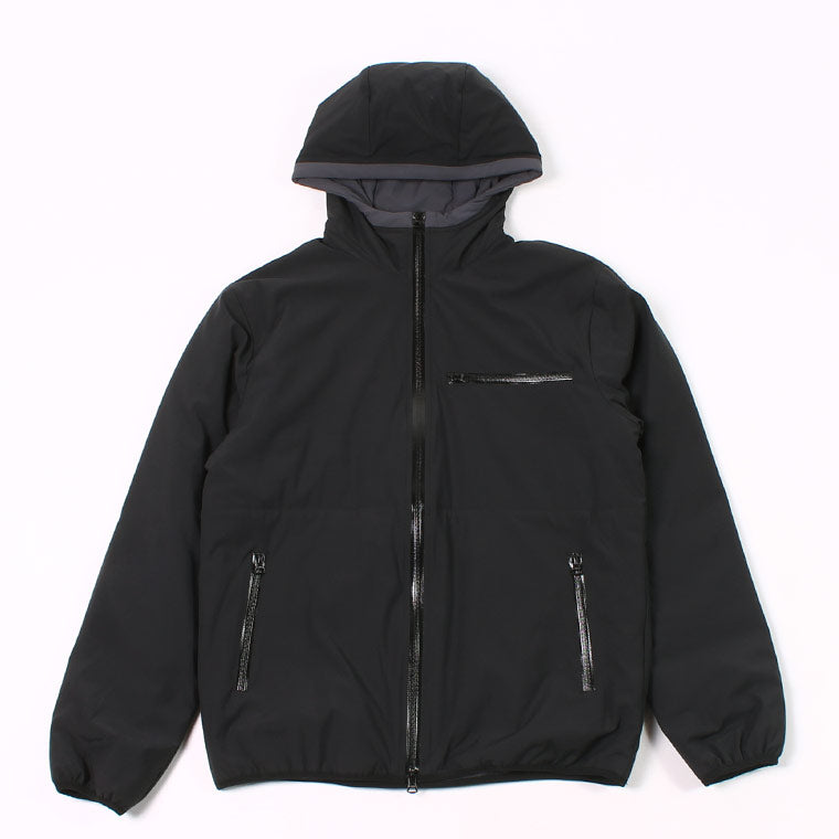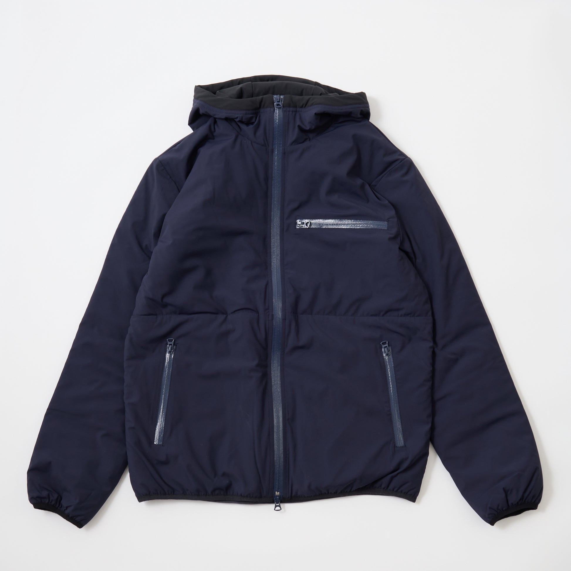 撥水性のあるストレッチナイロンに保温性の高いシンサレート(3M THINSULATE)を中に入れ、フロントとポケットのジッパーにYKK 止水ジッパーを使ったアウトドアー的な魅力のあるブルゾンの1枚です。ストレッチのある素材なので動きやすく多少の雨ならカバーできハイネックジッパーになっているので首まで保温できるのが特徴です。