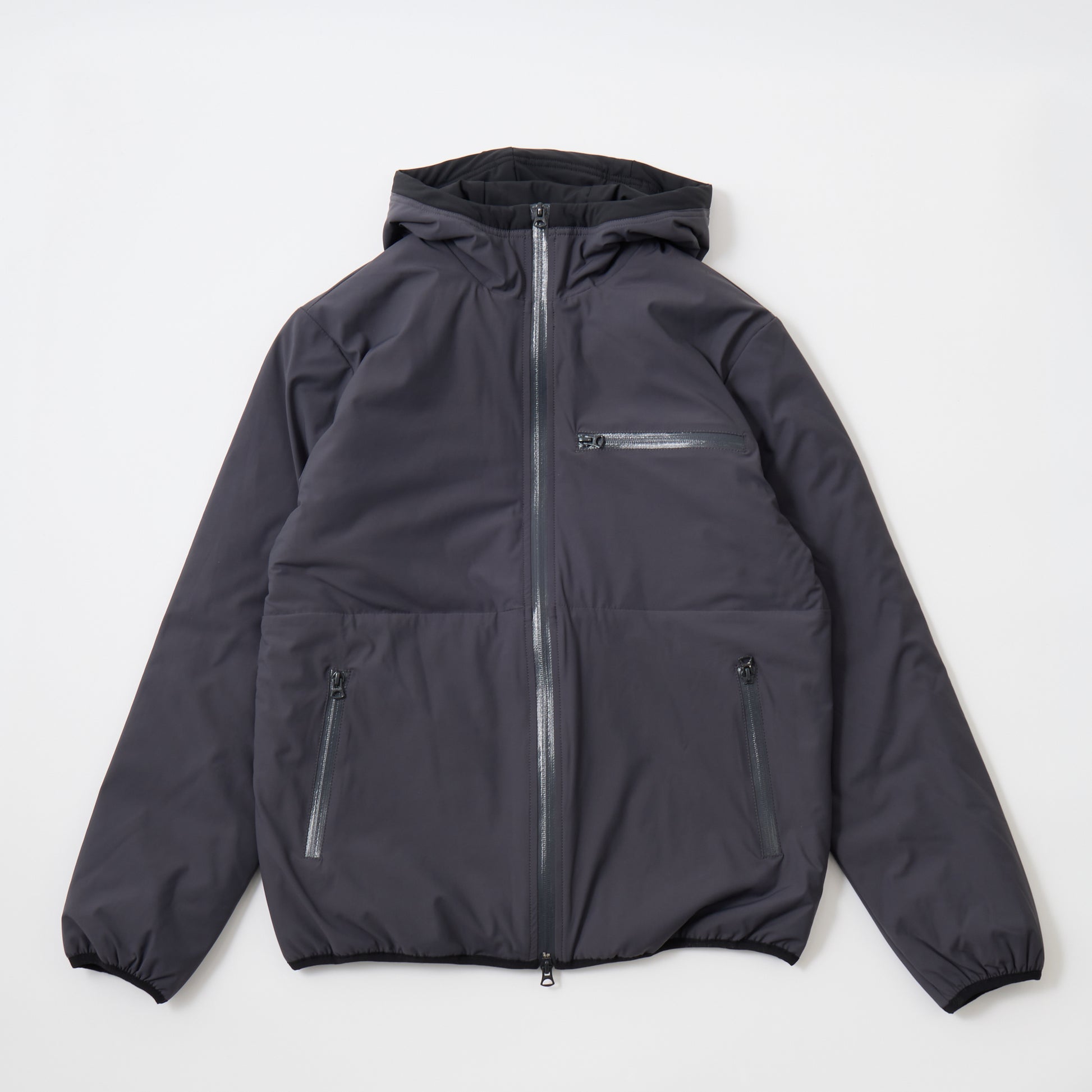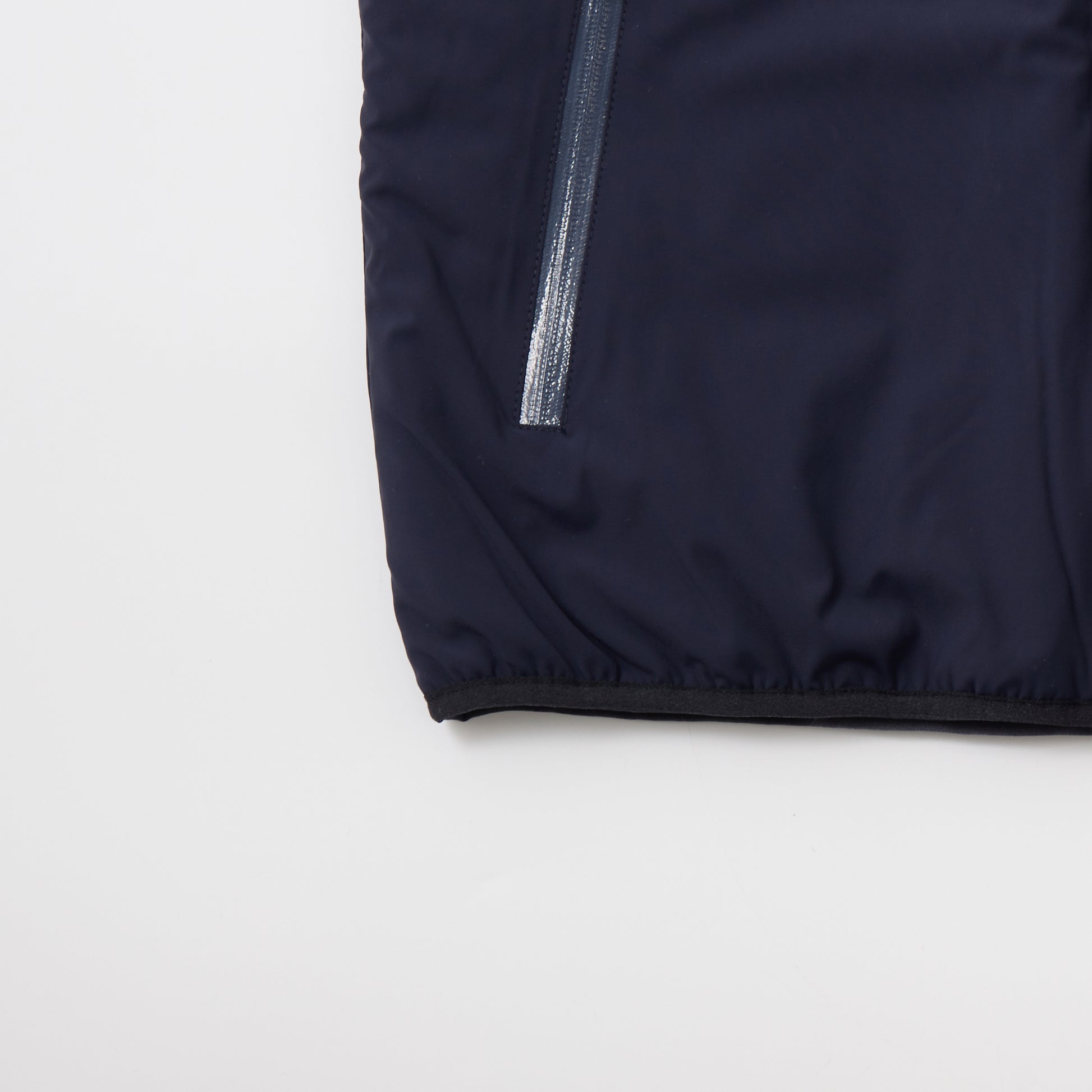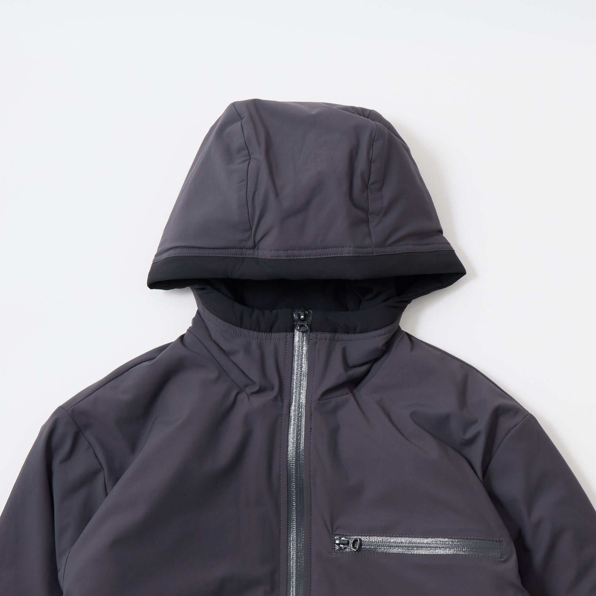 撥水性のあるストレッチナイロンに保温性の高いシンサレート(3M THINSULATE)を中に入れ、フロントとポケットのジッパーにYKK 止水ジッパーを使ったアウトドアー的な魅力のあるブルゾンの1枚です。ストレッチのある素材なので動きやすく多少の雨ならカバーできハイネックジッパーになっているので首まで保温できるのが特徴です。
