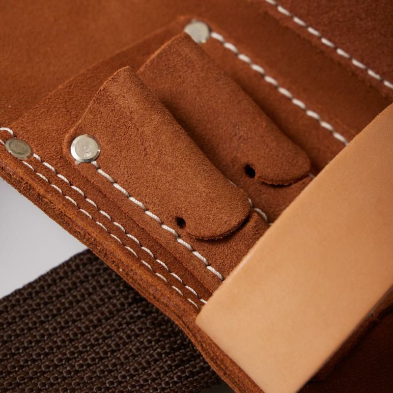 アメリカ発「HERITAGE LEATHER(ヘリテージレザー)」の5POCKET SUEDE NAIL AND TOOL POUCH。ヘリテージレザーを象徴した使い込んだスエードを採用したツールポーチ。ネイル(釘入れ)やメジャー等を入れる3個のメインポケットやプライヤー、ドライバー等の収納が可能なポケットを設置。また筆記用具等を差し込めるサイドポケット、ハンマー差しホルダー1個に装着は簡単にできるメタルフック式などとにかくリアルワーカーが使用しているデザインを取り入れた拘りの詰まった完成度。更には負担のかかる箇所には縫製とリベット止めで補強した頑丈な作りも無骨で男臭くてカッコイイ仕上がりです。