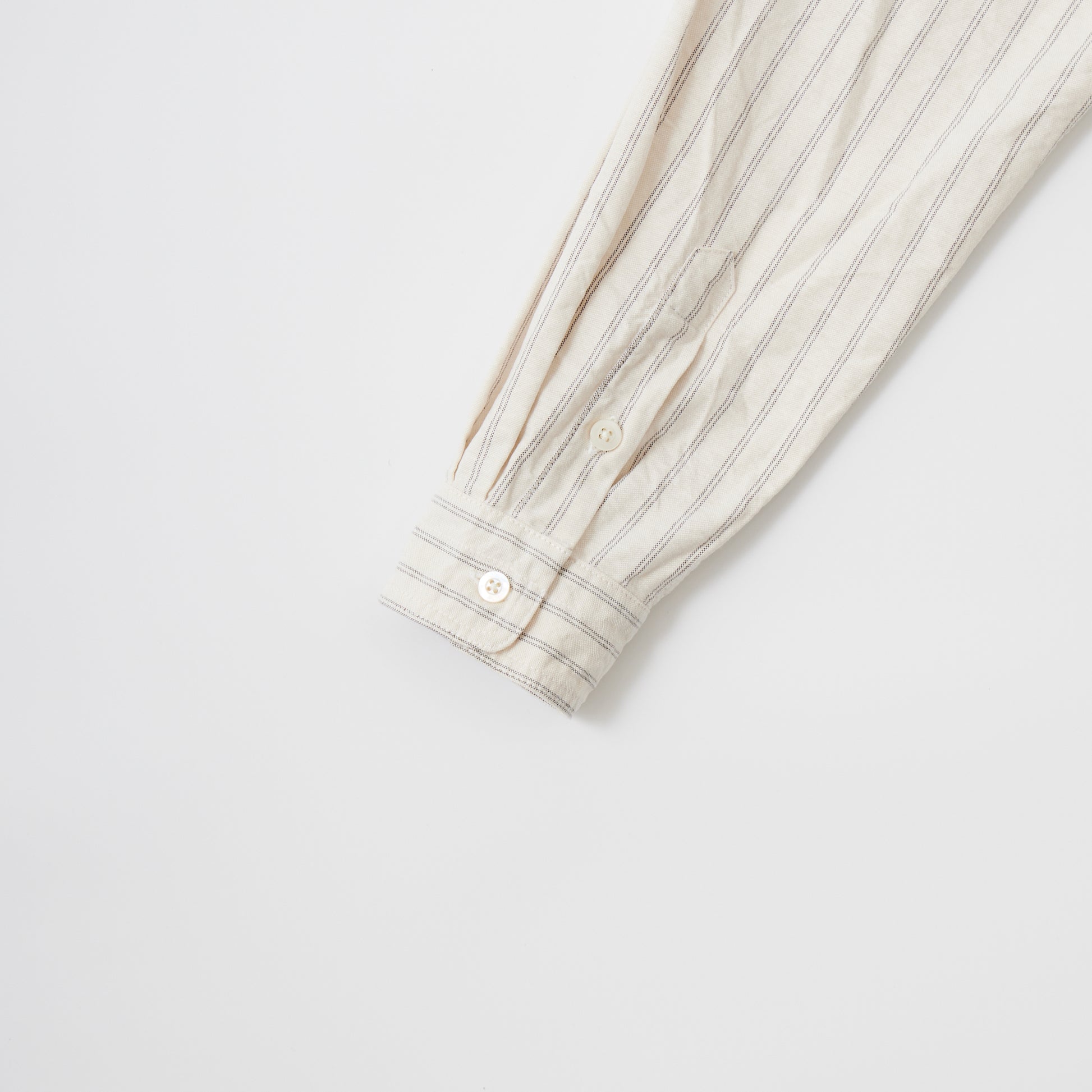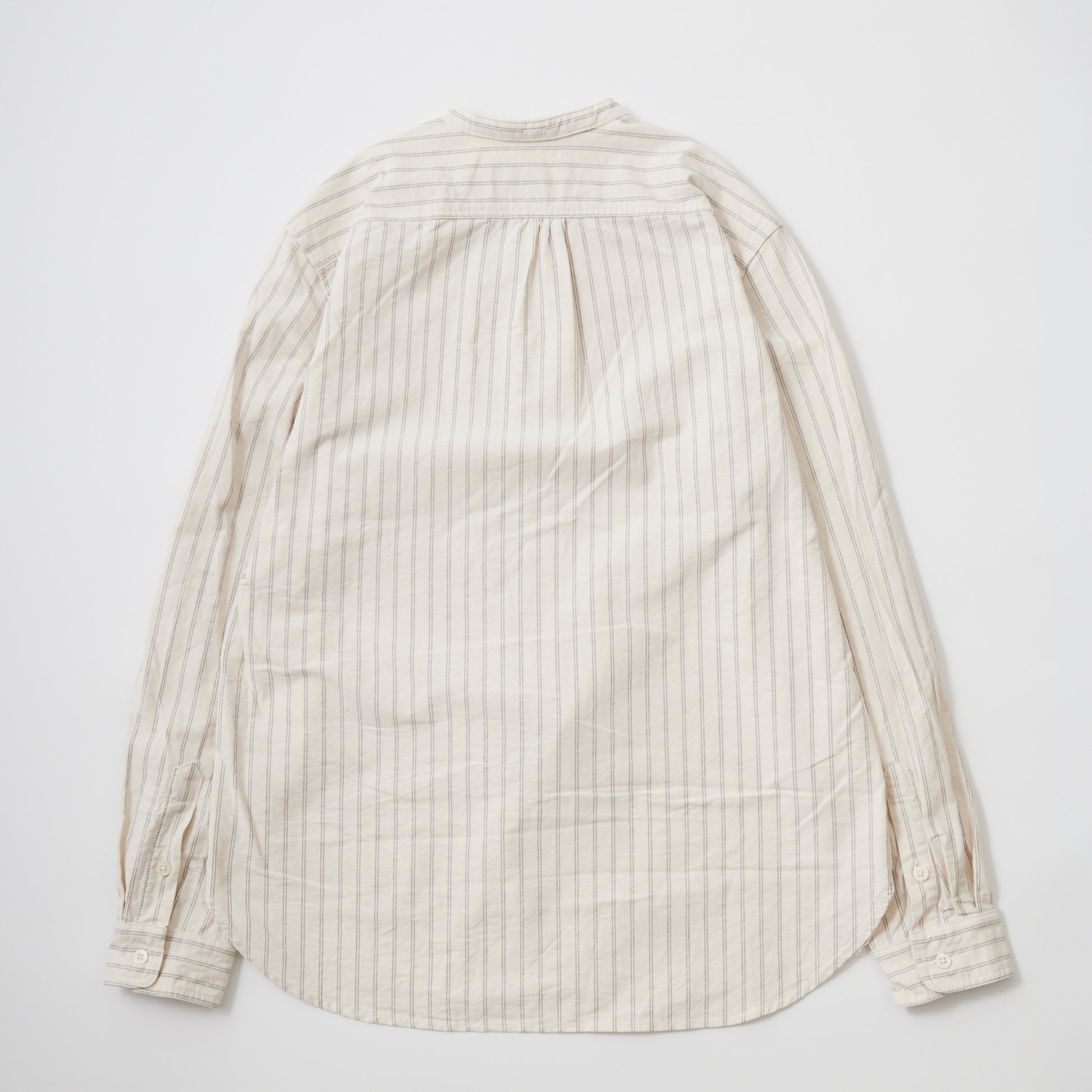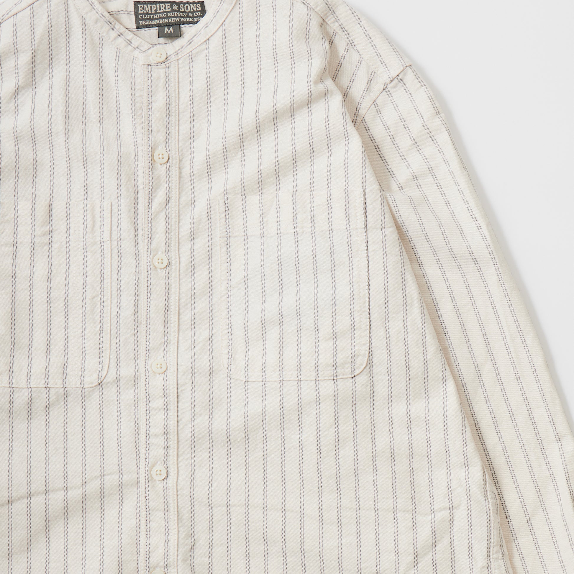 EMPIRE&SONS(エンパアアンドサンズ)のL/S CLASSIC BAND COLLAR SHIRT VINTAGE OXFORD。オックスフォードのストライプ生地を使用したバンドカラーシャツ。クラシックな色合いと風合いを持った絶妙な生地。古いミリタリーのデタッチャブルカラー(取り外し可能な襟)シャツのような低めの台襟に、身頃脇には耐久性に優れたダブルステッチ(二本針)を採用。台襟の後ろに昔の名残ともいえるボタンホールがデザインとして残っています。両胸にパッチポケットを配し、ウエストに絞りの無い、ワークシャツの様なカジュアルなシルエット。着込むことで経年変化も楽しんで頂ける1着。