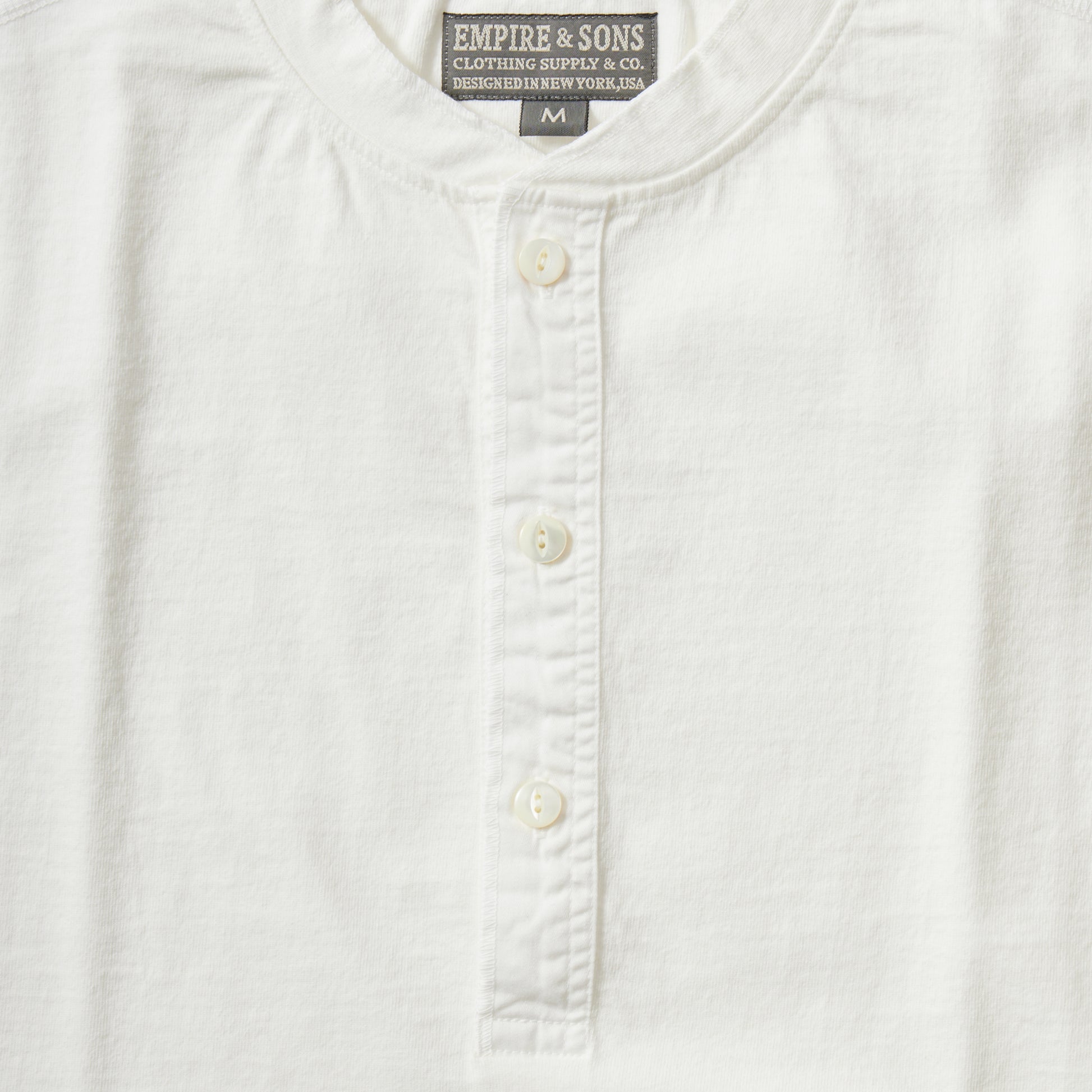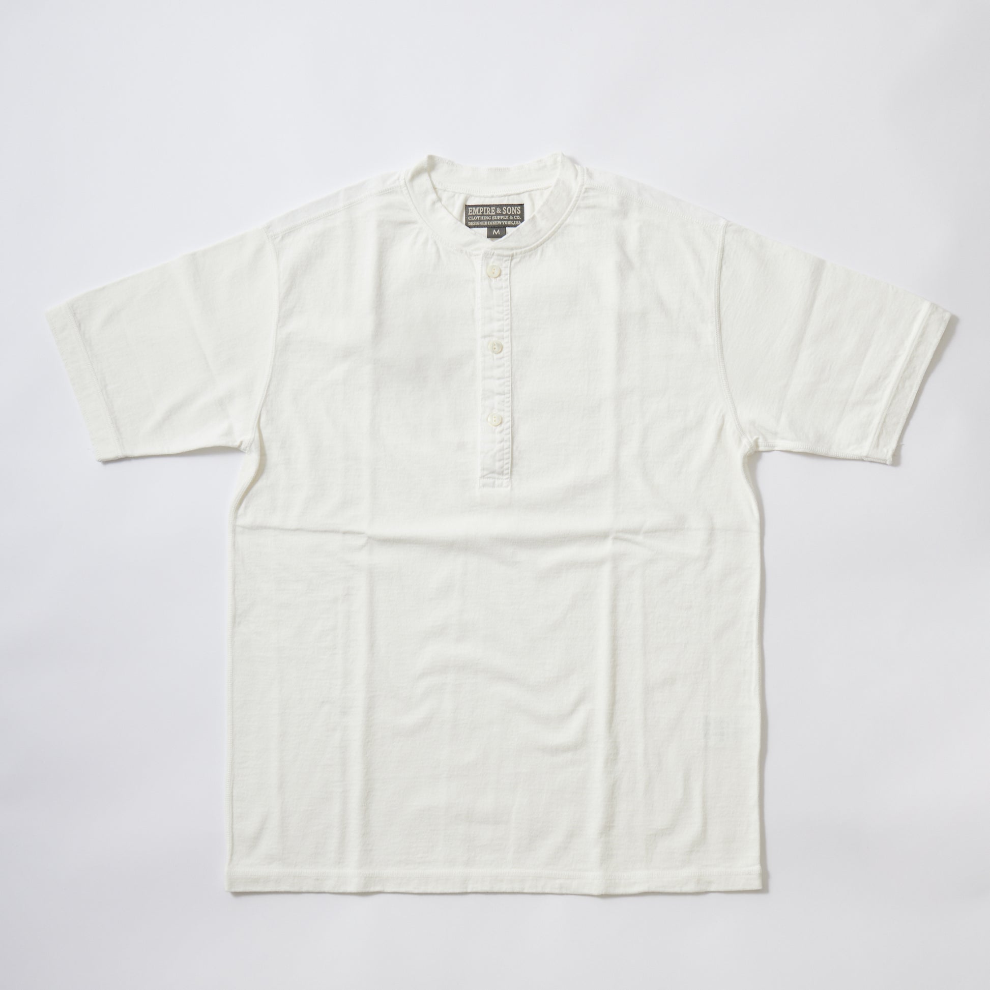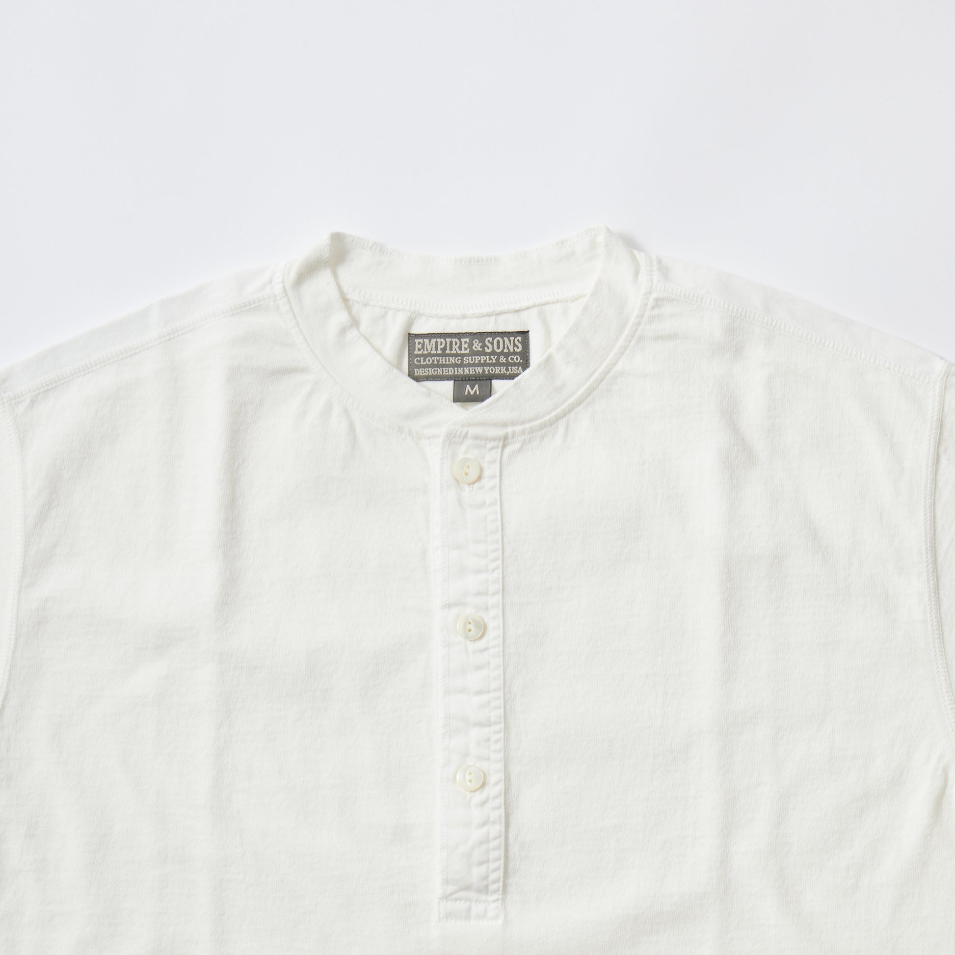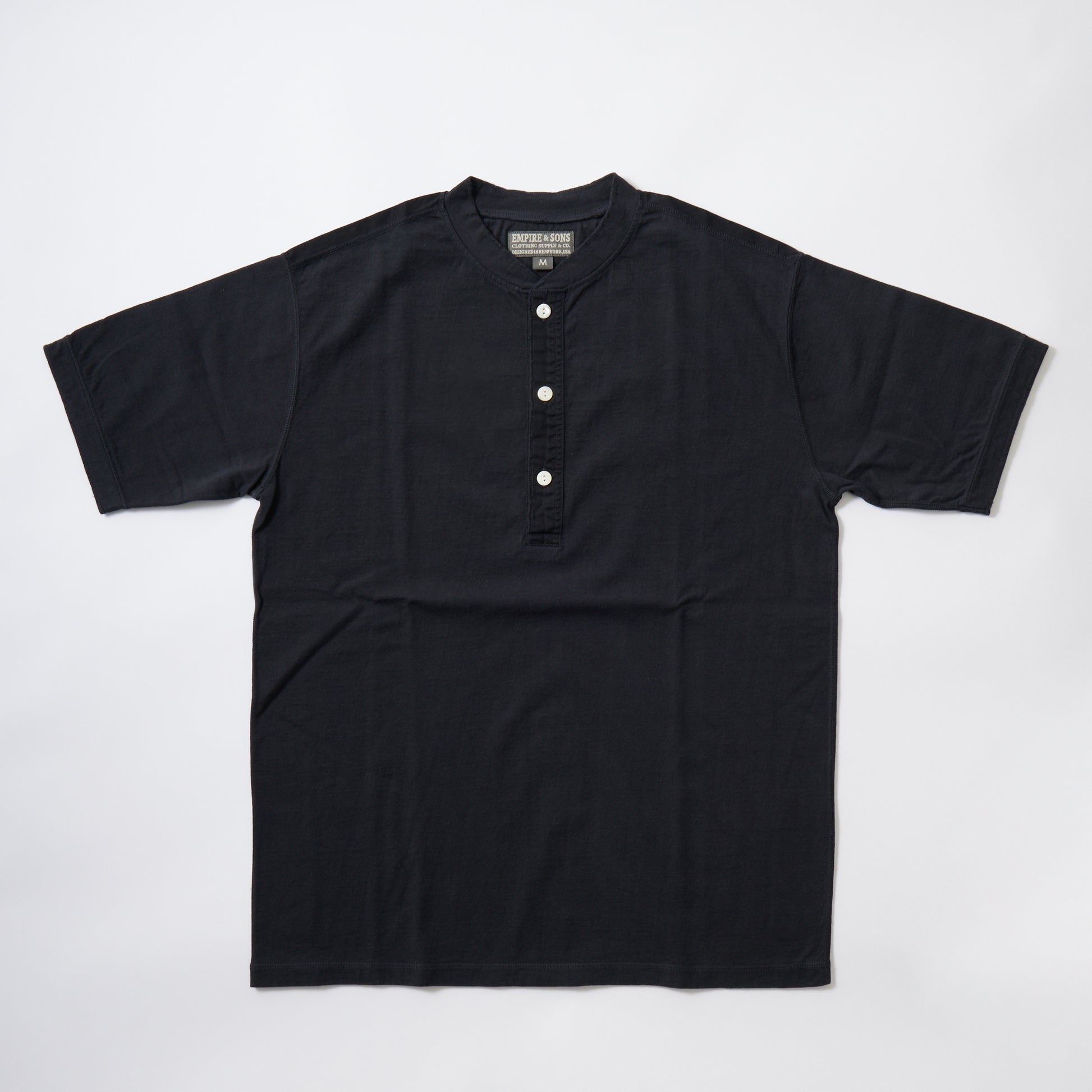 EMPIRE&SONS(エンパイアアンドサンズ)のS/S COALMINER HENLEY 16 RAFFI JERSEY。旧きよき時代のアメリカの炭鉱夫が好んで着用していたヘンリーネックTシャツ。ヘヴィウェイトでスラブ感のある生地を使用。ボタンはクリアーカラーの猫目ボタンを使用してクラッシックな雰囲気。フロントのヘンリー部分はジャージー素材ではなく、伸び縮みしない布帛(ふはく)に切り替えられています。フラットシーマーによる縫製で縫い合わせの部分の凹凸が少なく着心地も抜群。立ち襟タイプの縫製及び袖口の縫製は、秀逸な1枚。