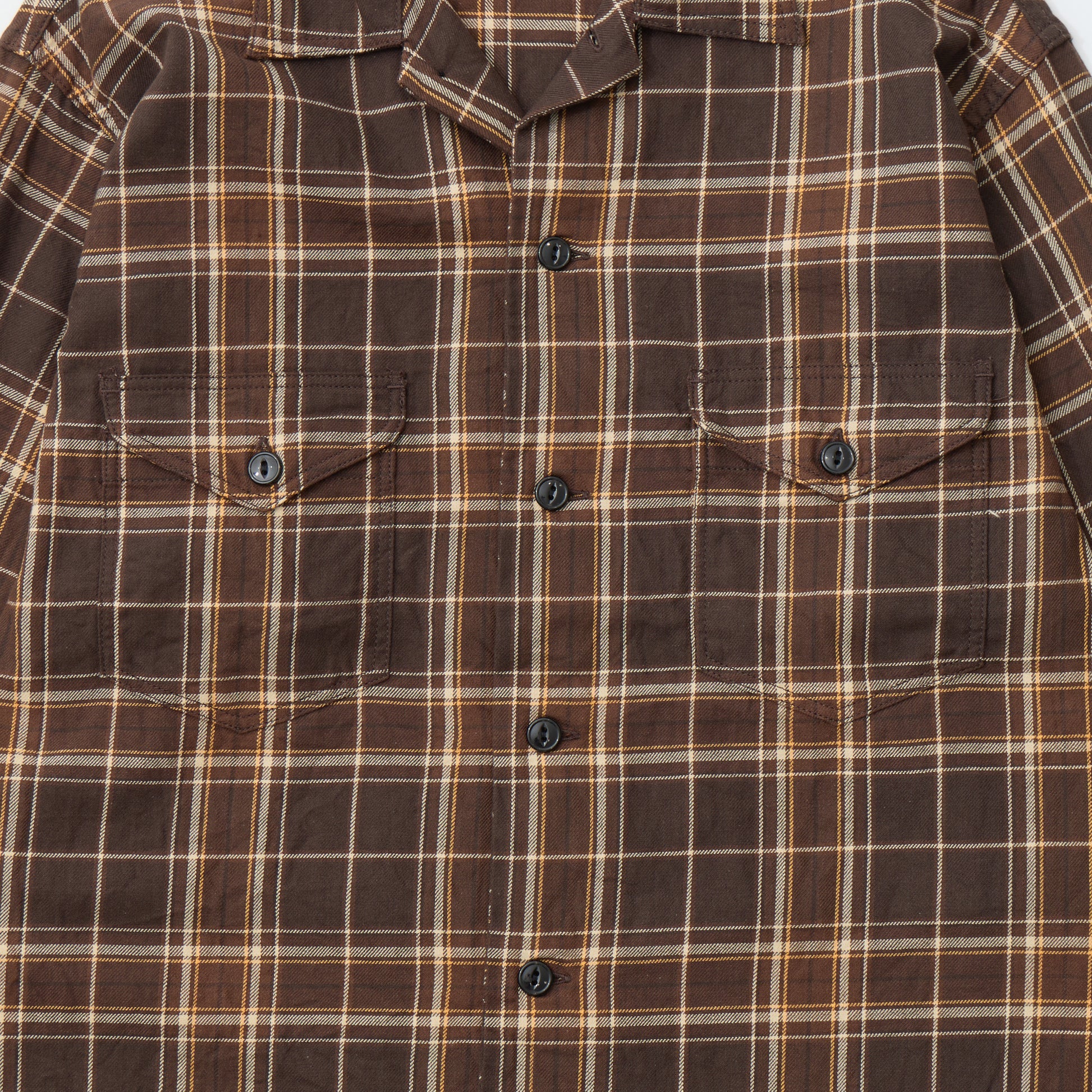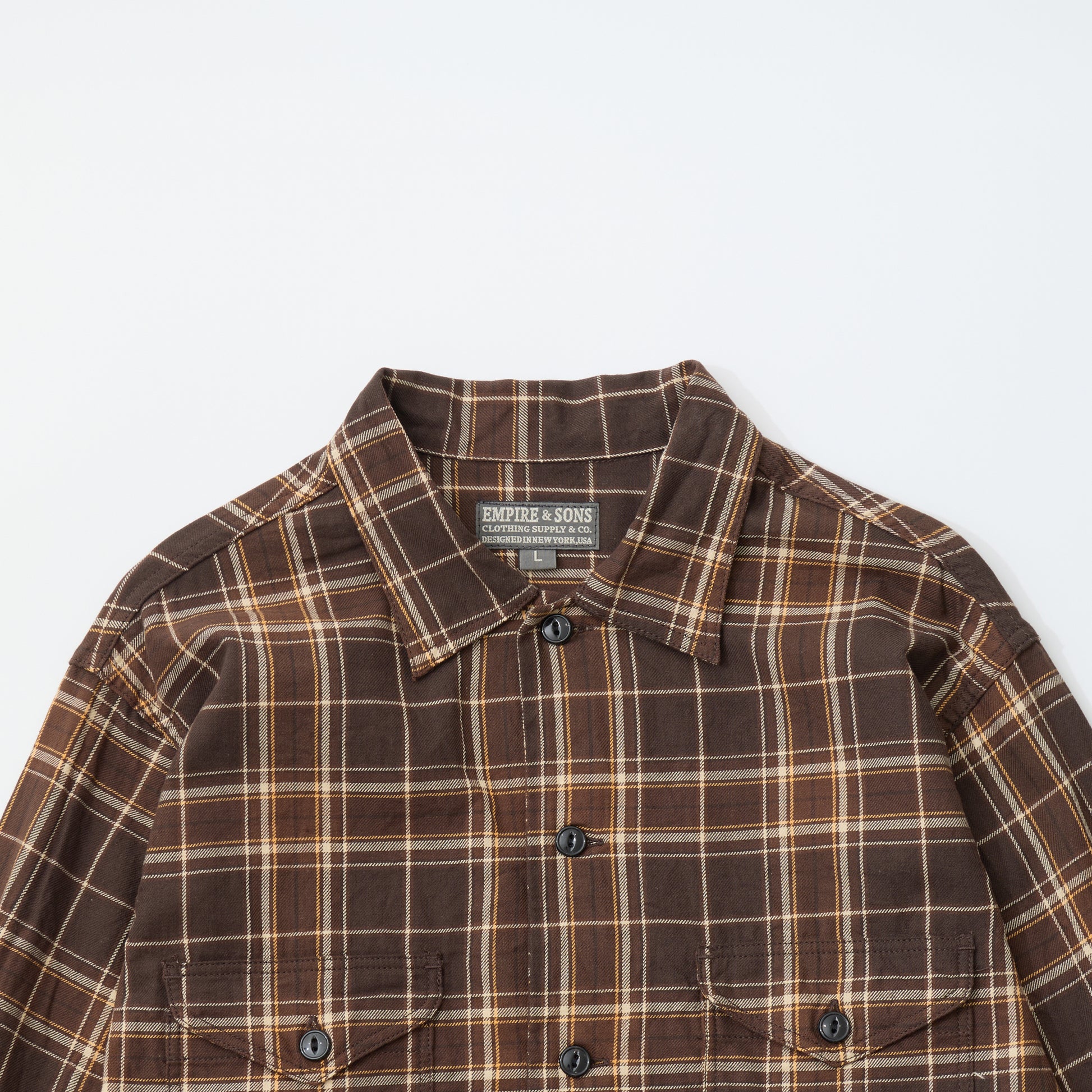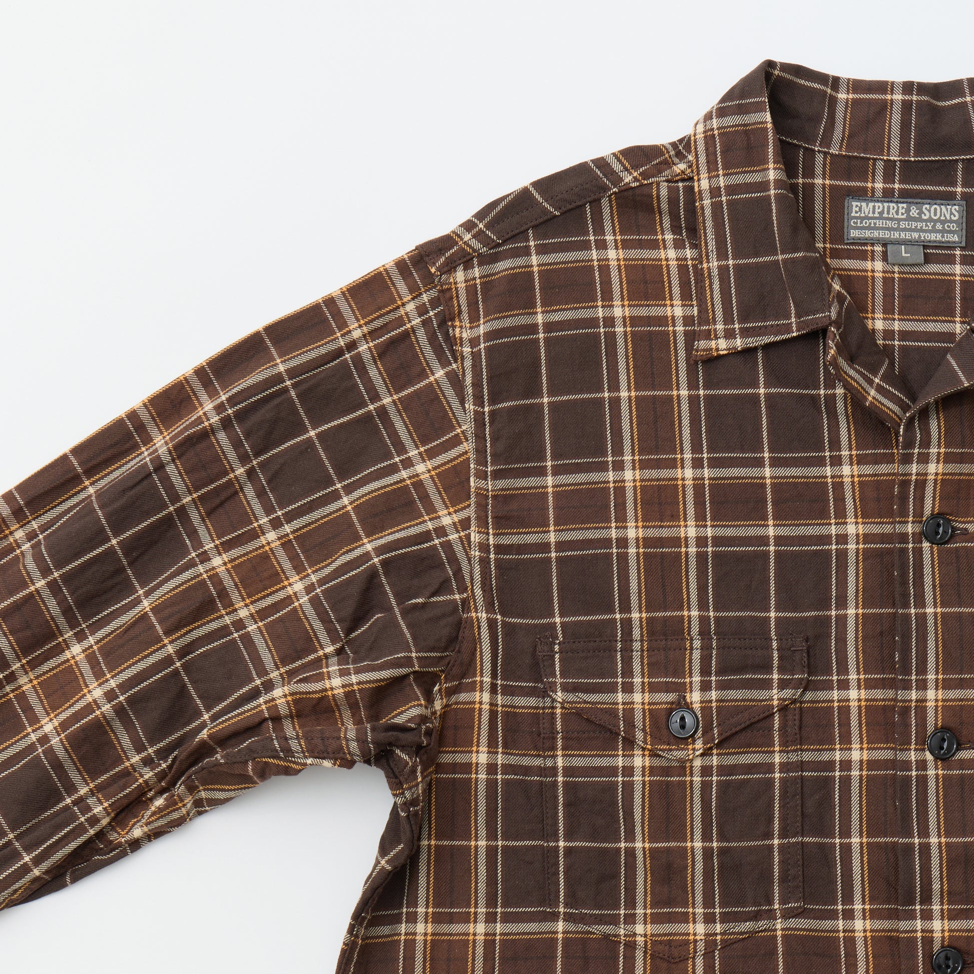 EMPIRE & SONS WORK SHIRT JACKET - COTTON TWILL CHECK - DK BROWN / NATURAL / YELLOW. This shirt jacket is made from a lightweight cotton twill check fabric. It features a large, classic-style collar, flap patch pockets on both sides of the chest, cuffed sleeves, and side slits at the hem.