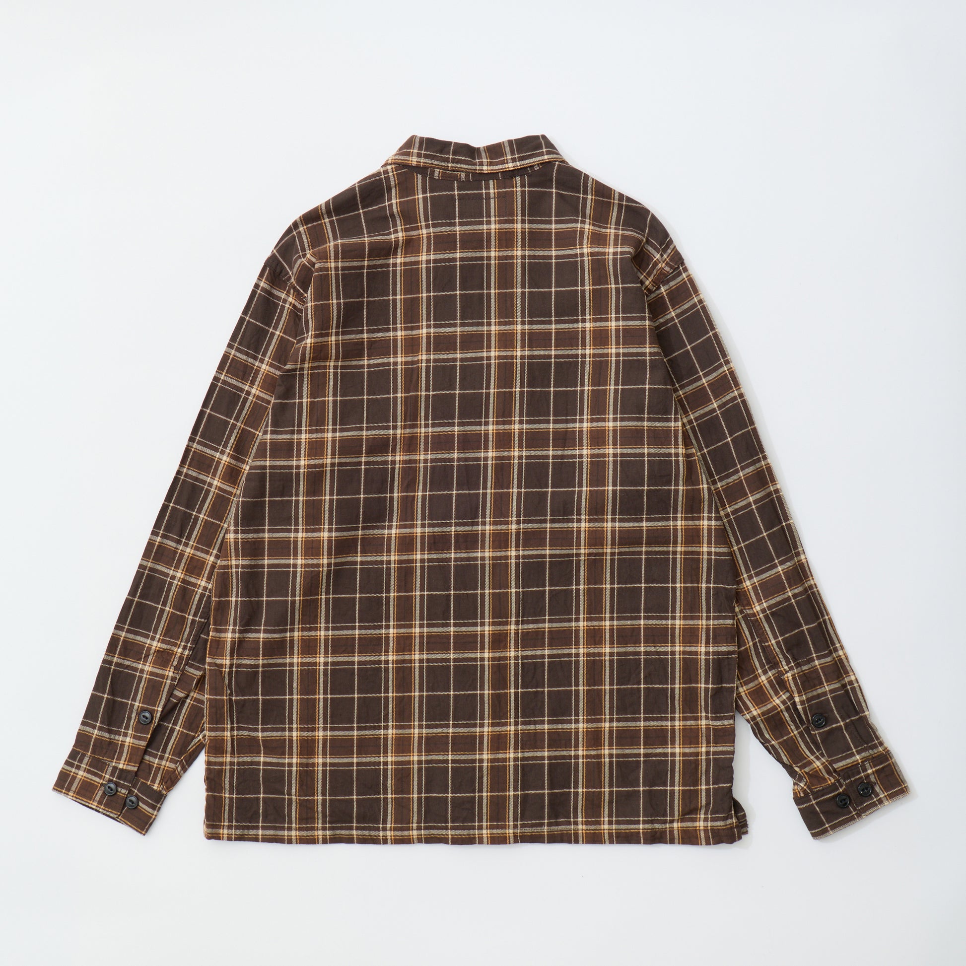 EMPIRE&SONS(エンパアアンドサンズ)のWORK SHIRT JACKET - COTTON TWILL CHECK - DK BROWN_NATURAL_YELLOW。軽めのコットンツイルのチェック柄を使用したシャツジャケット。クラシックな雰囲気の大きめの襟。左右に配置されたフラップ付きパッチポケット。袖口はカフ仕様。裾の両サイドにスリット付き。