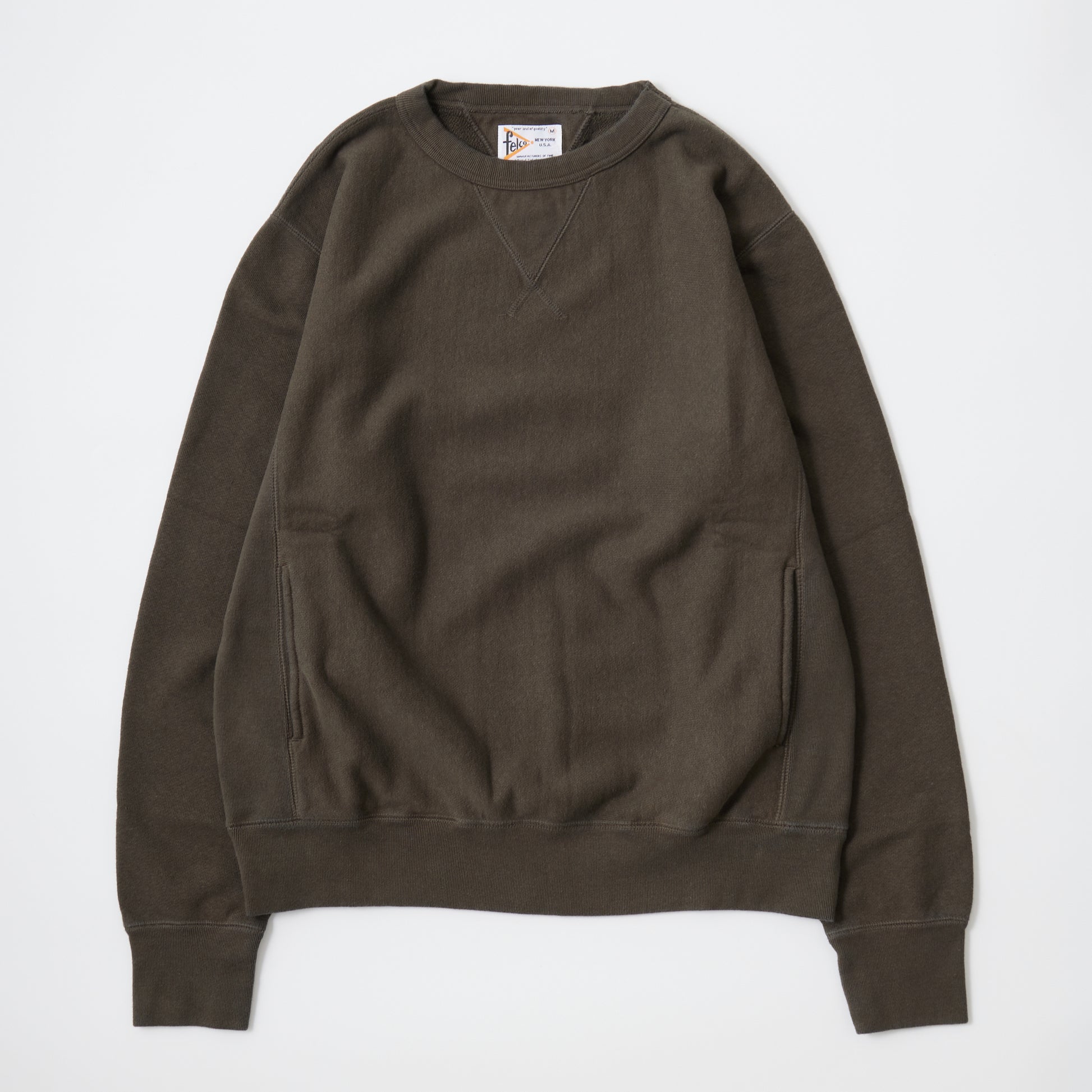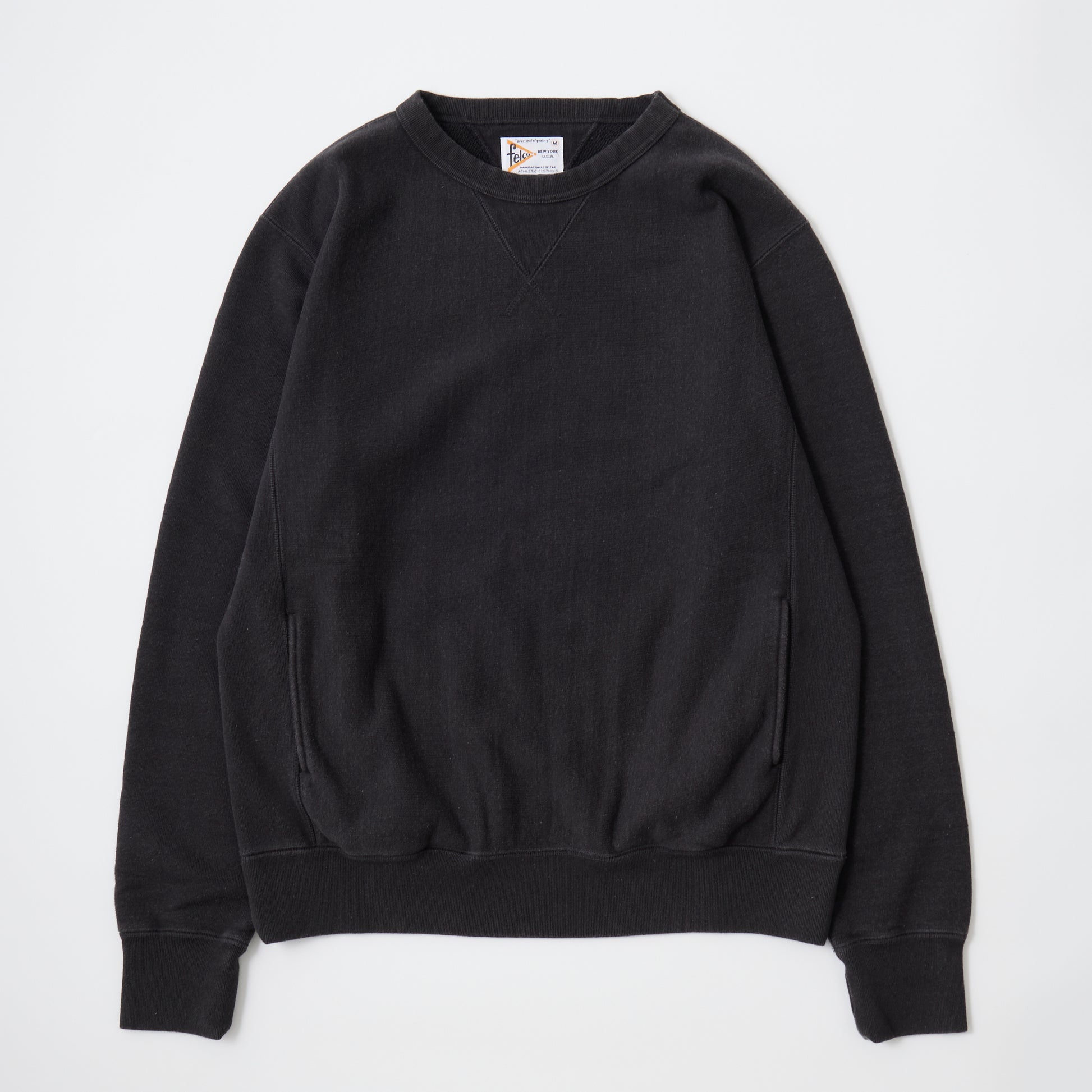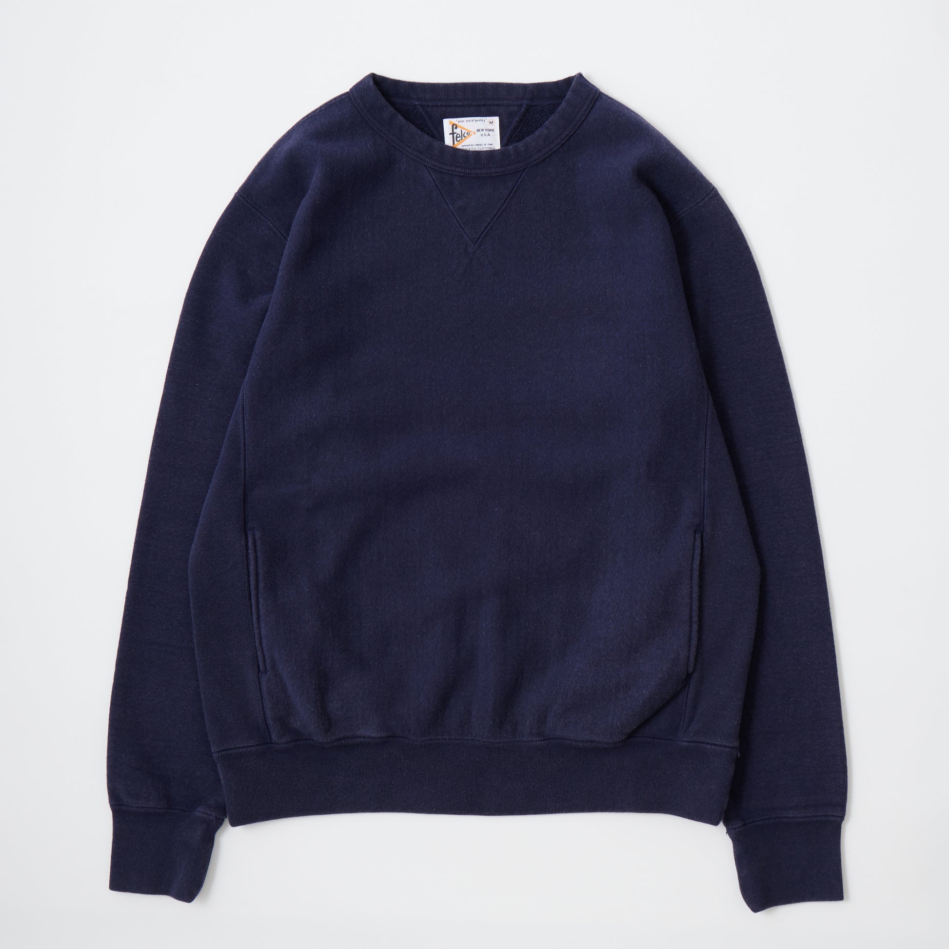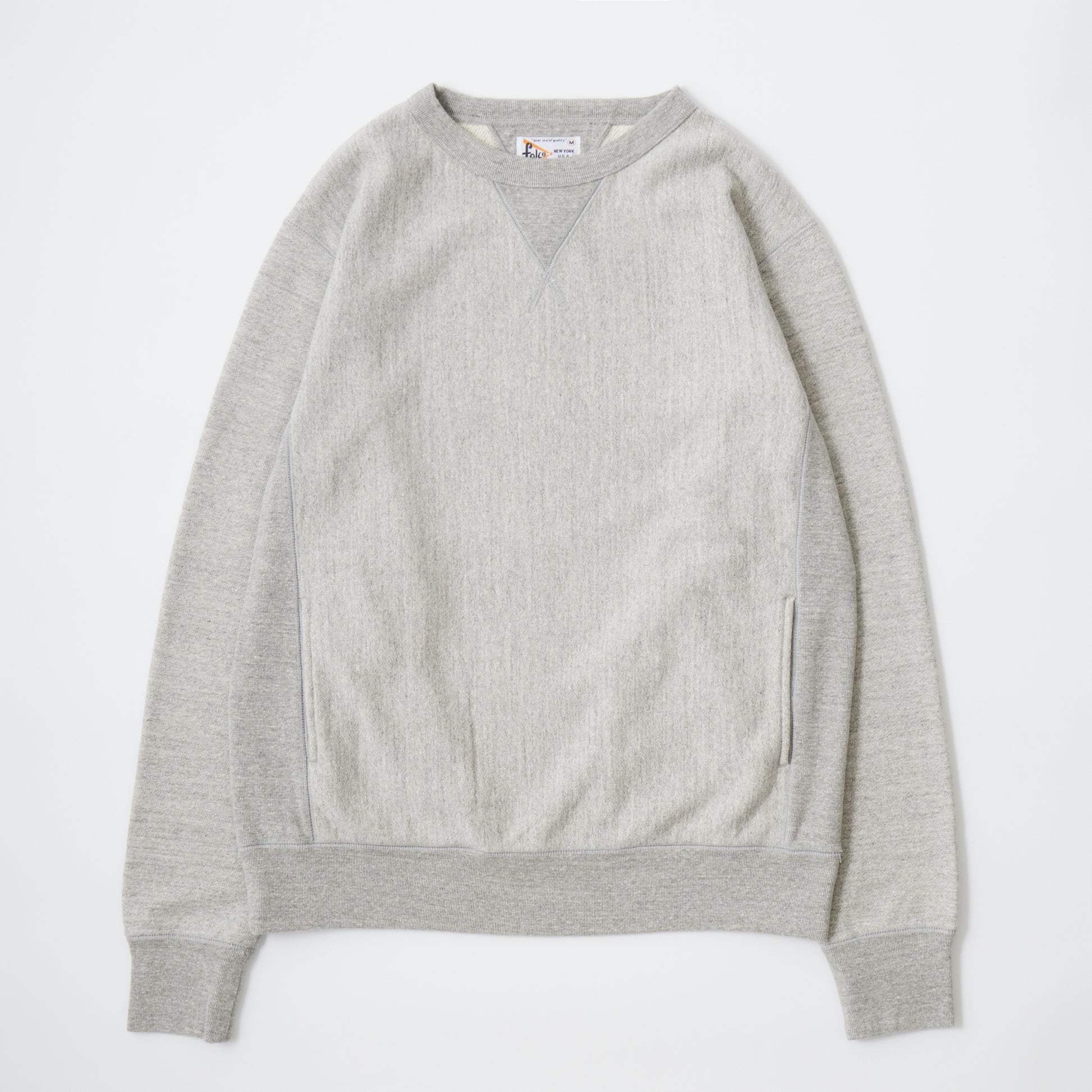 FELCO(フェルコ)の16oz TERRY CLASSIC FIT INVERSE WEAVE DOUBLE V GUSSET SET IN CREW SWEAT W/SLASH POCKET。独自で開発した16オンスの厚みとコシのある生地を使用した両Vガゼットクルーネックスウェット。生地を横向きに使用することで縦縮みを軽減し、サイドリブが横縮み防止と動きやすさを実現しています。ガシガシ着倒してもへこたれないタフな1着。袖と裾のリブはやや長めに設定されたヴィンテージを彷彿させる完成度。やや下辺りにハンドウォーマーポケットが付いているのも手を入れ易い仕様。従来のモデルよりも全体的にゆとりを持たせたクラシックフィット。ストレスのない着用感のスウェットで、クラッシックフィットモデルのコーチジャケットにも対応可能な1着。