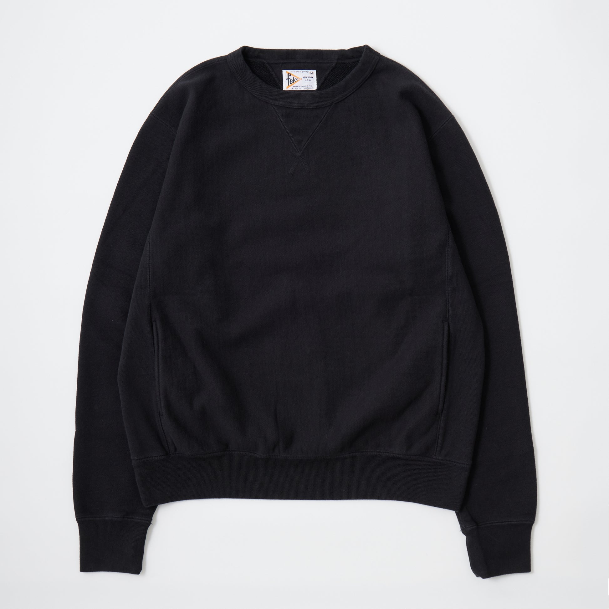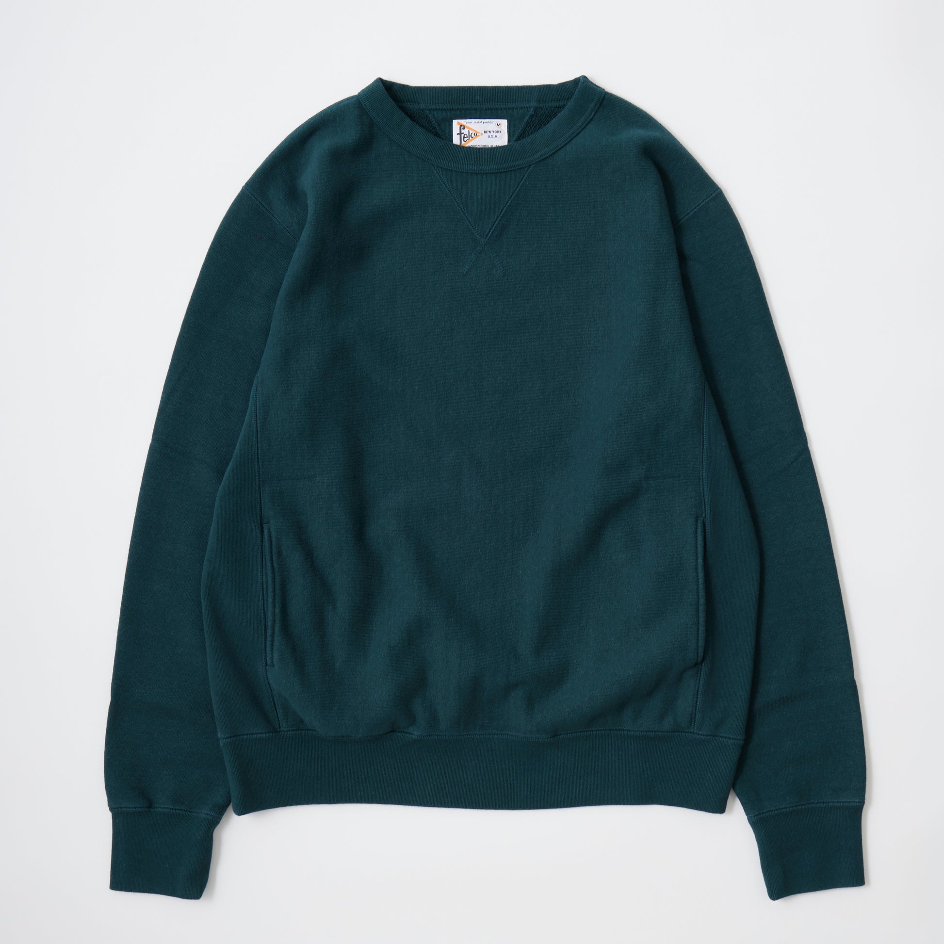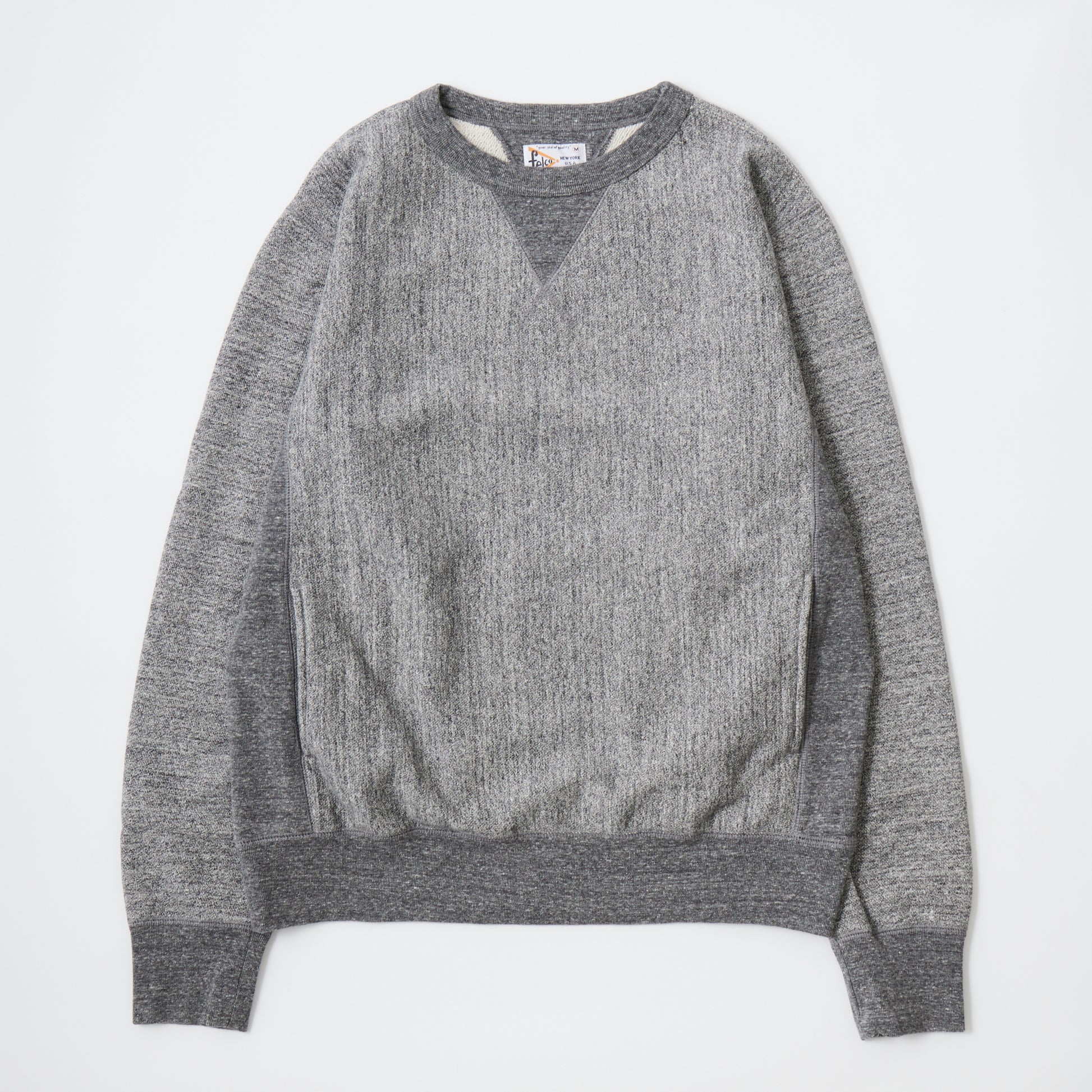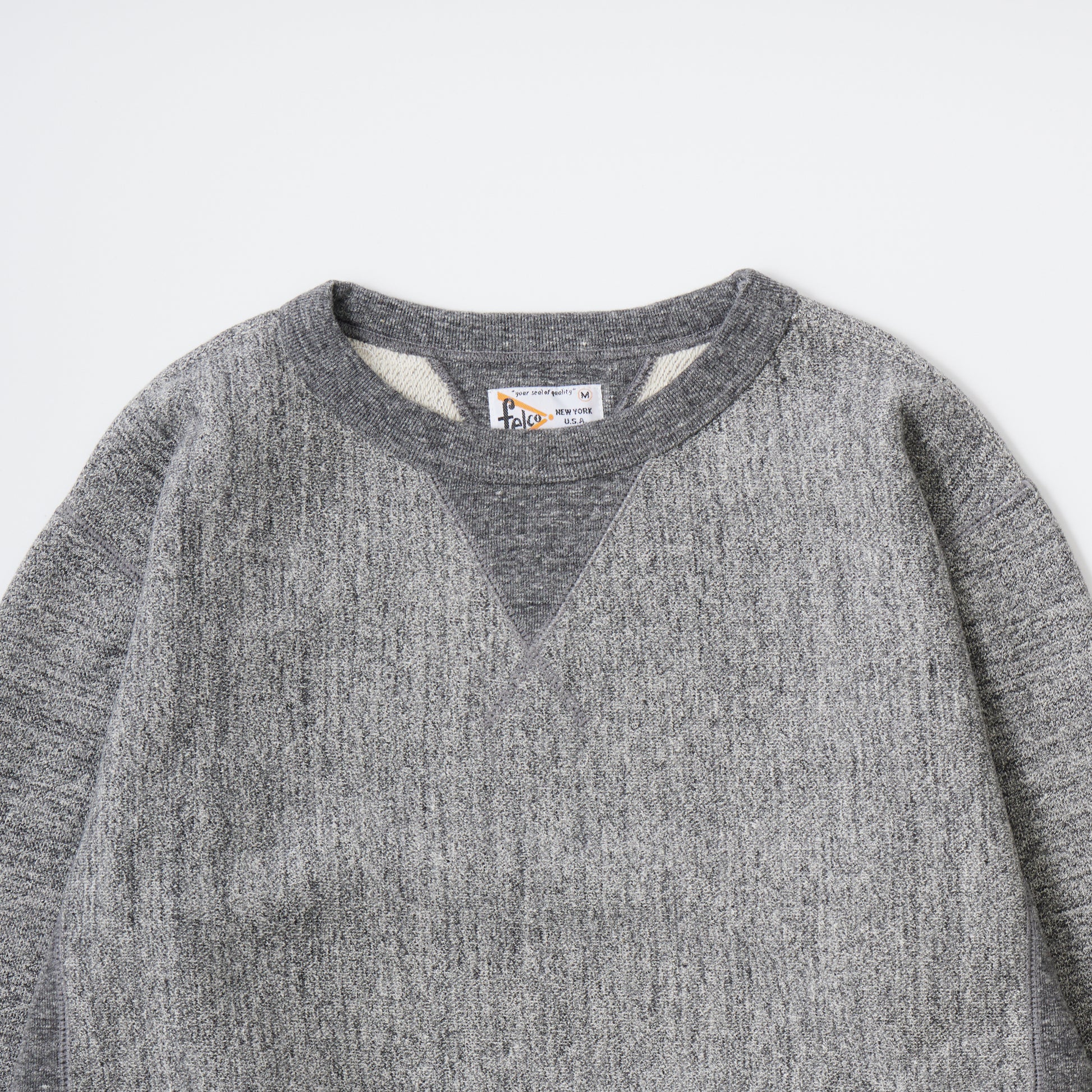 FELCO(フェルコ)の16oz TERRY CLASSIC FIT INVERSE WEAVE DOUBLE V GUSSET SET IN CREW SWEAT W/SLASH POCKET。独自で開発した16オンスの厚みとコシのある生地を使用した両Vガゼットクルーネックスウェット。生地を横向きに使用することで縦縮みを軽減し、サイドリブが横縮み防止と動きやすさを実現しています。ガシガシ着倒してもへこたれないタフな1着。袖と裾のリブはやや長めに設定されたヴィンテージを彷彿させる完成度。やや下辺りにハンドウォーマーポケットが付いているのも手を入れ易い仕様。従来のモデルよりも全体的にゆとりを持たせたクラシックフィット。ストレスのない着用感のスウェットで、クラッシックフィットモデルのコーチジャケットにも対応可能な1着。