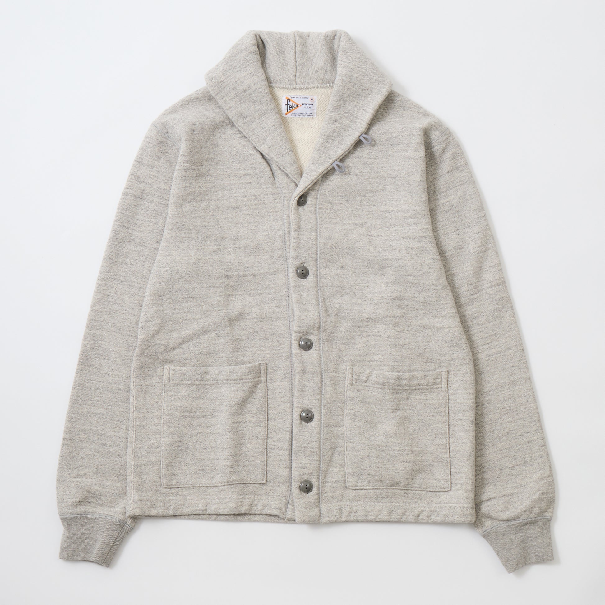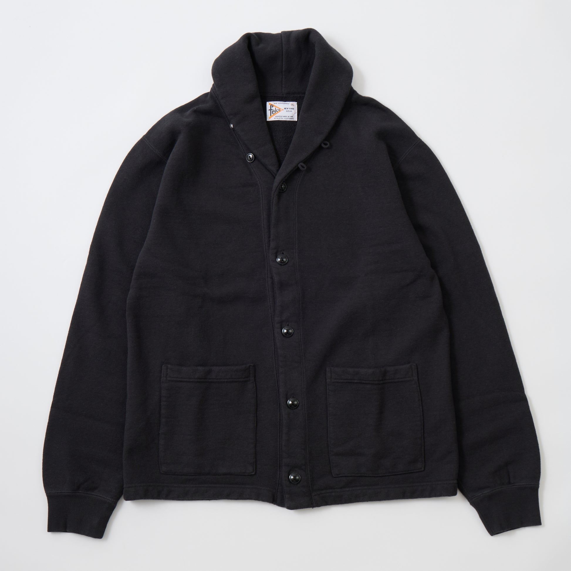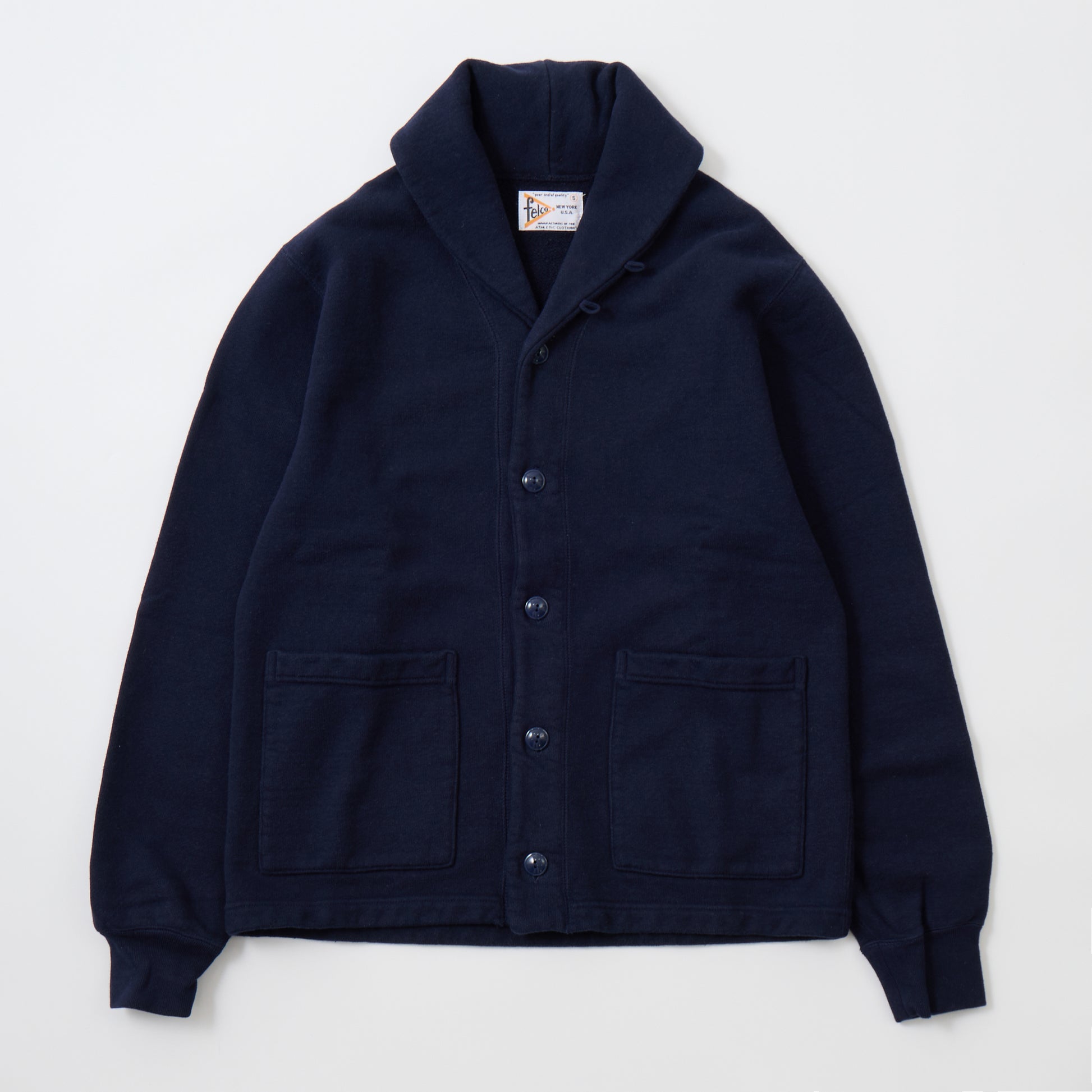 程よい厚みとコシのある別注した16オンスのヘビーウェイトのフレンチテリー(裏起毛していないスウェット生地)素材を使用したボタンフロントのショールカラーカーディガン。ショールカラーの雰囲気のある襟元や腰部分の左右のパッチポケットが特徴的なディテールのアイテム。アウターとしての使用は勿論ですが、ダウンベストなどのインナーアイテムとしても使って頂ける汎用性も高いアイテム。