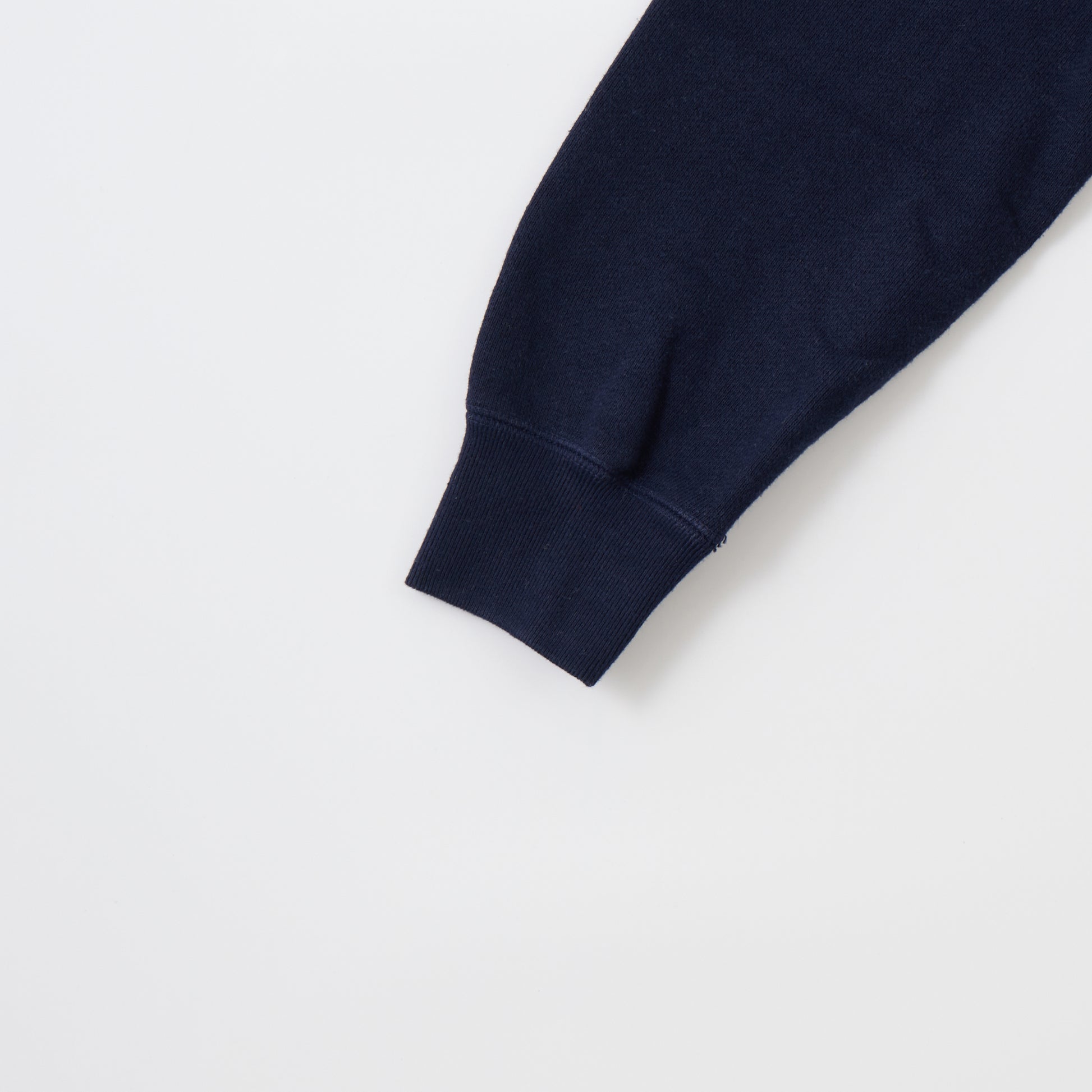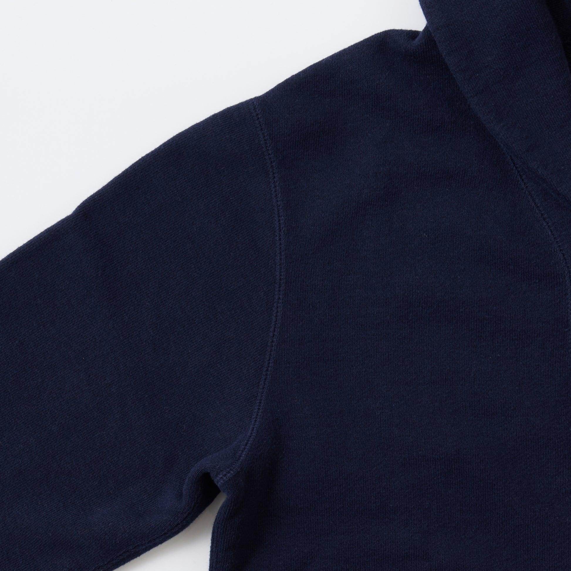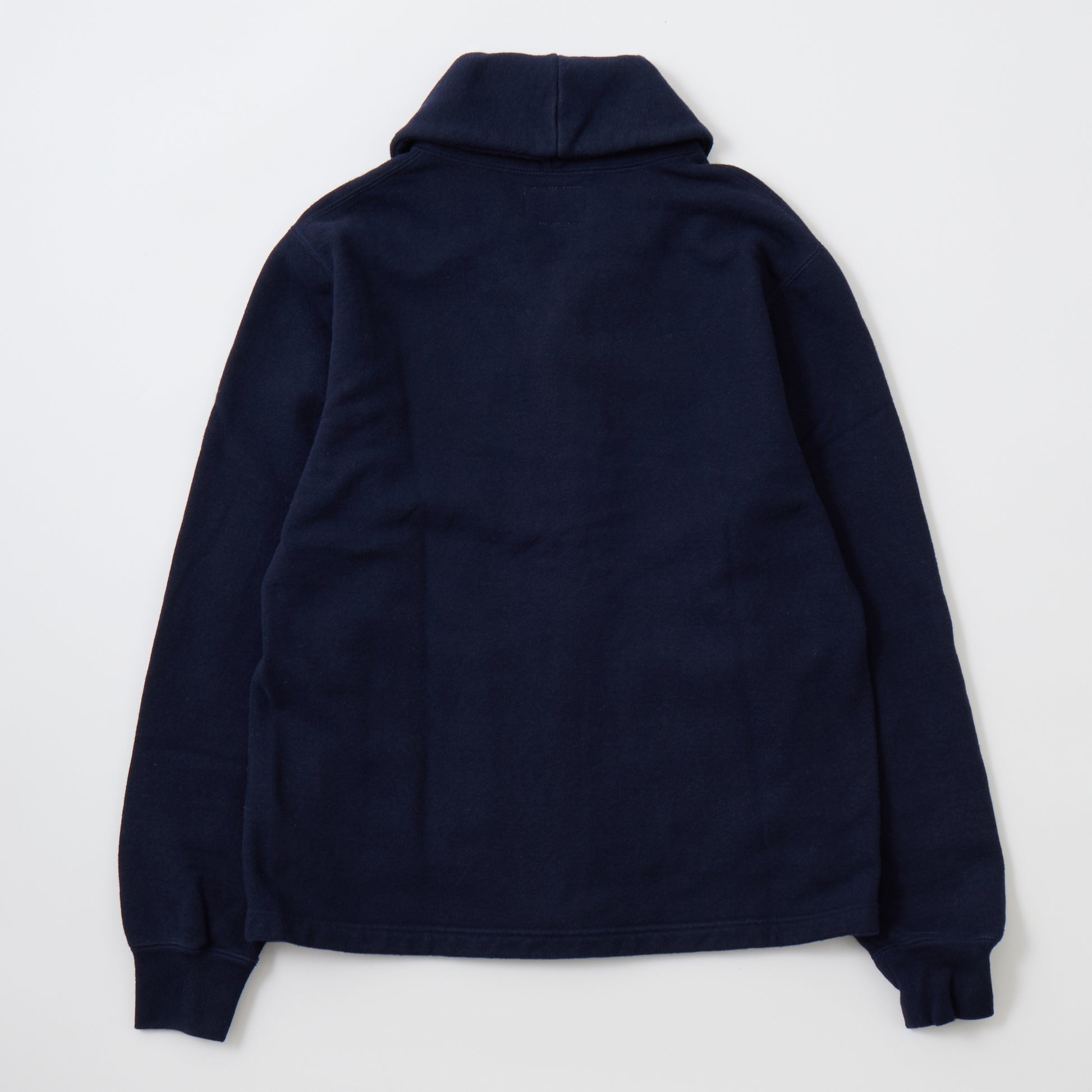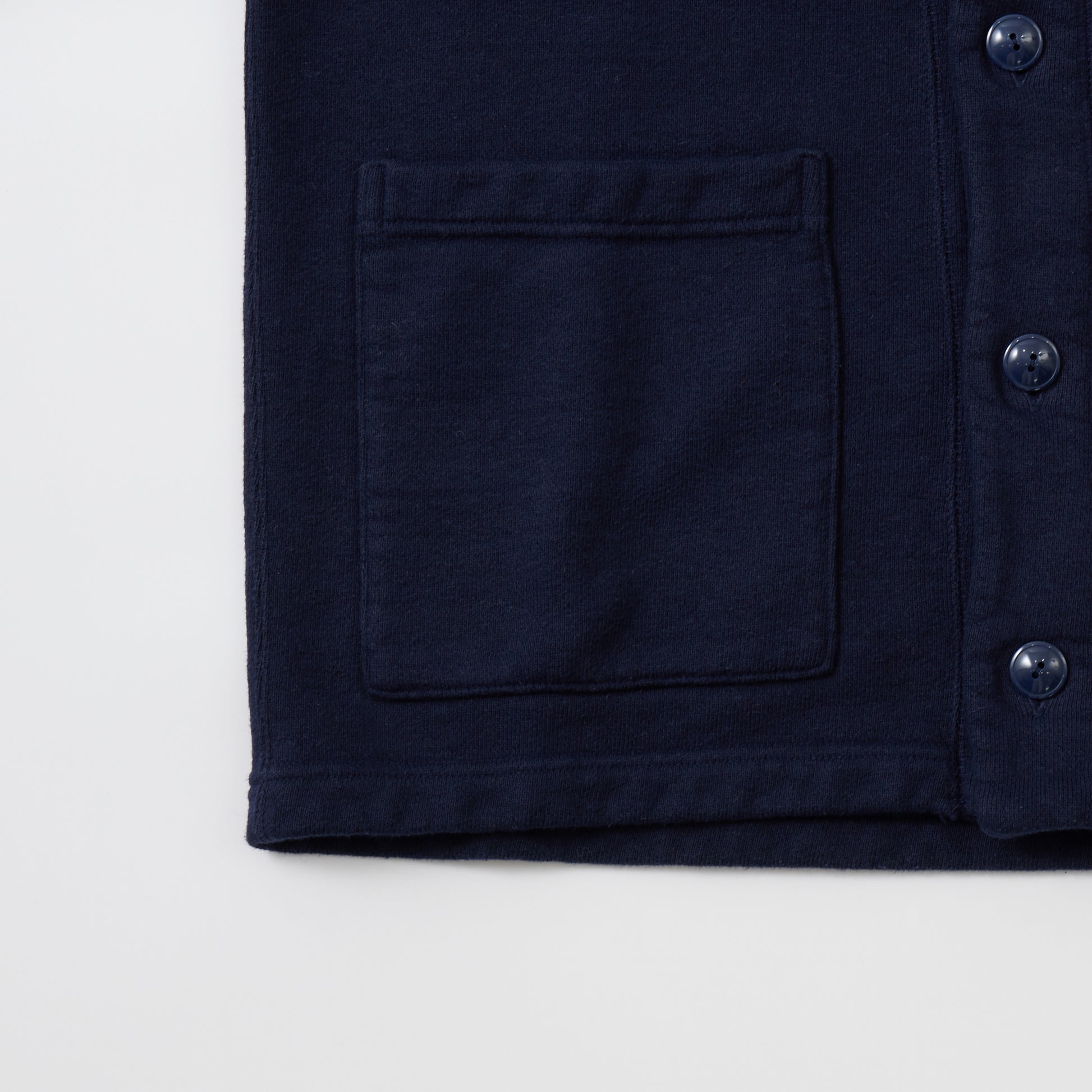 程よい厚みとコシのある別注した16オンスのヘビーウェイトのフレンチテリー(裏起毛していないスウェット生地)素材を使用したボタンフロントのショールカラーカーディガン。ショールカラーの雰囲気のある襟元や腰部分の左右のパッチポケットが特徴的なディテールのアイテム。アウターとしての使用は勿論ですが、ダウンベストなどのインナーアイテムとしても使って頂ける汎用性も高いアイテム。