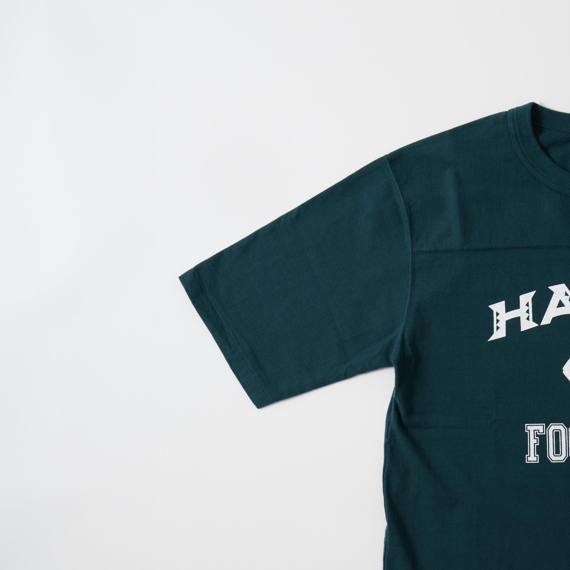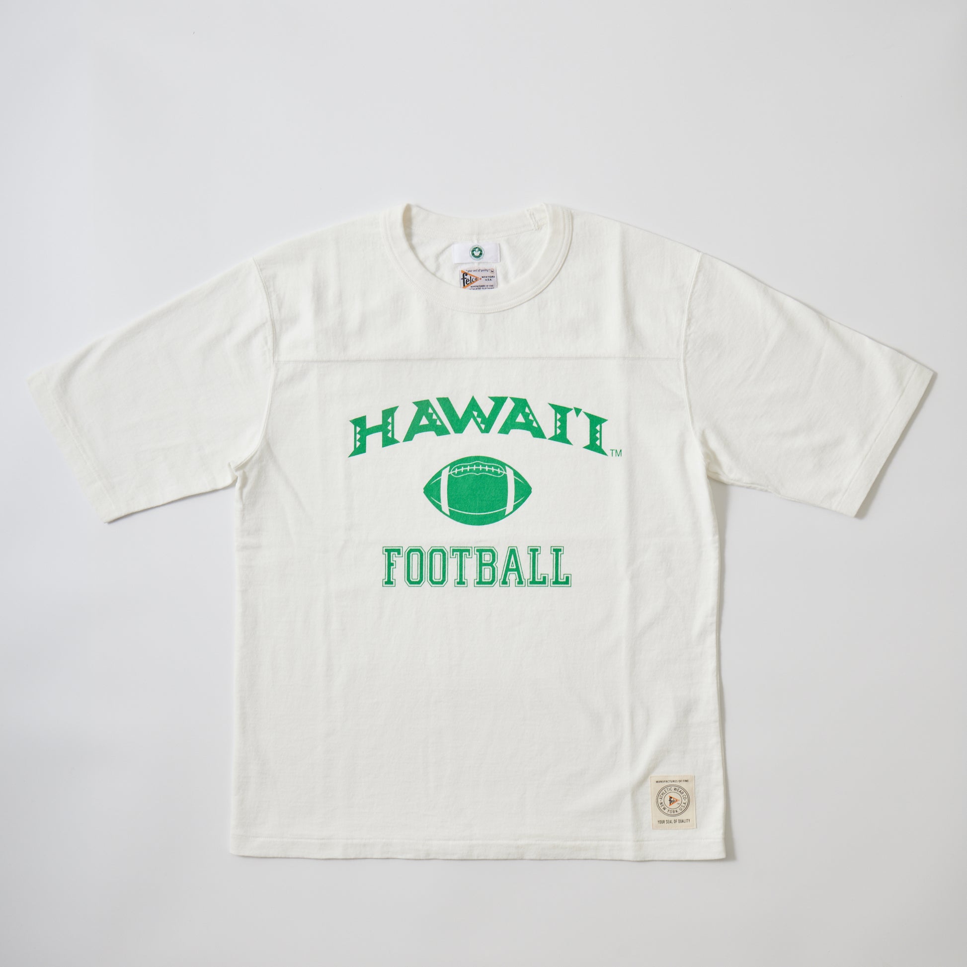 FELCO(フェルコ)SS2024のH/S SLEEVE FOOTBALL TEE - HAWAII FOOTBALL PRINT。ヘビーウェイト16'Single ラフィー天竺を使用した5分袖のフットボールTEEにハワイ大学とのライセンス契約をしてPRINTした渾身の1枚。ハワイ大学のフットボールチームは、レインボーウォリアーズという名前で親しまれていてアメリカの大学リーグ(NCAA)のディビジョン1(1部リーグ)に所属しているチームです。ホームコートはアロハスタジアムで、カンファレンスを3度制したことのある強豪です。