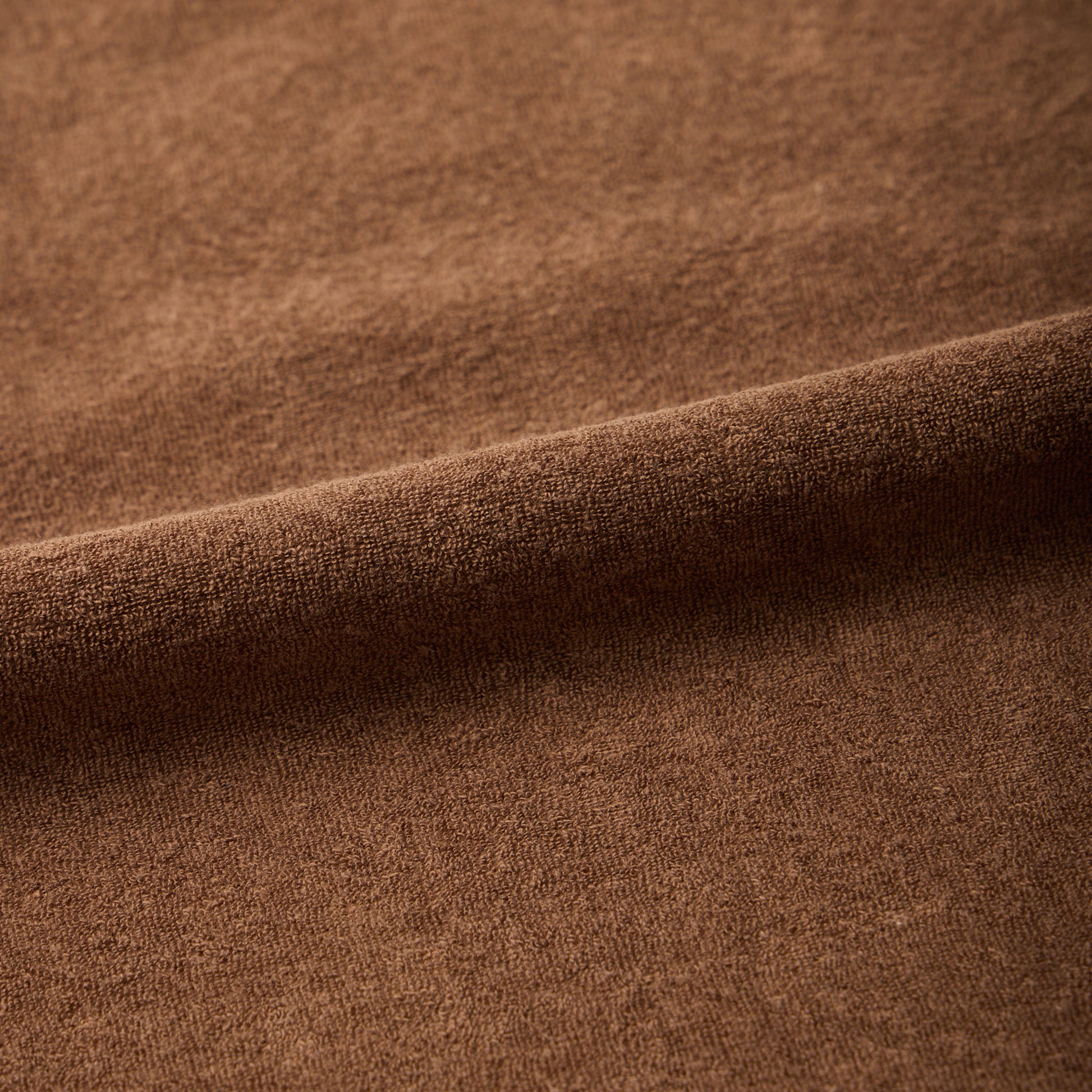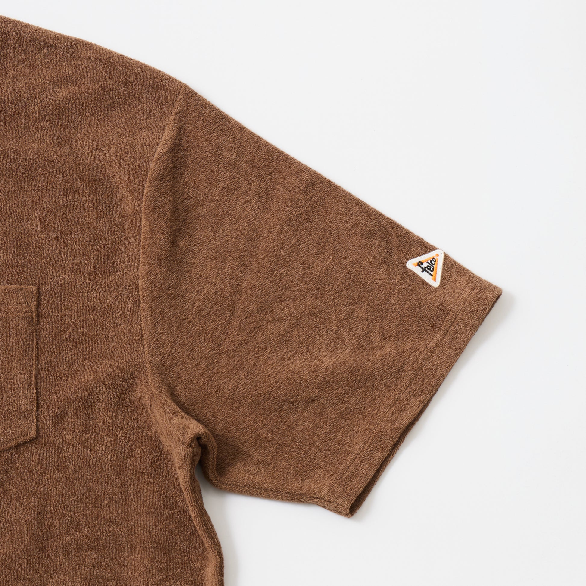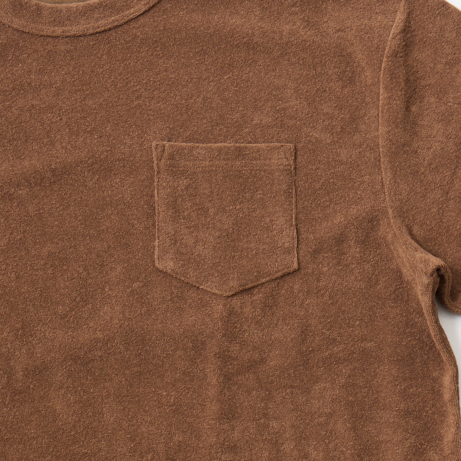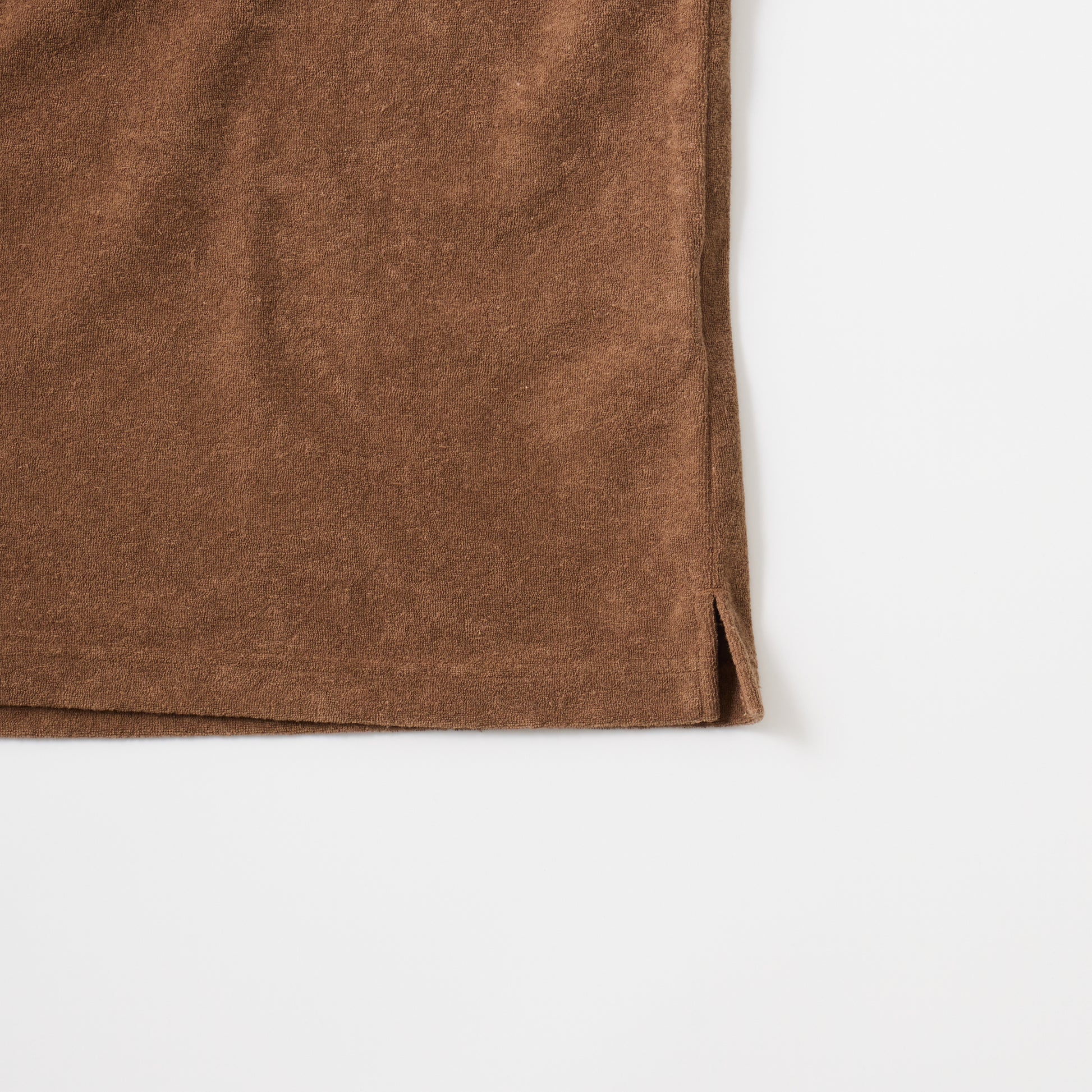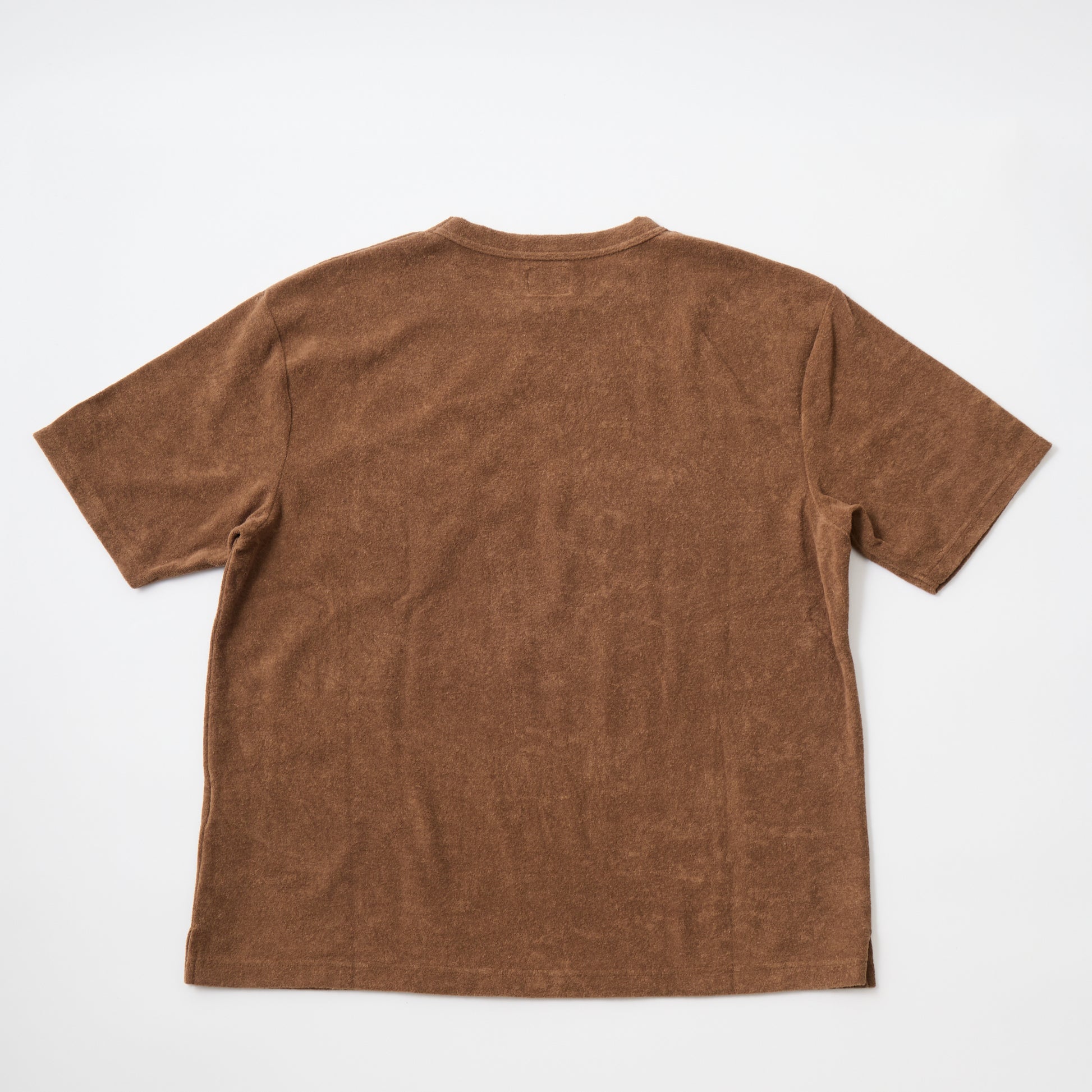 S/S MINI PILE T-SHIRT。柔らかいパイルの生地を使用したクルーネックTシャツ。幅広のネックリブ。セットインスリーブ仕様。左胸にパッチポケット。身幅にゆとりのあるボックスのシルエット。裾、両サイドにスリット。左袖口にブランドロゴのワッペン。吸汗性抜群のパイル素材で快適な着心地の1着。