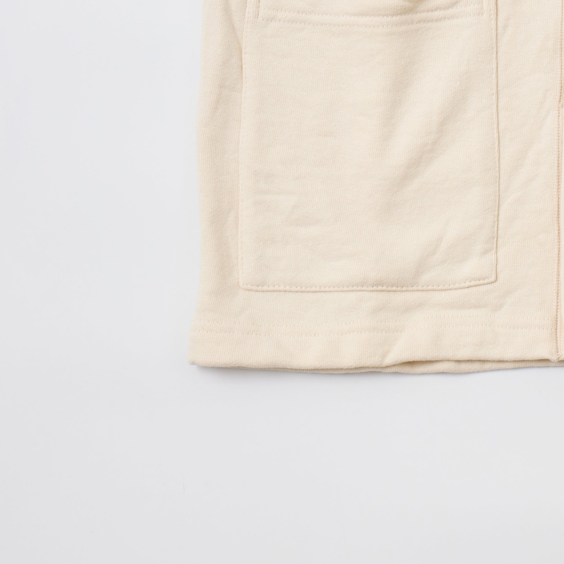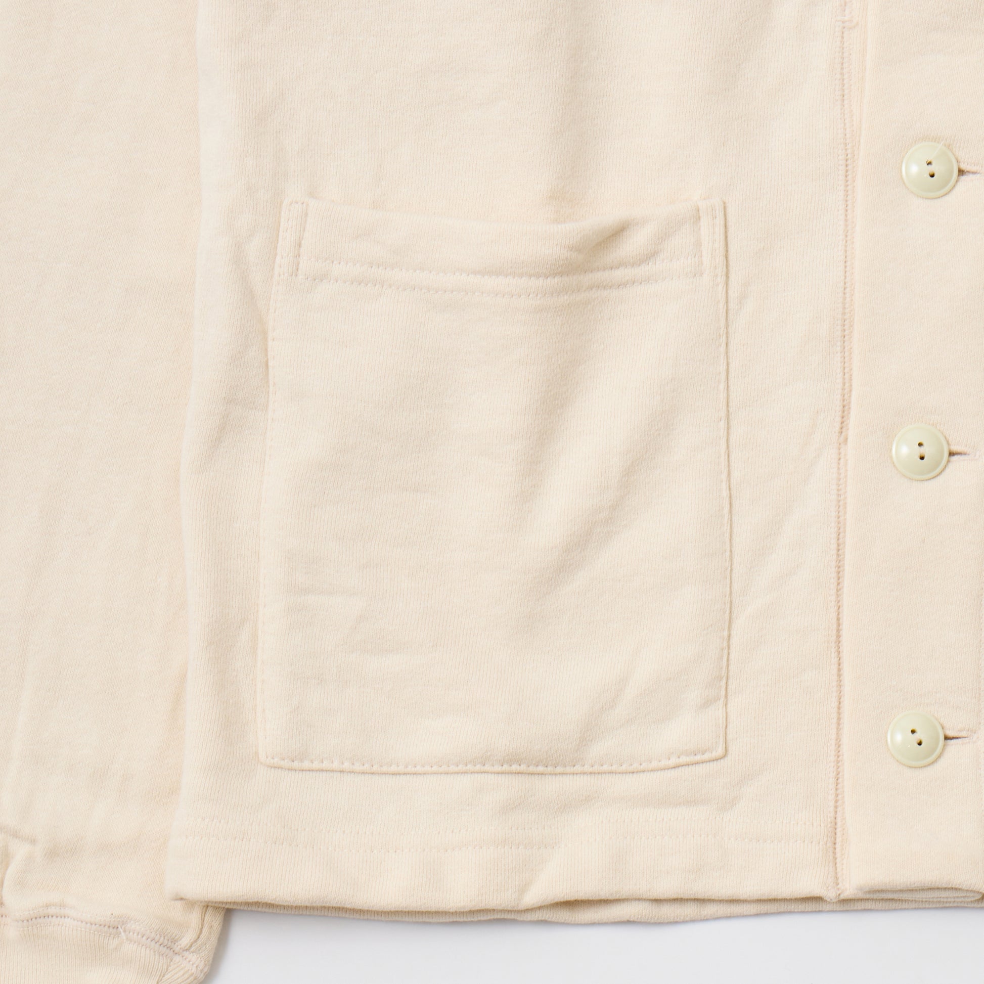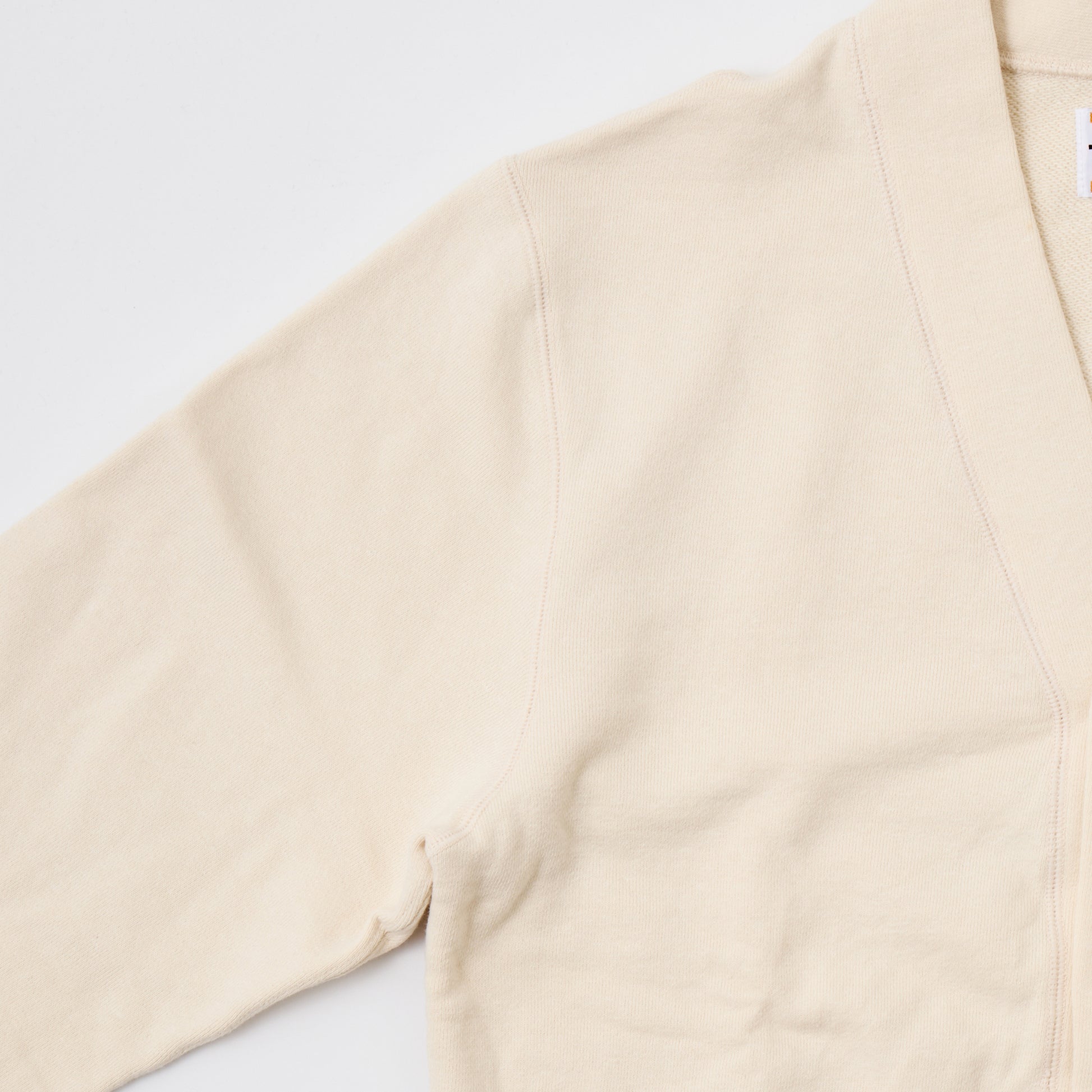 独自で開発した程よい厚みとコシのあるライトウェイトのフレンチテリー(裏起毛していないスウェット生地)素材を使用した Vネックレタードカーディガン。Vゾーンをやや狭めにしてボタンに拘り5 ボタンを装着した1枚。通常はウールニットで作られていますが、フレンチテリースウェットで作られている為、秋口から春先まで着れる汎用性の高いアイテムになります。