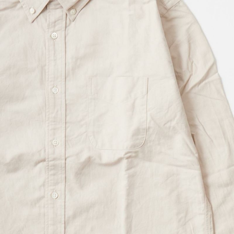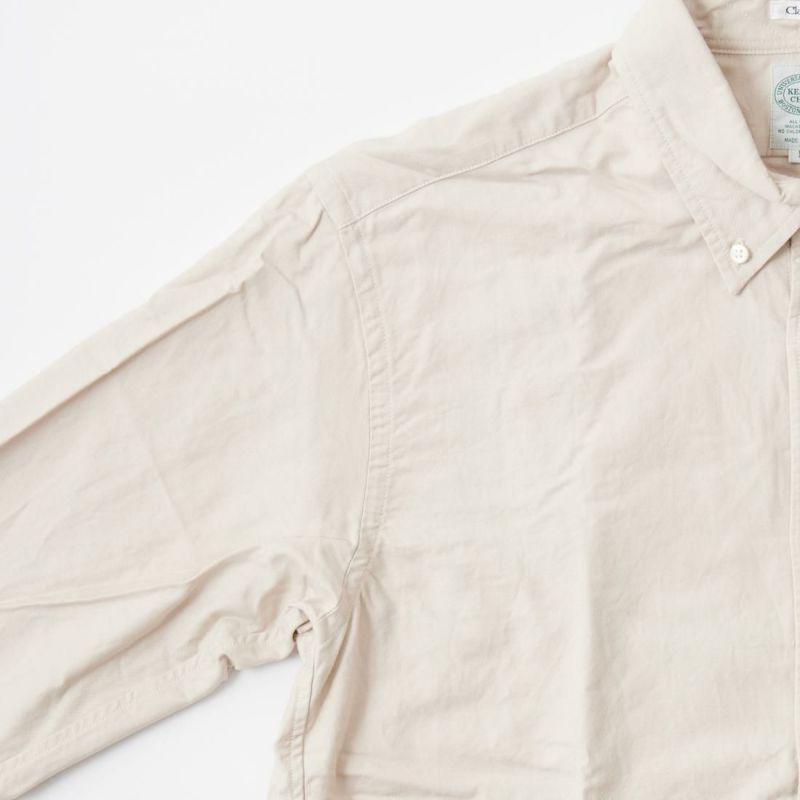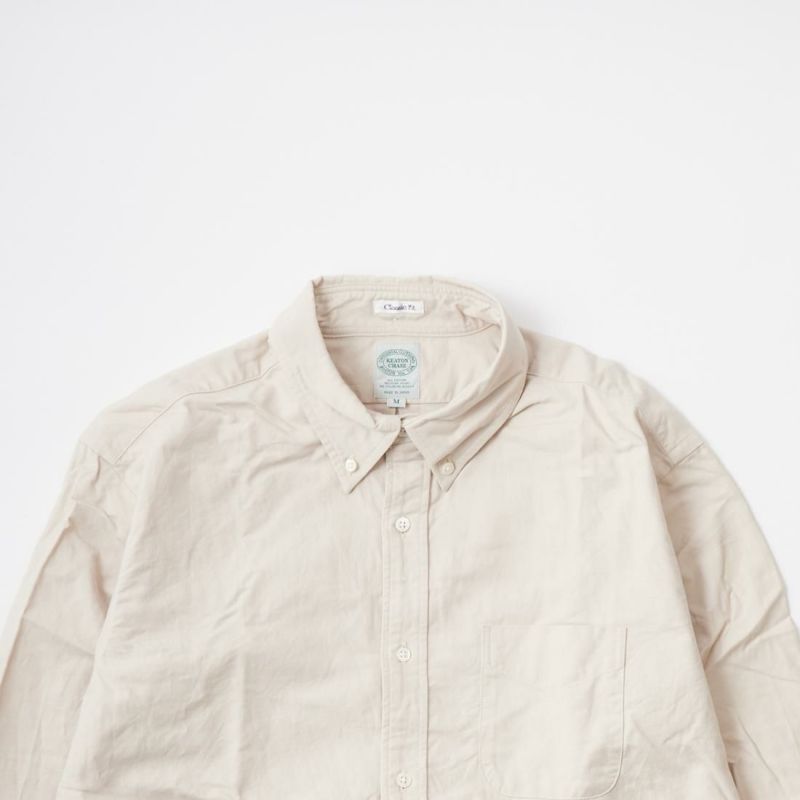 KEATON CHASE USA(キートンチェイスUSA)のL/S MODIFIED CLASSIC FIT BD SHIRT PREMIUM OXFORD。日本生産ラインのフルオープンの長袖ボタンダウンシャツ。サラッとしたライトウェイトのオックスフォードの生地を使用。左胸にフラップポケットが配置され、背面はボックスプリーツ仕様。アメリカシャツらしいチョークボタン付き。身幅やアームホールはゆったりフィッティングで肘から袖口にかけて細くなっていく腕回りがスッキリとしたモディファイドクラシックフィット。レイヤードした時の腕回りの収まりの良いフィット。スタンダードなデザインと素材の定番の1着。