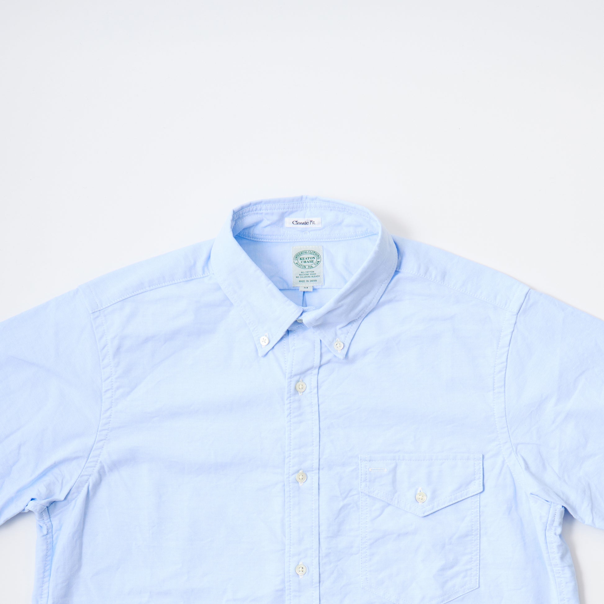 KEATON CHASE USA(キートンチェイスUSA)のS/S CLASSIC FIT FULL OPEN BD SHIRT - PREMIUM OXFORD。日本生産ラインのフルオープンの半袖ボタンダウンシャツ。サラッとしたプレミアムオックスフォードの生地を使用し、左胸にフラップポケットが配置され、背面はボックスプリーツ仕様。アメリカシャツらしいチョークボタン付き。シルエットは全体的に程よいゆとり感を持ったクラシックフィット。ボタンダウンのカッチリとした感じと程よいリラックス感のあるシルエットが良い雰囲気に仕上がっている1着。