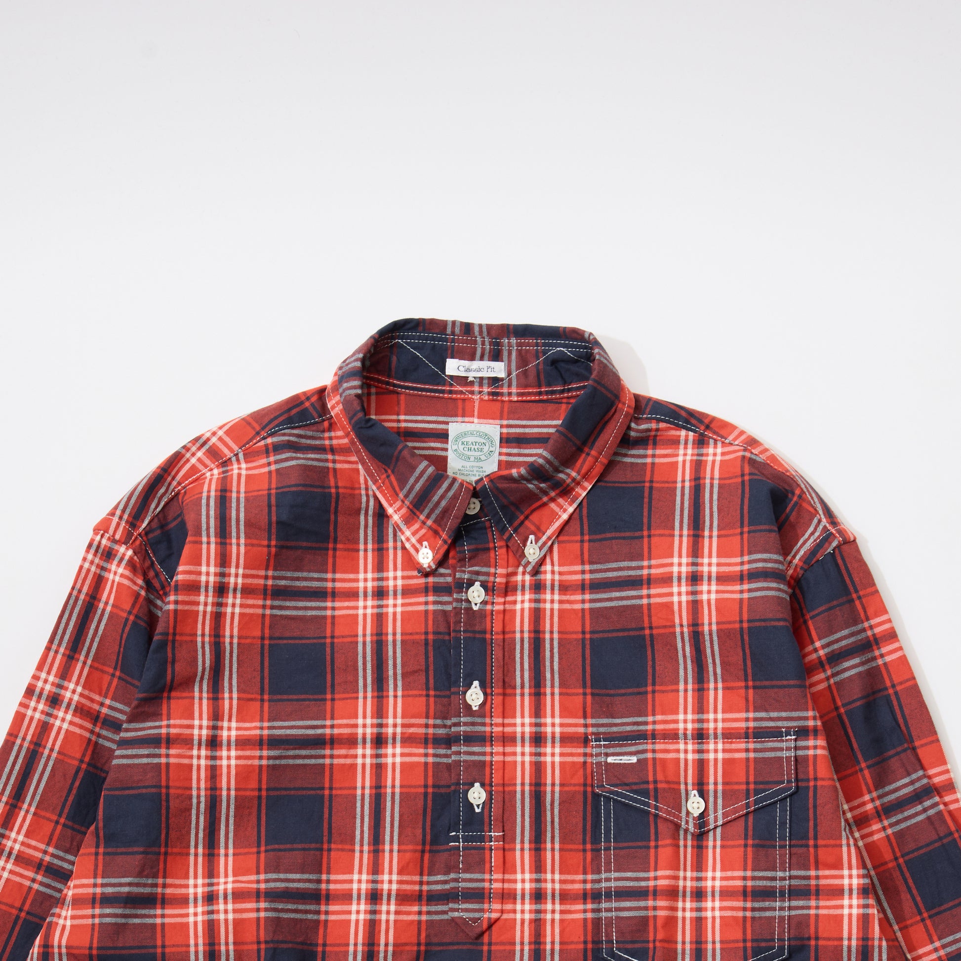 KEATON CHASE USA(キートンチェイスUSA)のL/S CLASSIC FIT PULLOVER BD SHIRT TWILL CHECK。日本生産ラインのプルオーバーの長袖ボタンダウンシャツ。ハリコシのあるツイル生地を使用。左胸にフラップポケットが配置され、背面はボックスプリーツ仕様。シルエットは全体的に程よいゆとり感を持ったクラシックフィットでカフには袖口の調整できるように2個貝ボタンが付いております。ボタンダウンのカッチリとした感じと程よいリラックス感のあるシルエットが良い雰囲気に仕上がっている1着。