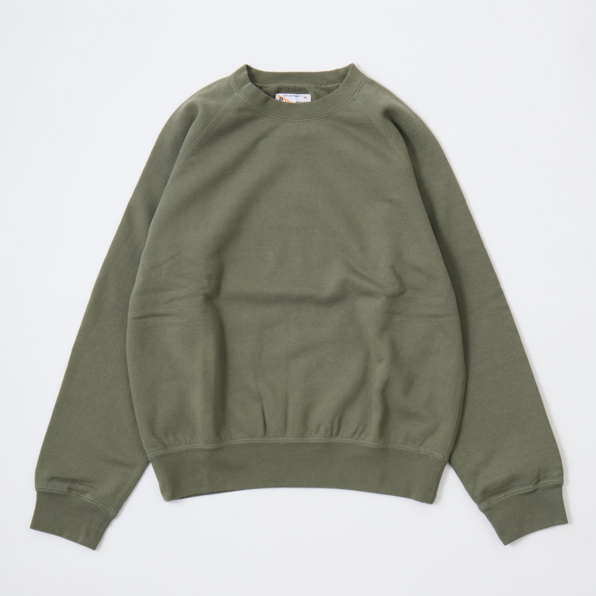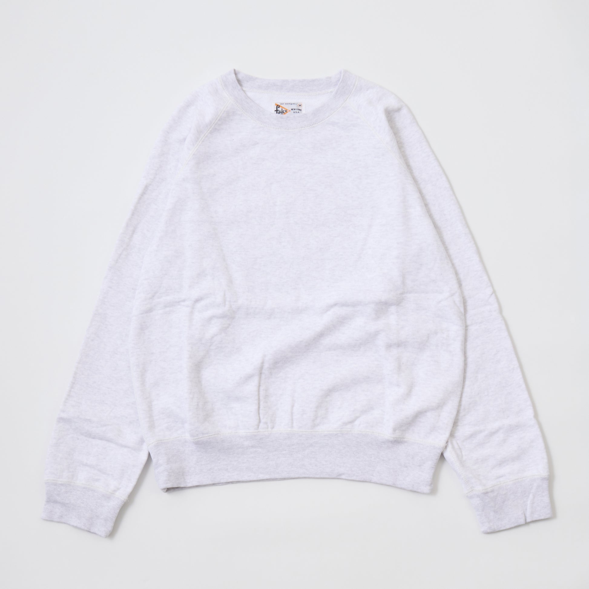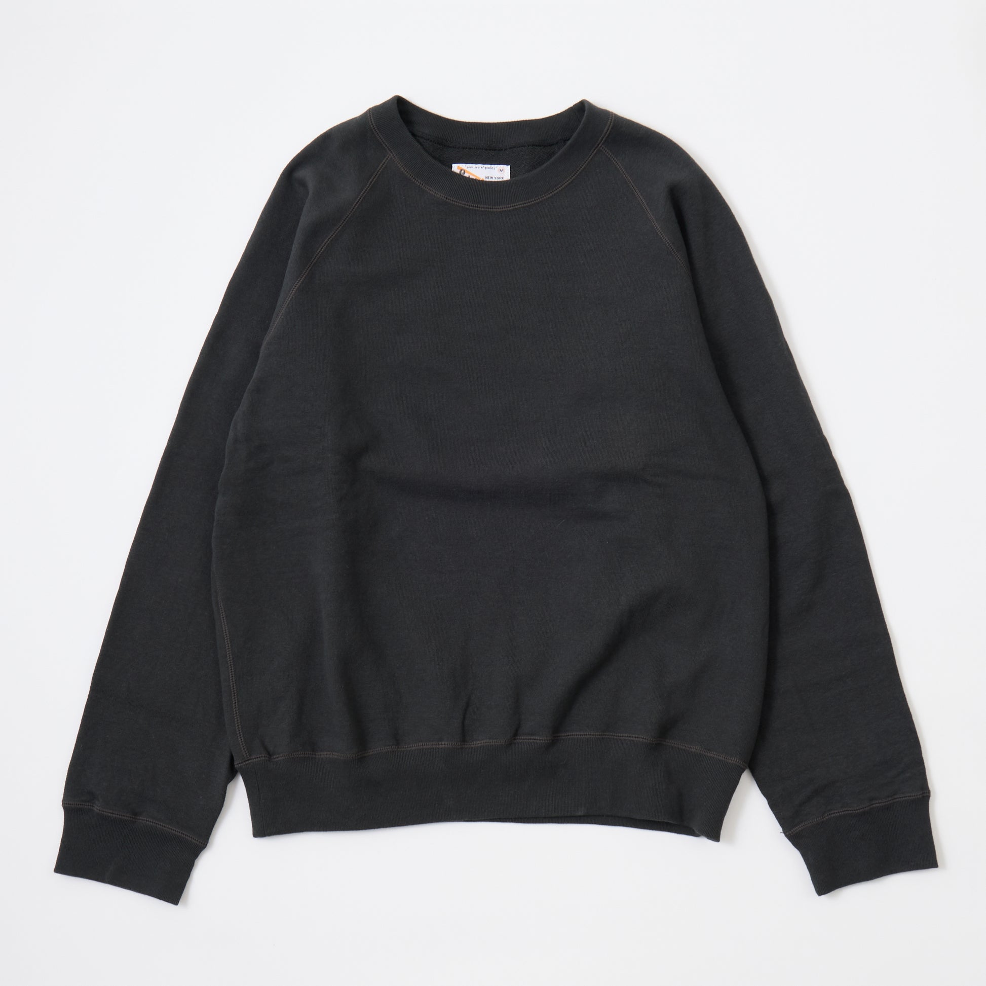 12oz FRENCH TERRY L/S RAGLAN CREW RELAX FIT。独自で開発した程よい厚みとコシのあるライトウェイトのフレンチテリー(裏起毛していないスウェット生地)素材を使用したラグランスリーブのクルーネックスウェット。リラックスフィットの名前通り身幅と腕回りはゆったりとしていますが着丈は長くないシルエット。春先や秋口には1枚でも着やすいですし、寒くなればインナーとしても使いやすい生地の厚み。年間通して考えれば一番汎用性の高い1枚です。