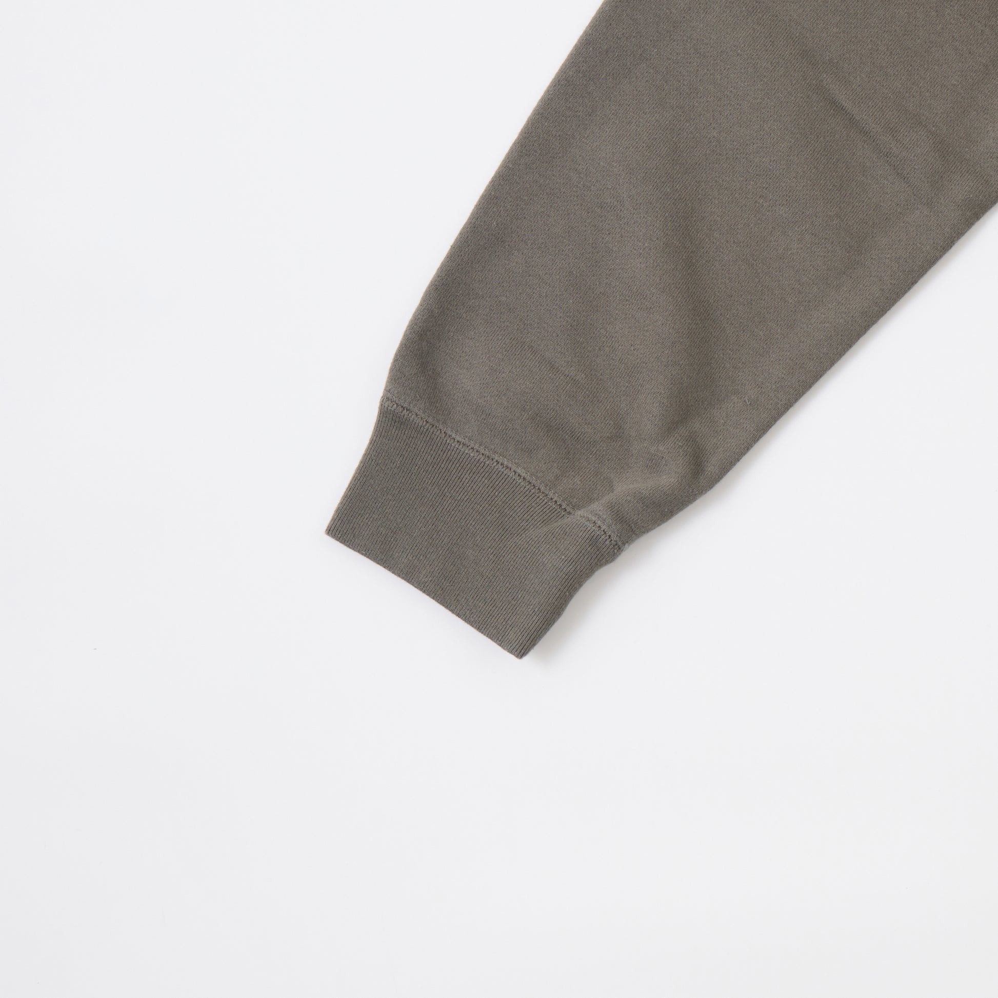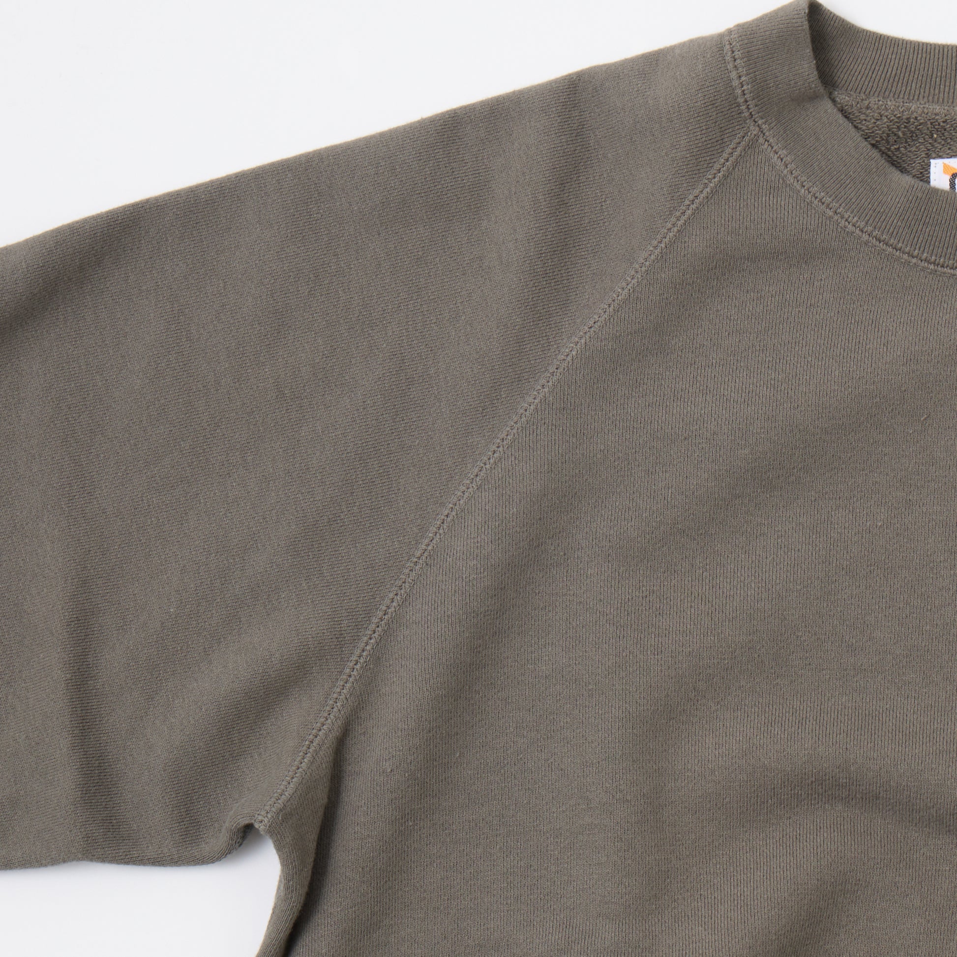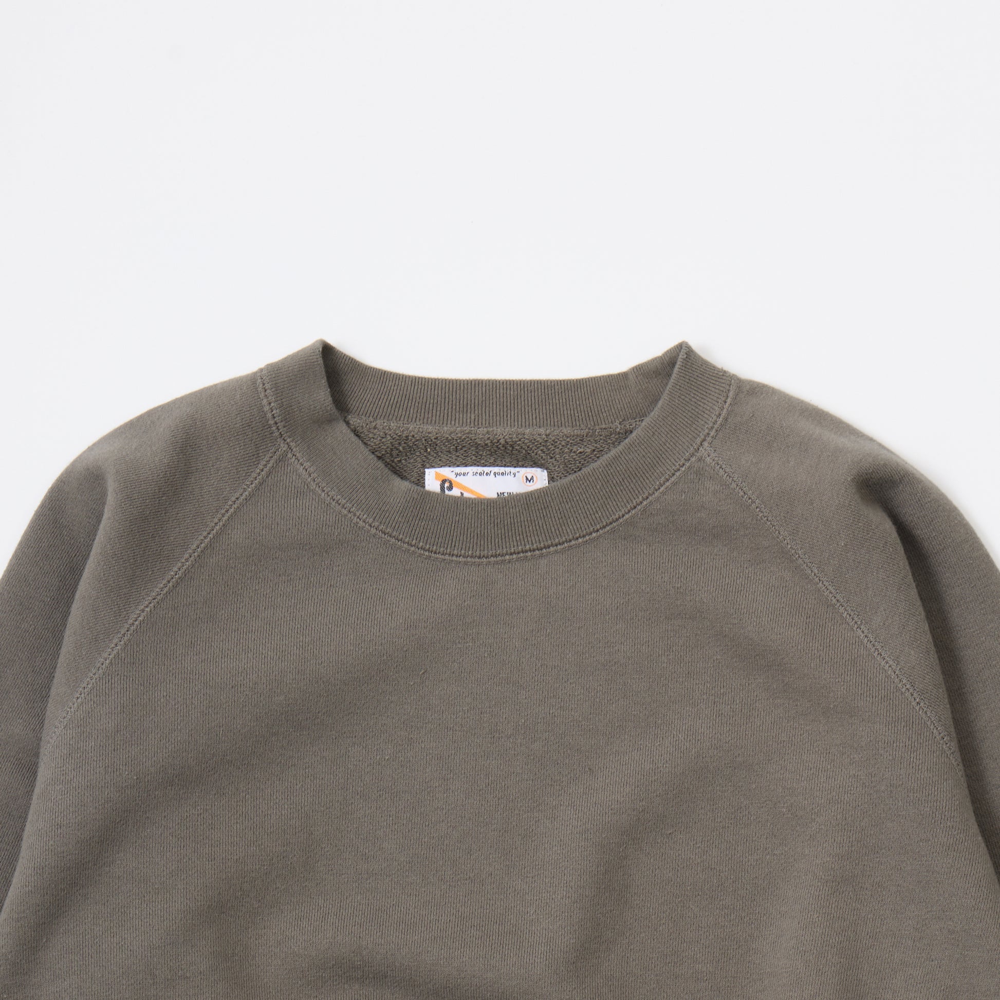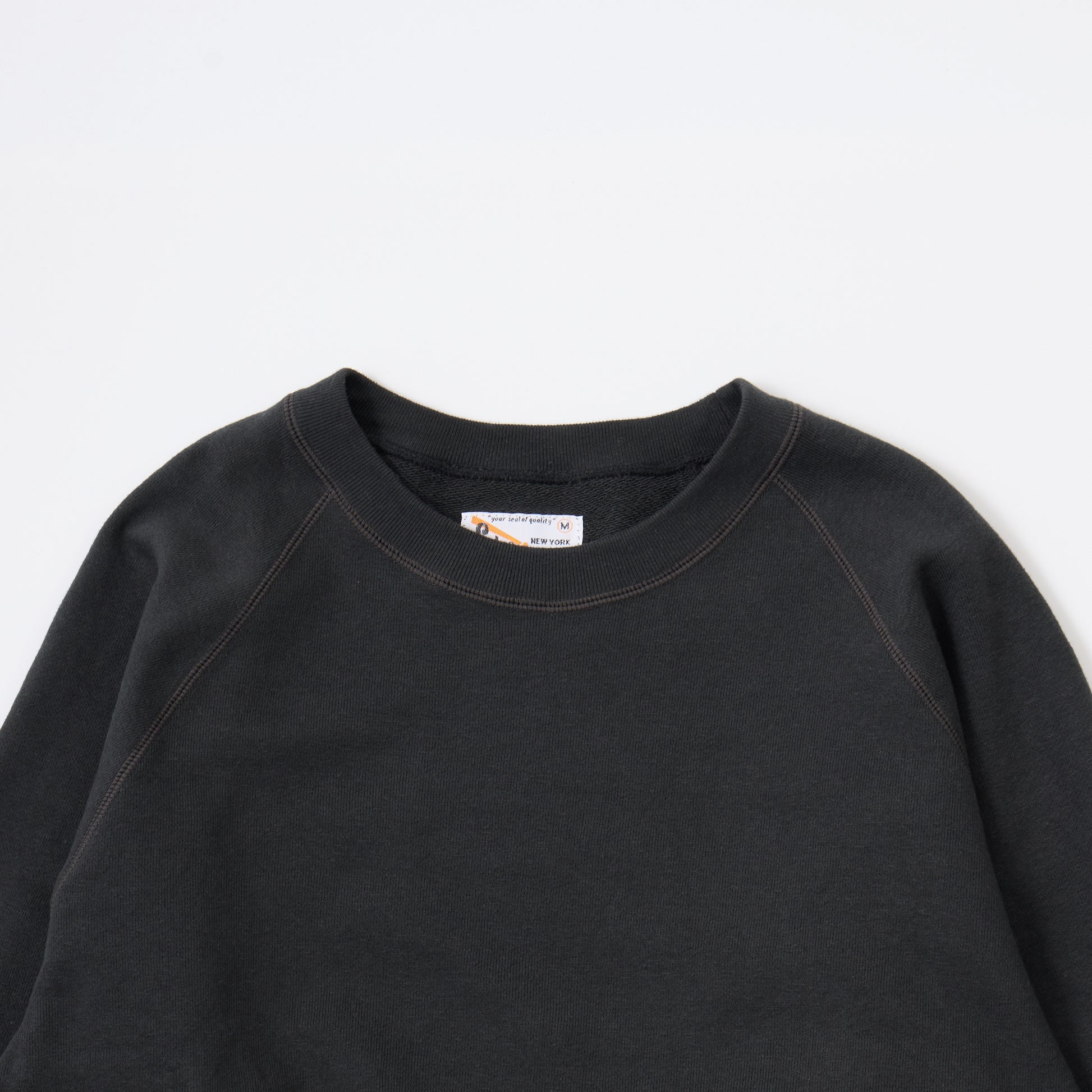 12oz FRENCH TERRY L/S RAGLAN CREW RELAX FIT。独自で開発した程よい厚みとコシのあるライトウェイトのフレンチテリー(裏起毛していないスウェット生地)素材を使用したラグランスリーブのクルーネックスウェット。リラックスフィットの名前通り身幅と腕回りはゆったりとしていますが着丈は長くないシルエット。春先や秋口には1枚でも着やすいですし、寒くなればインナーとしても使いやすい生地の厚み。年間通して考えれば一番汎用性の高い1枚です。