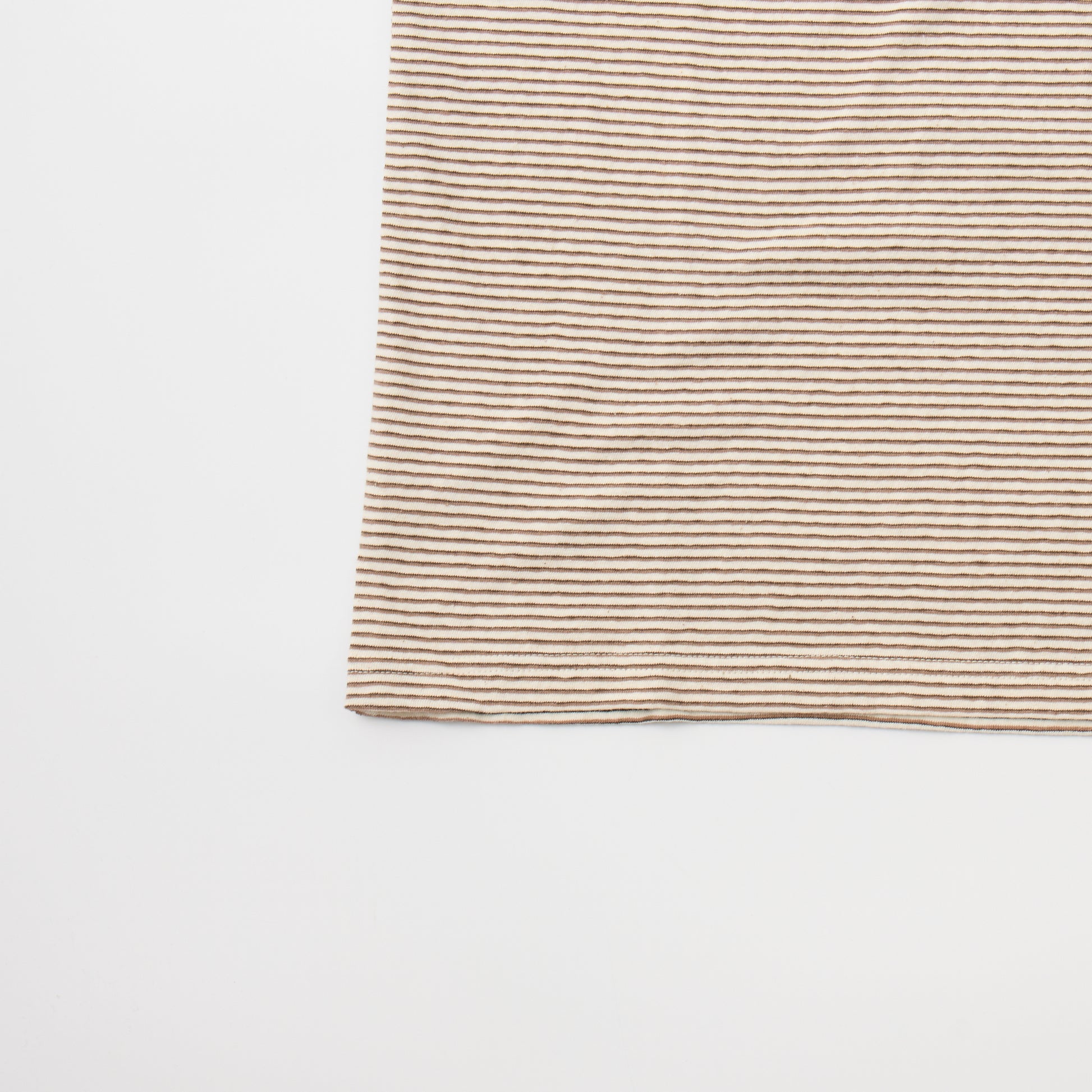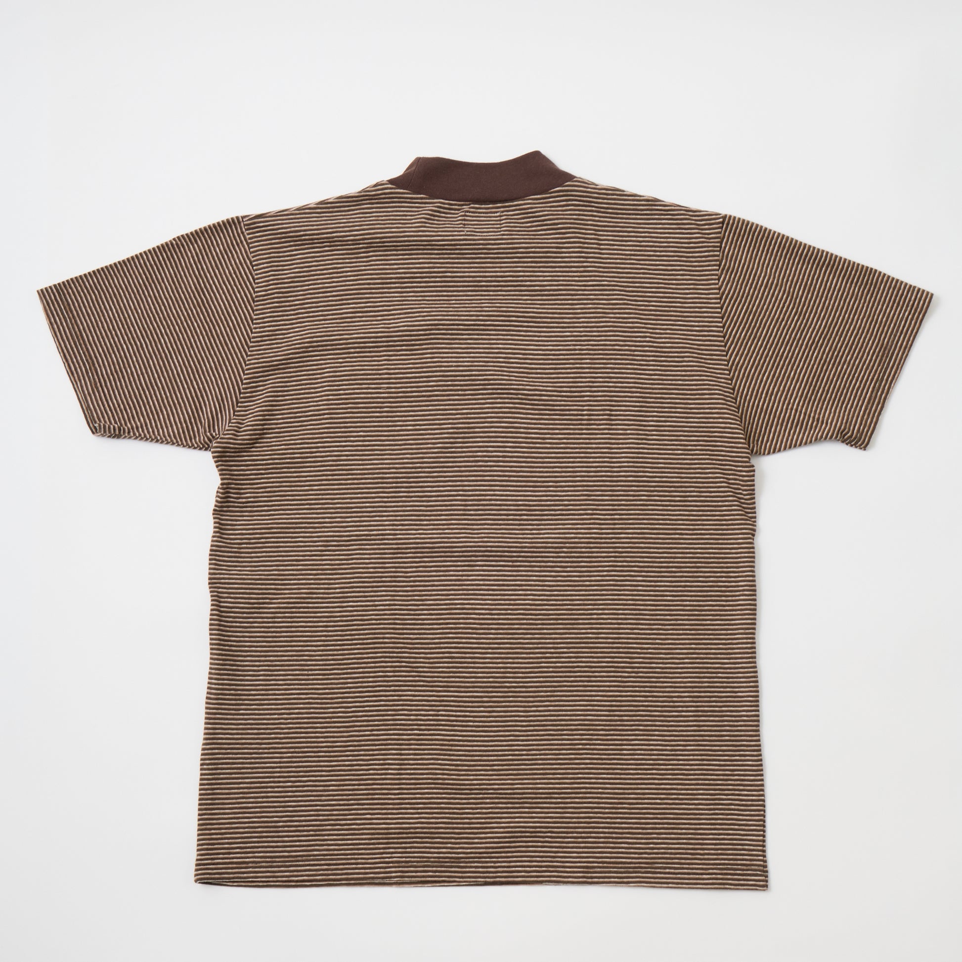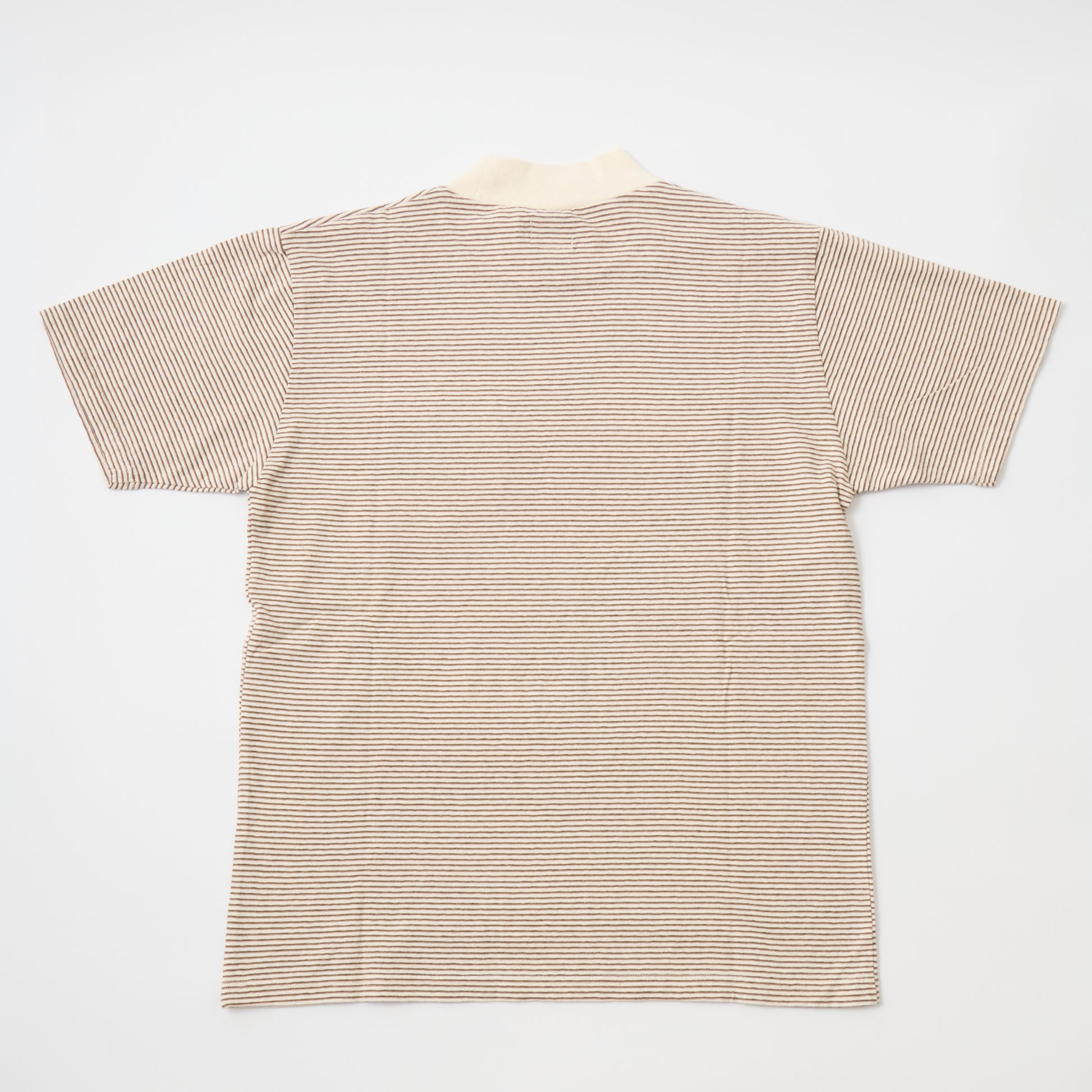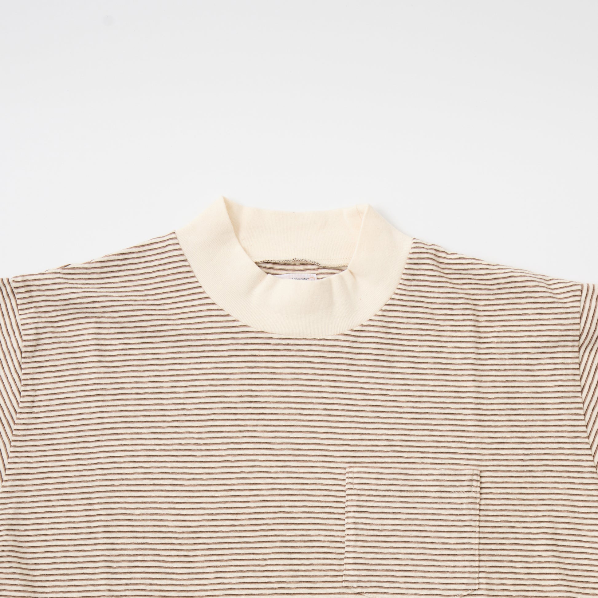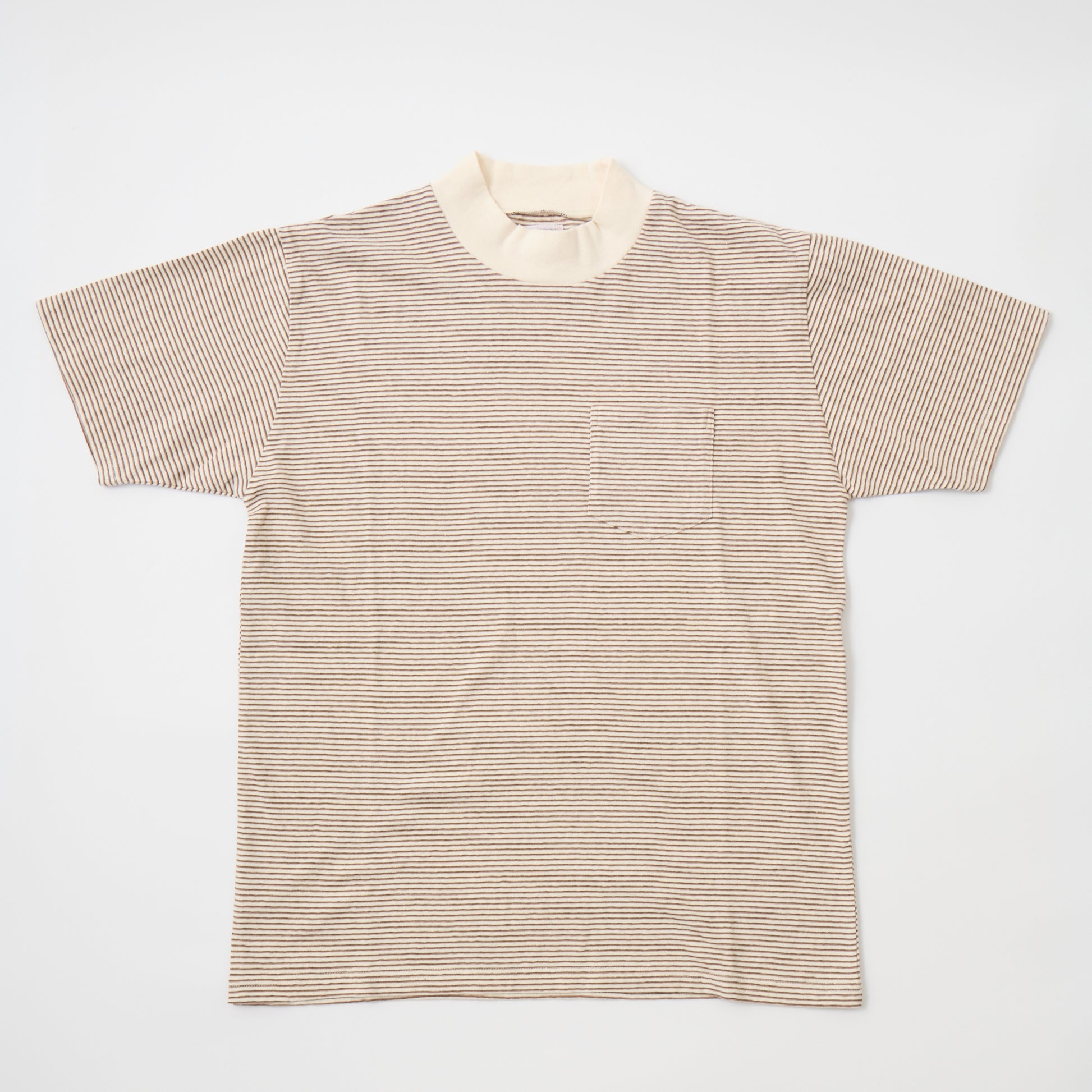 FELCO(フェルコ)のS/S MOCK NECK NARROW STRIPE POCKET TEE。モックネックの高さや幅が良い塩梅のモックネックの半袖ストライプポケットT。モックネックの襟元や胸のポケットが特徴的なディテール。ゆとりのある身幅で短めの着丈のボックスシルエット。落ち着いた色合いの細いストライプはシンプルで落ち着いた雰囲気。生地は柔らかく、ミドルウェイト(中厚)で着心地抜群の1着。