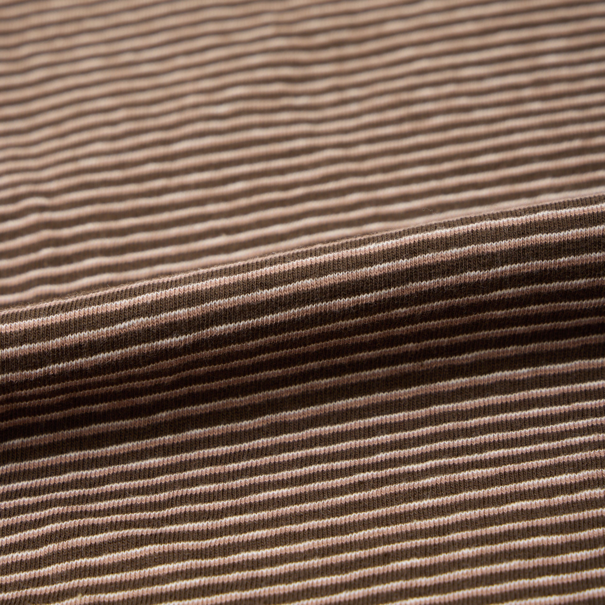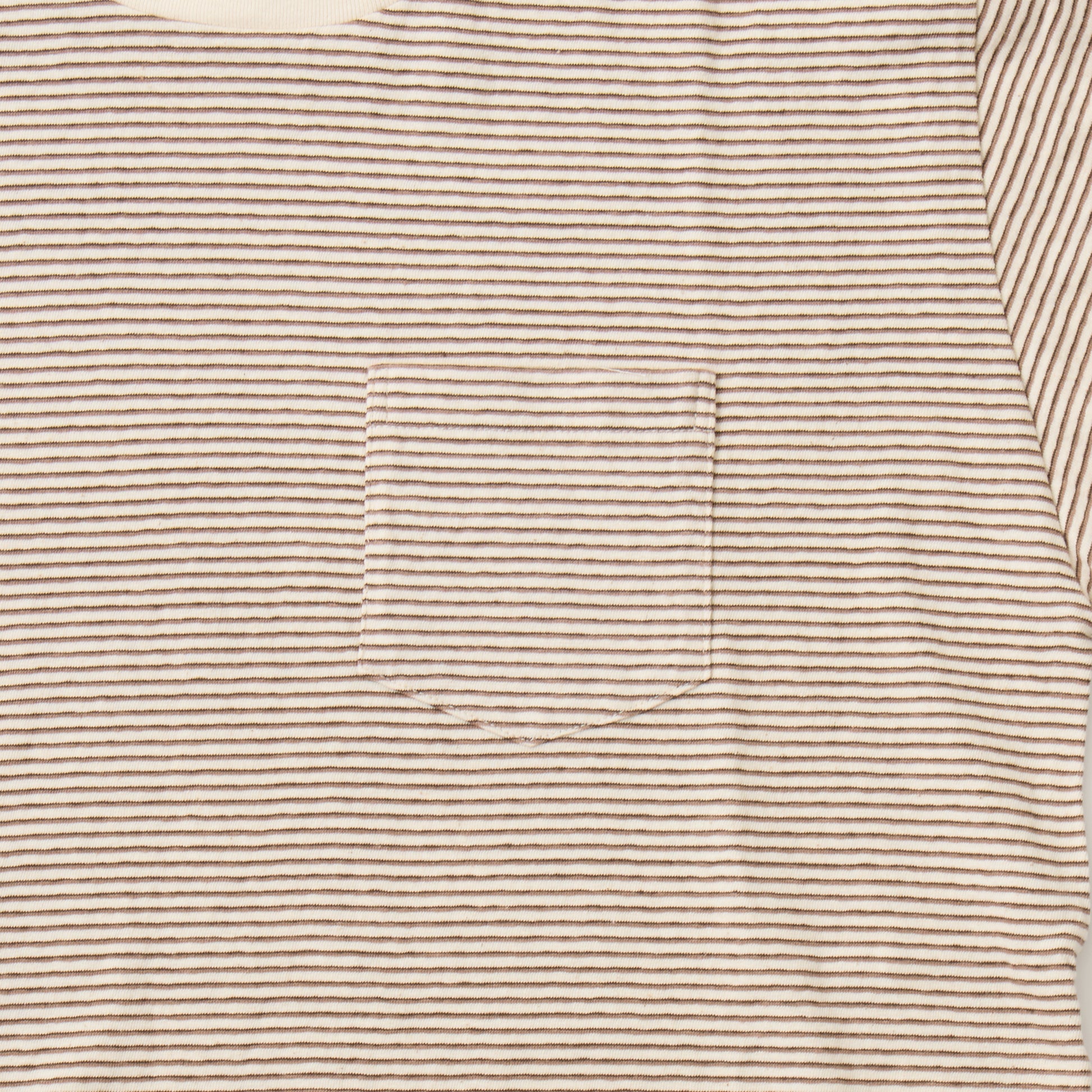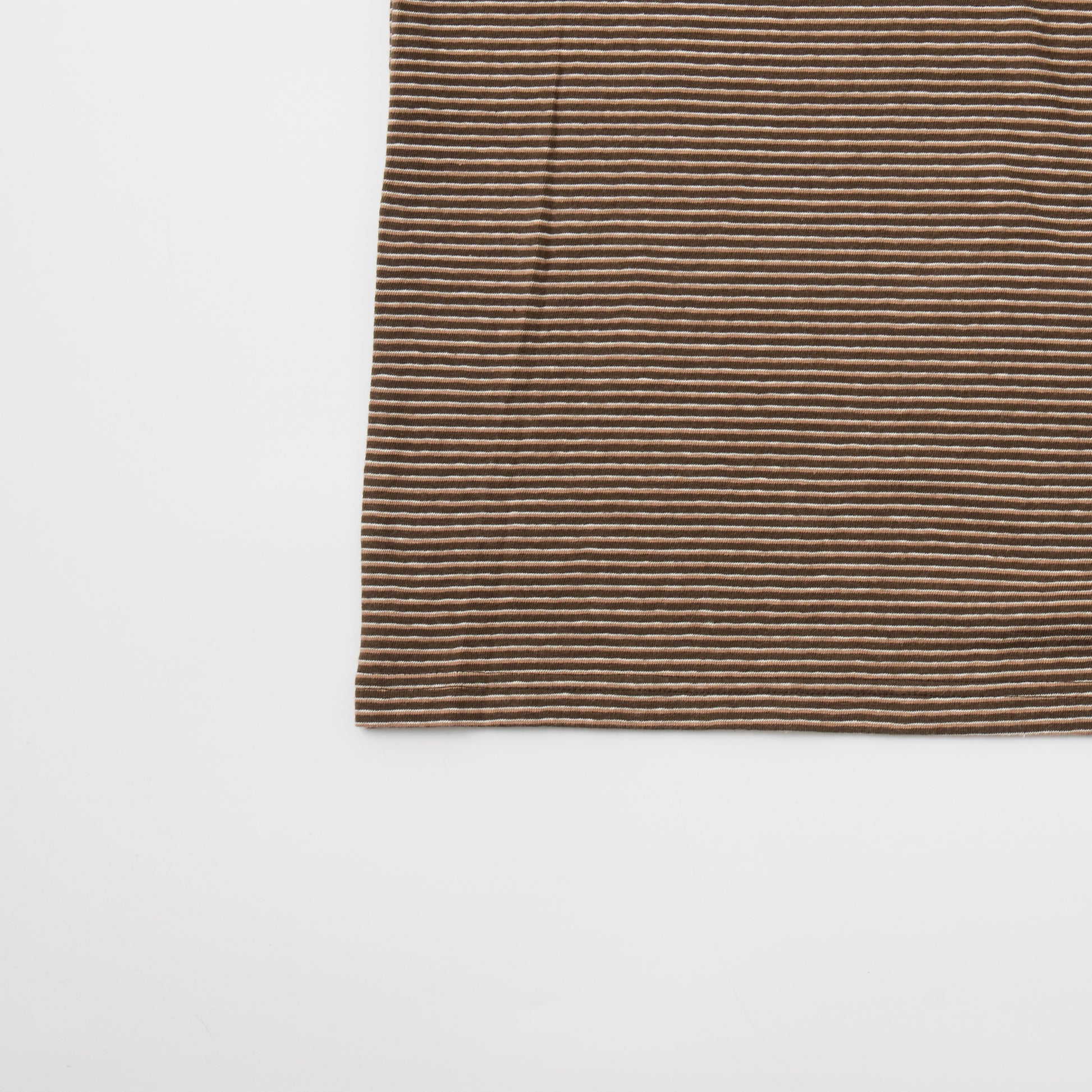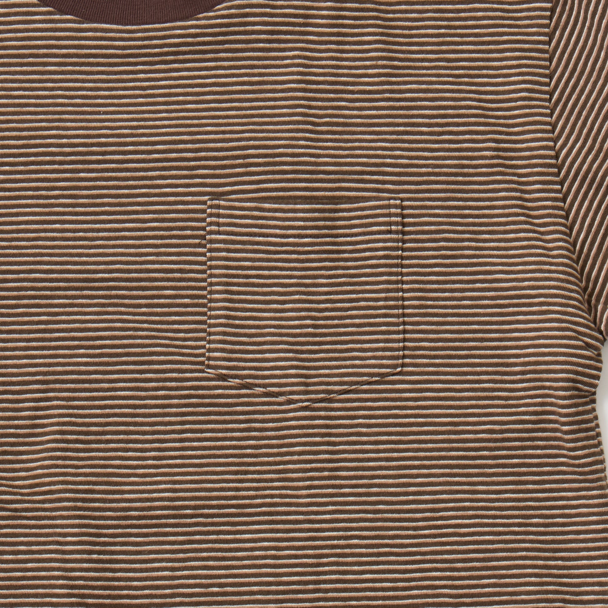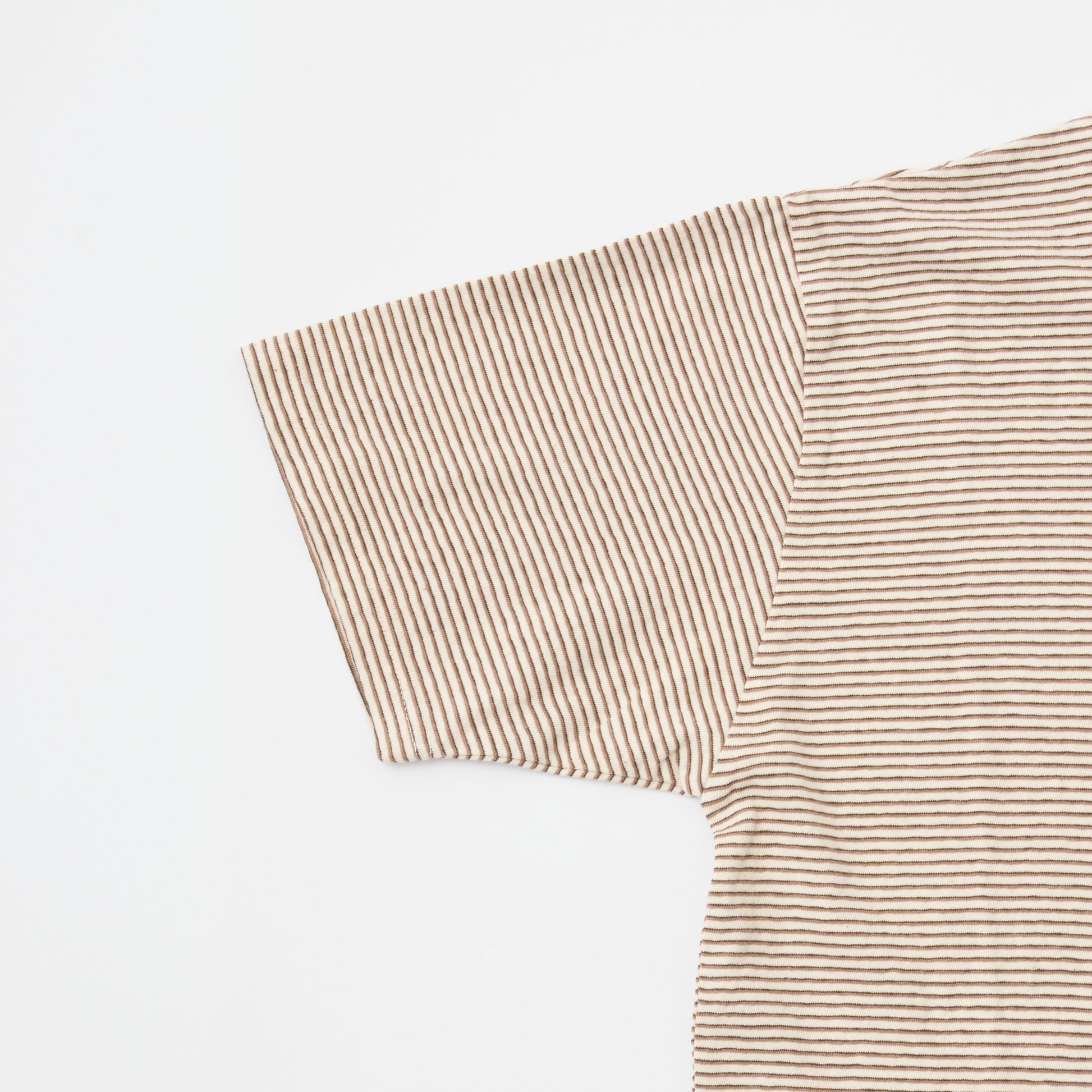FELCO(フェルコ)のS/S MOCK NECK NARROW STRIPE POCKET TEE。モックネックの高さや幅が良い塩梅のモックネックの半袖ストライプポケットT。モックネックの襟元や胸のポケットが特徴的なディテール。ゆとりのある身幅で短めの着丈のボックスシルエット。落ち着いた色合いの細いストライプはシンプルで落ち着いた雰囲気。生地は柔らかく、ミドルウェイト(中厚)で着心地抜群の1着。