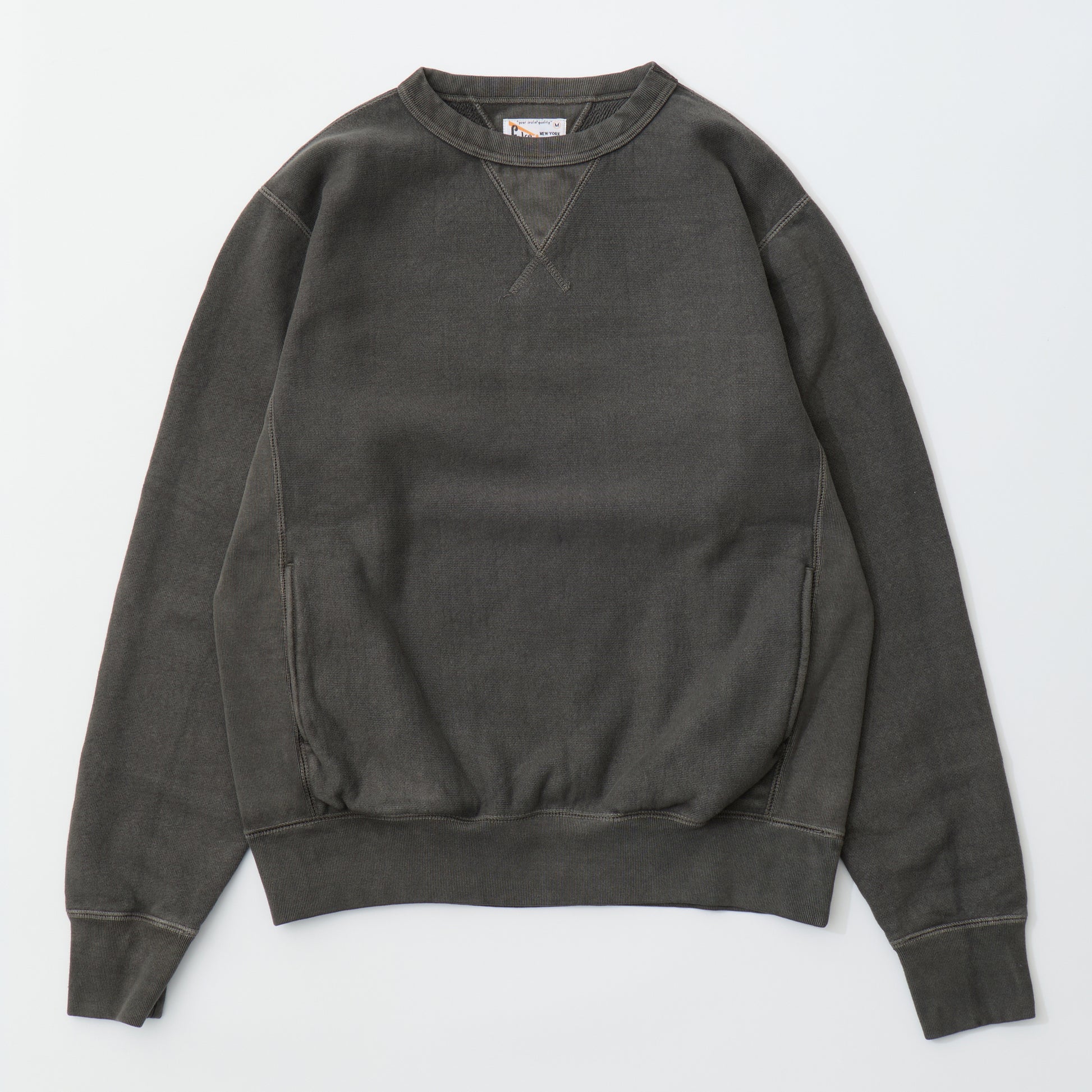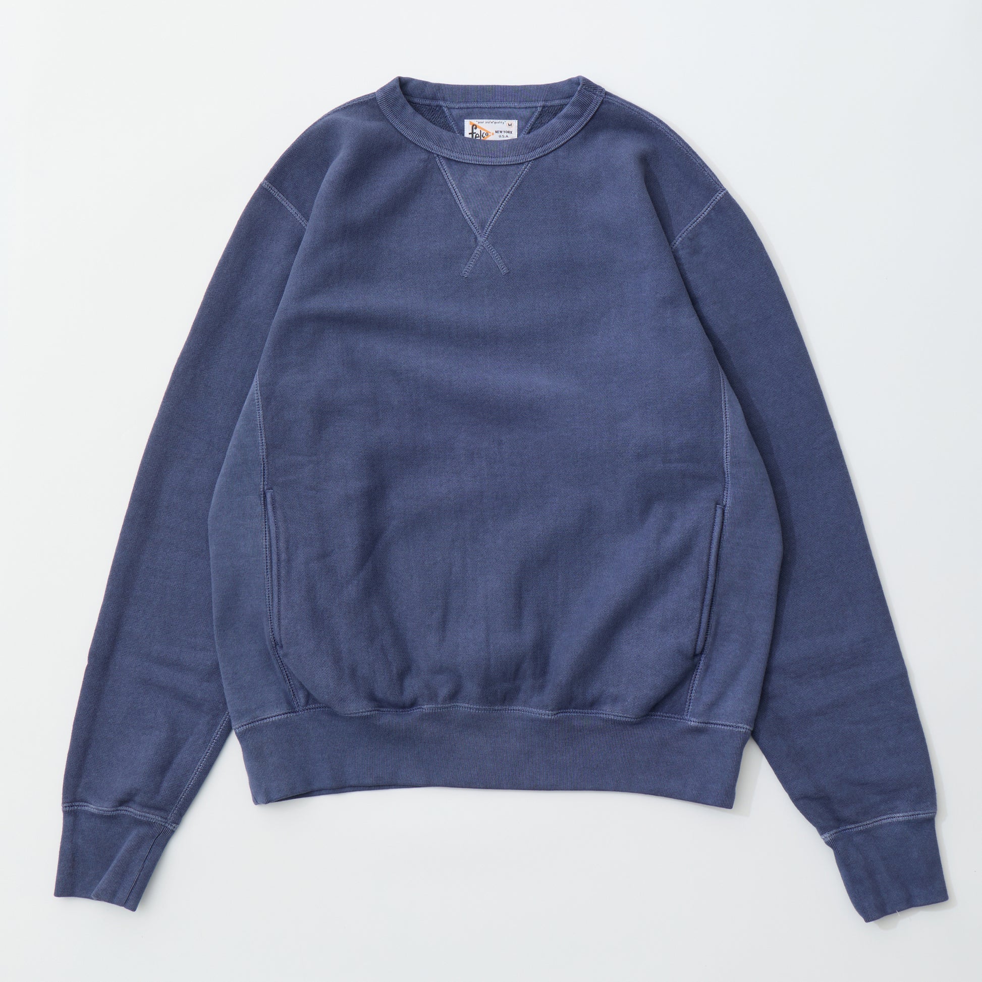 FELCO(フェルコ)の16oz TERRY CLASSIC FIT INVERSE WEAVE DOUBLE V GUSSET SET IN CREW SWEAT W/SLASH POCKET。独自で開発した16オンスの厚みとコシのある生地を使用した両Vガゼットクルーネックスウェット。生地を横向きに使用することで縦縮みを軽減し、サイドリブが横縮み防止と動きやすさを実現しています。ガシガシ着倒してもへこたれないタフな1着。袖と裾のリブはやや長めに設定されたヴィンテージを彷彿させる完成度。やや下辺りにハンドウォーマーポケットが付いているのも手を入れ易い仕様。従来のモデルよりも全体的にゆとりを持たせたクラシックフィット。ストレスのない着用感のスウェットで、クラッシックフィットモデルのコーチジャケットにも対応可能な1着。