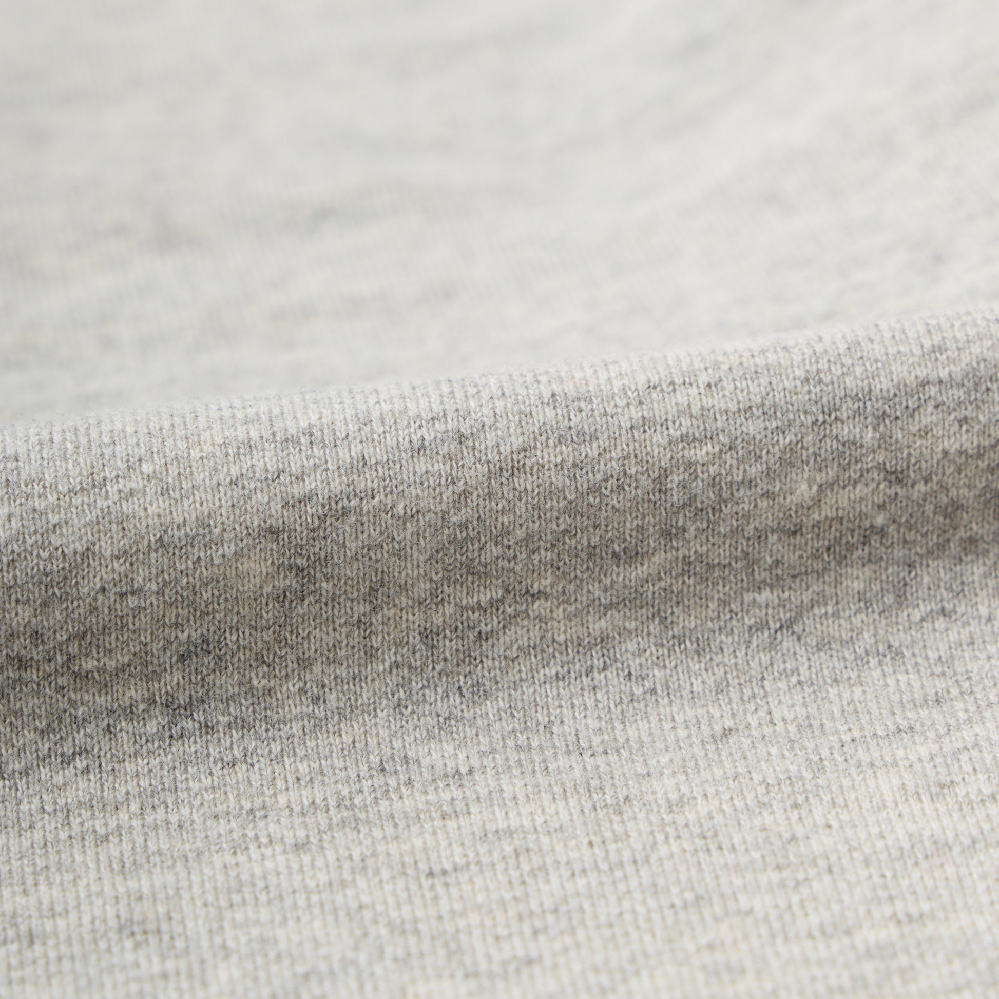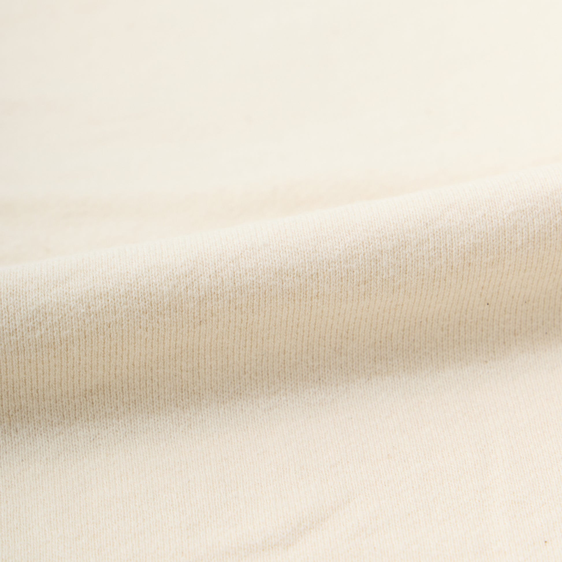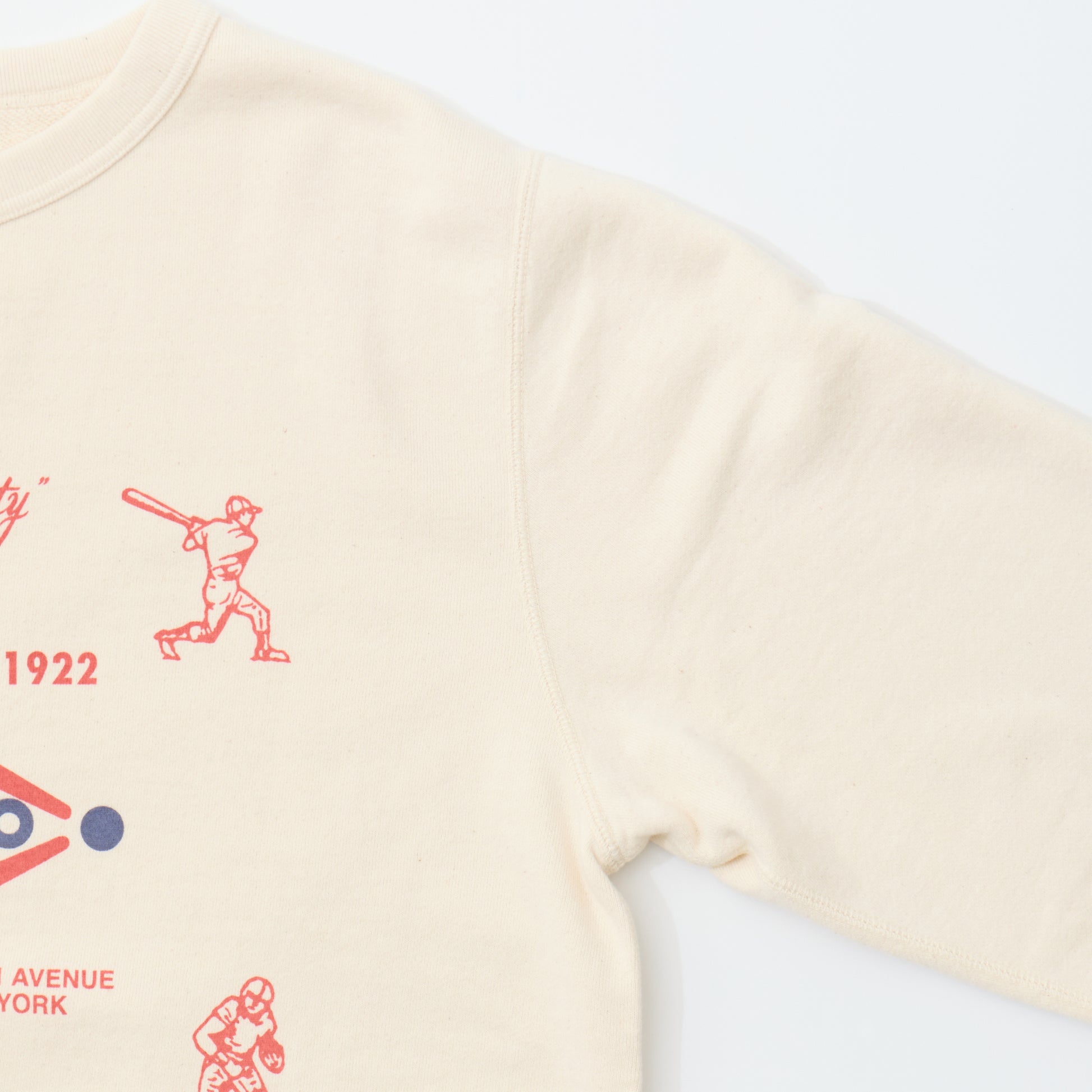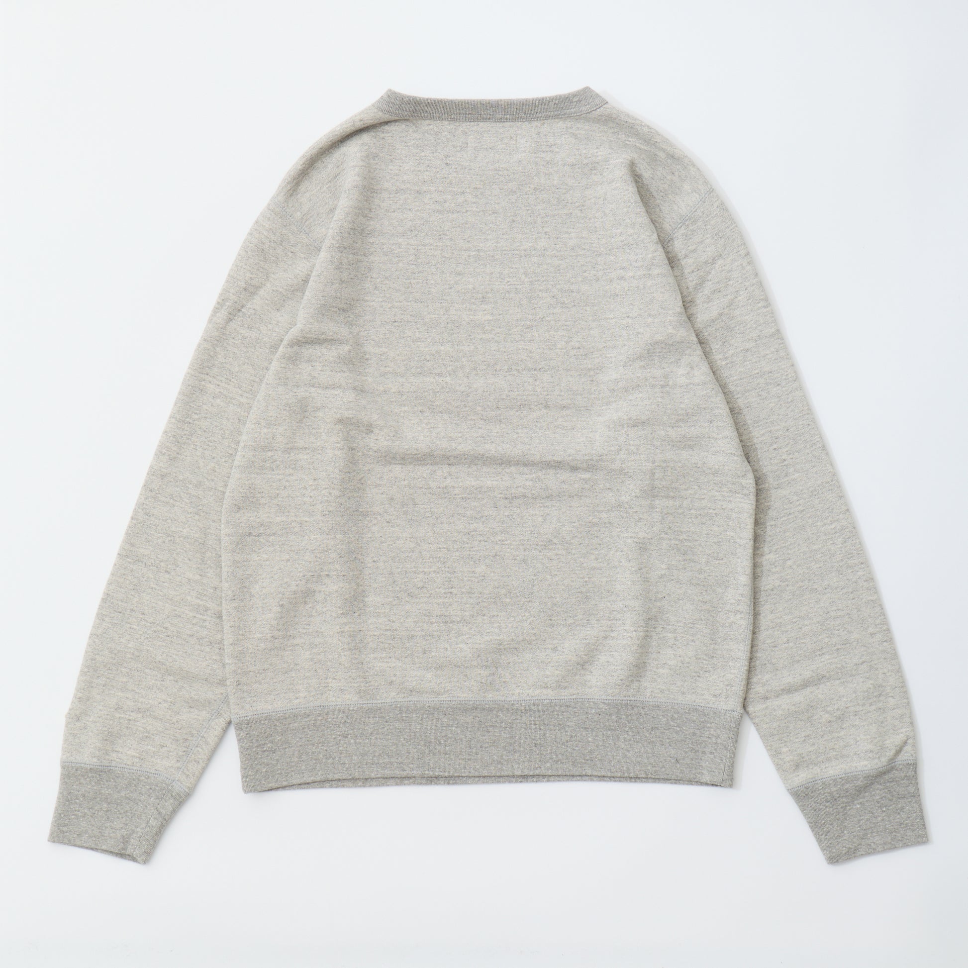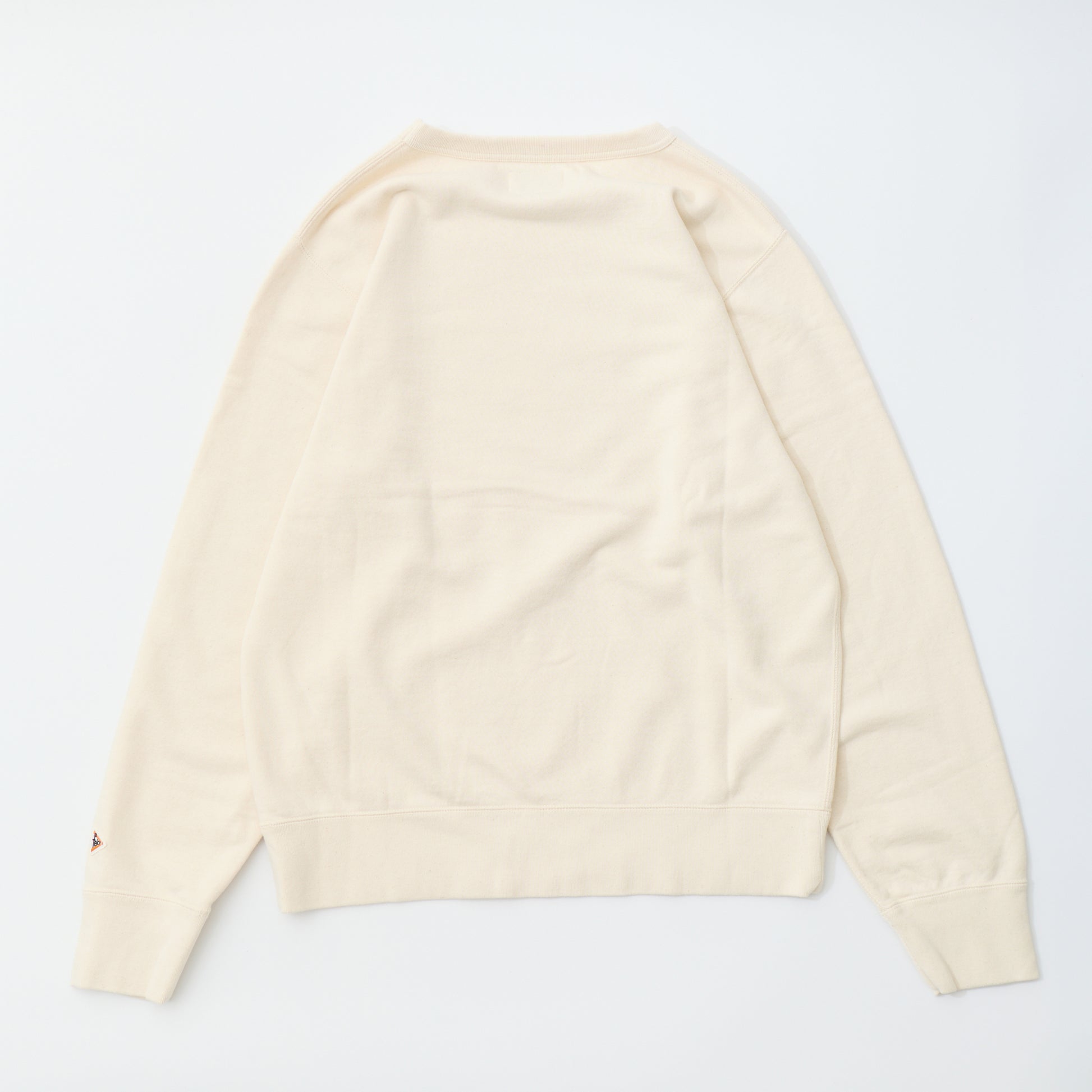 A set-in sleeve crewneck sweatshirt with a binder neck, made from lightweight French terry fabric (non-brushed sweatshirt material). The moderate thickness makes it easy to wear on its own in spring or fall, and also perfect as a layering piece when the weather gets colder. The print features a dye penetration finish with a unique uneven texture, recreating the vintage look and feel of well-worn athletic wear. A highly versatile piece that can be worn comfortably throughout the year.