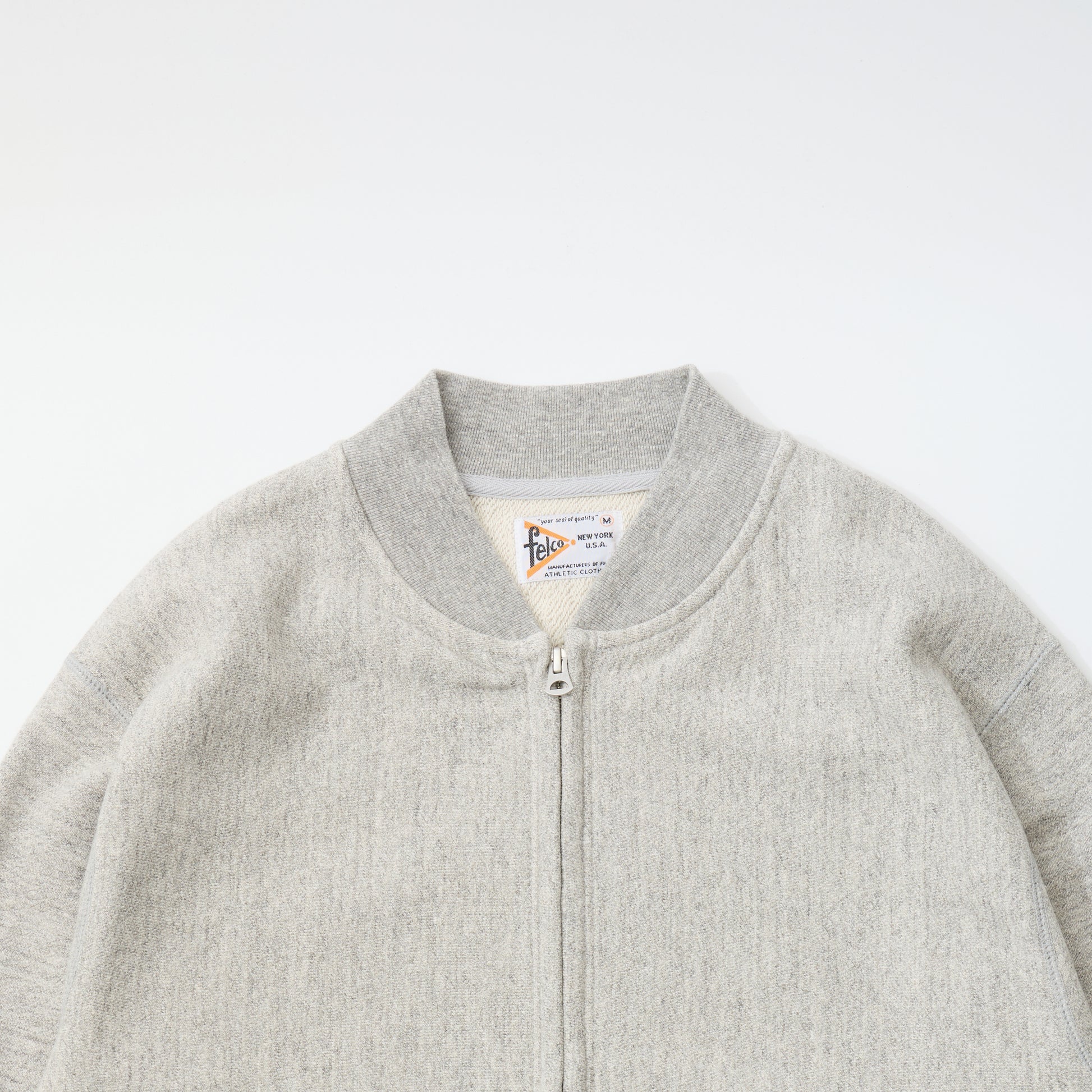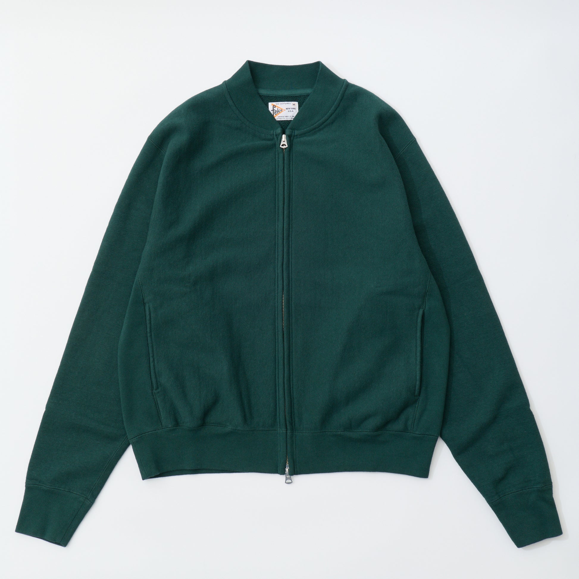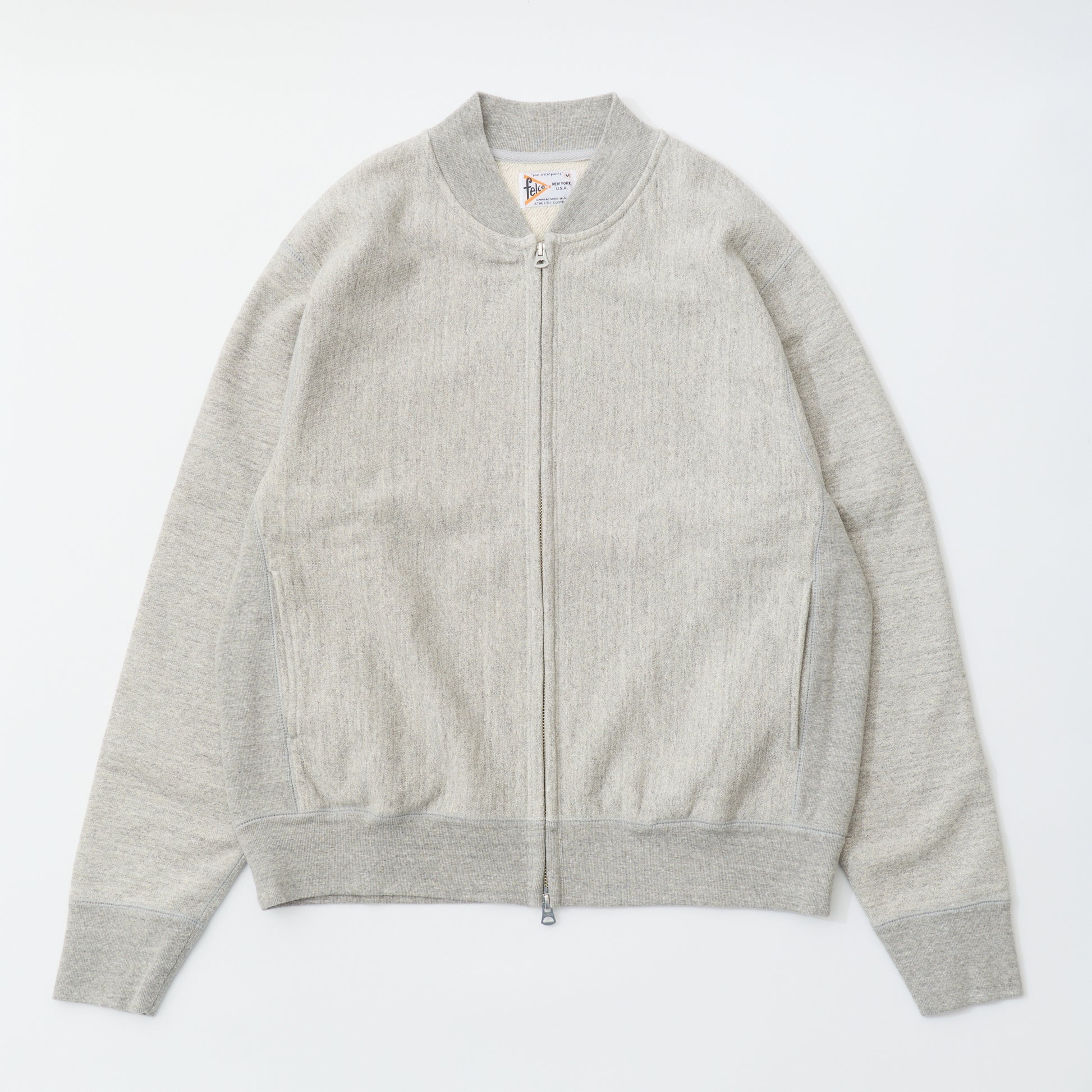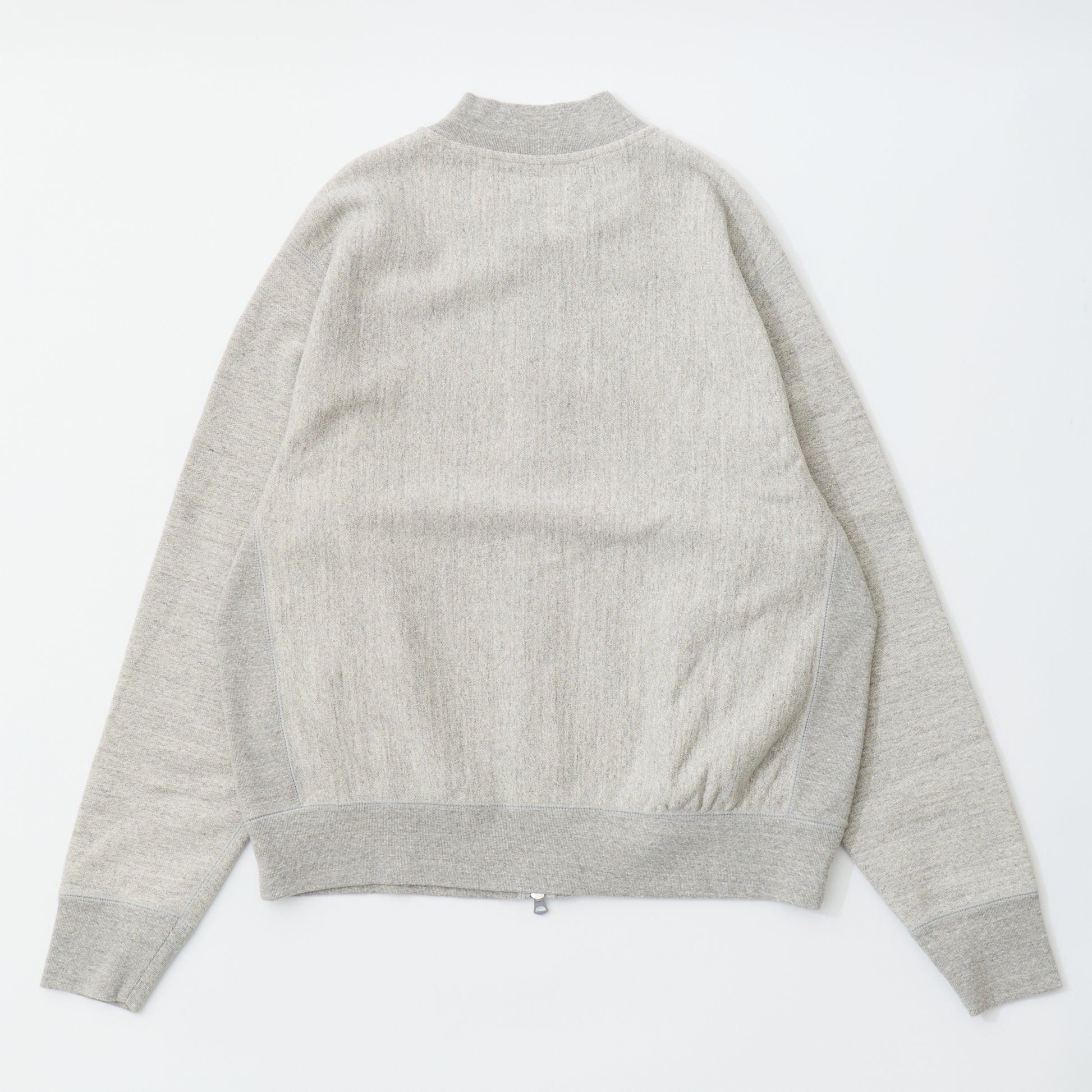 程よい厚みとコシのある16オンスのヘビーウェイトのフレンチテリー(裏起毛していないスウェット生地)素材のジップフロントのベースボールカラージャケット。生地を横向きに使用することで縦縮みを軽減し、サイドリブが横縮み防止と動きやすさを実現したインバースウィーブ仕様。。腰部分の左右にスラッシュポケットを装備。袖と裾のリブは長めのヴィンテージスウェット仕様。全体的にゆとりを持たせたクラシックフィット。