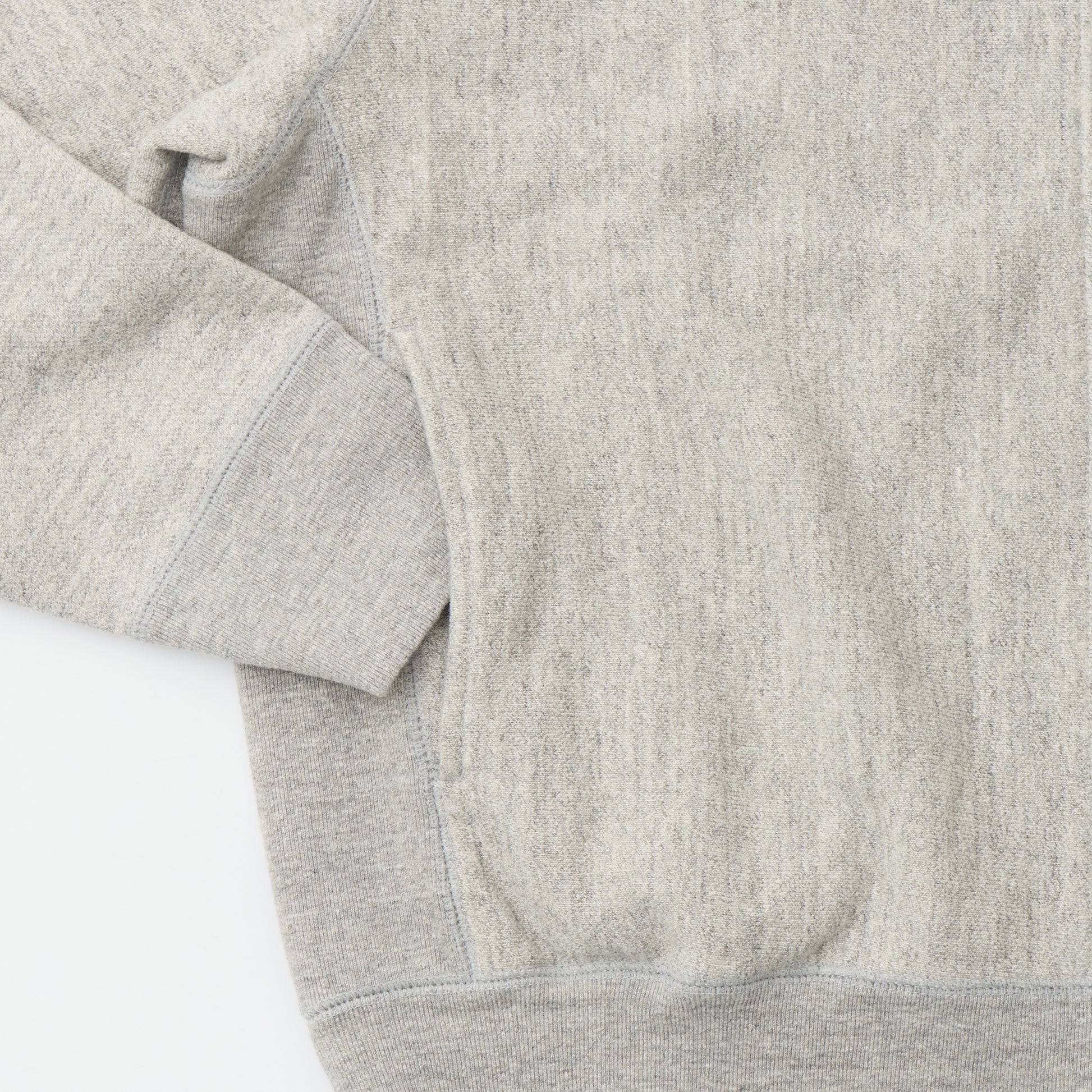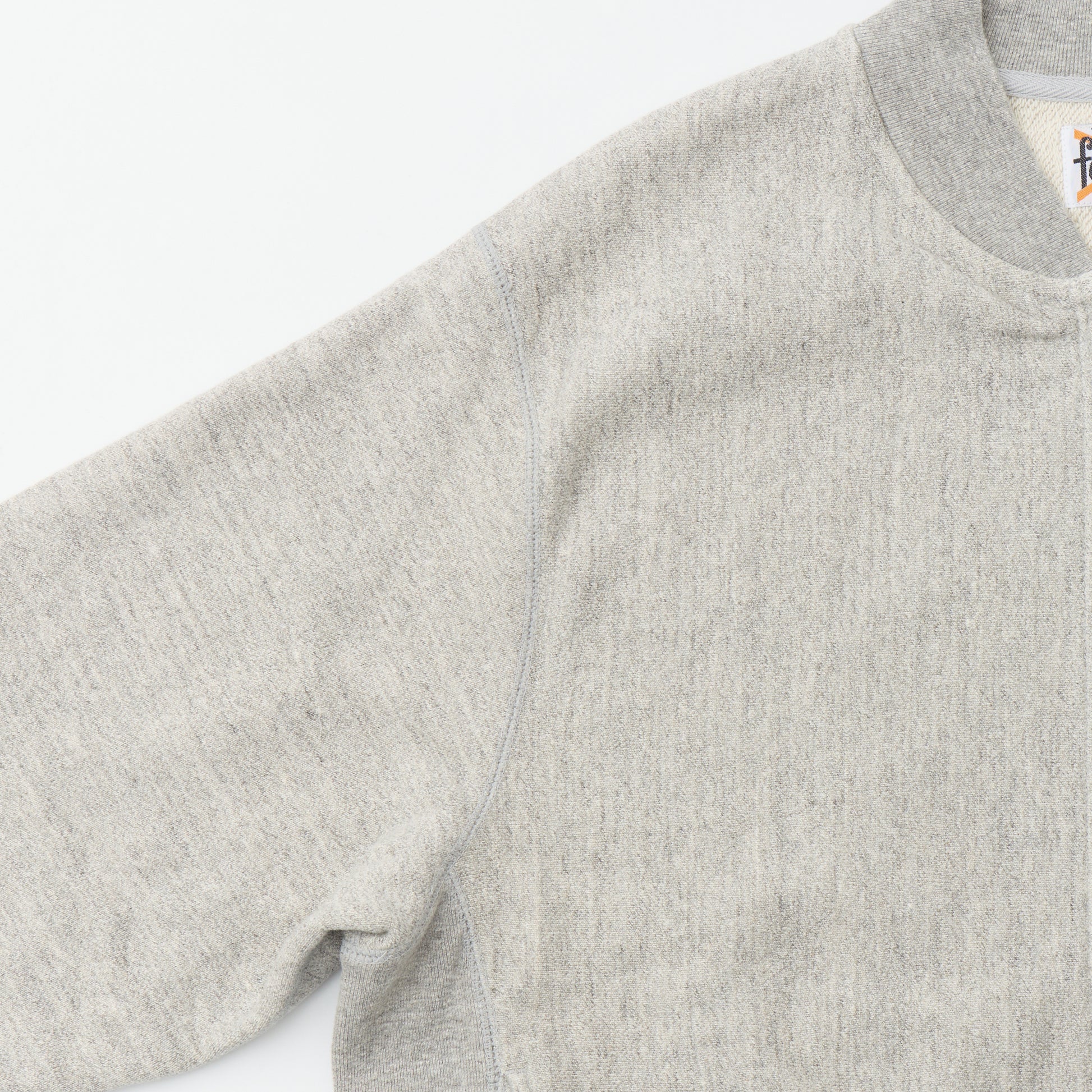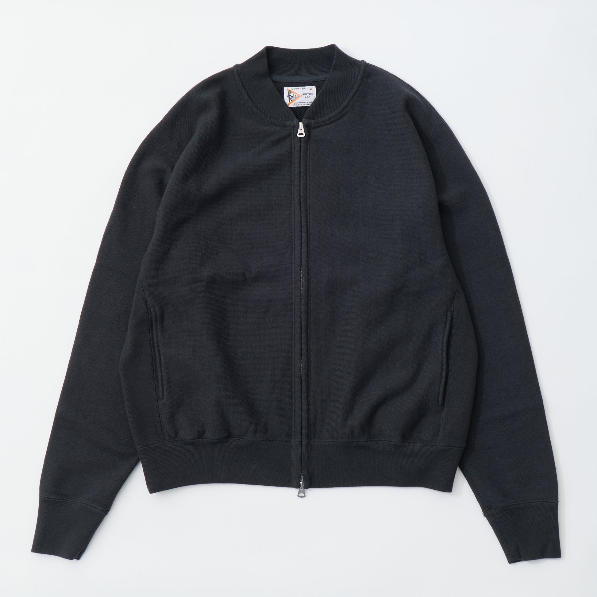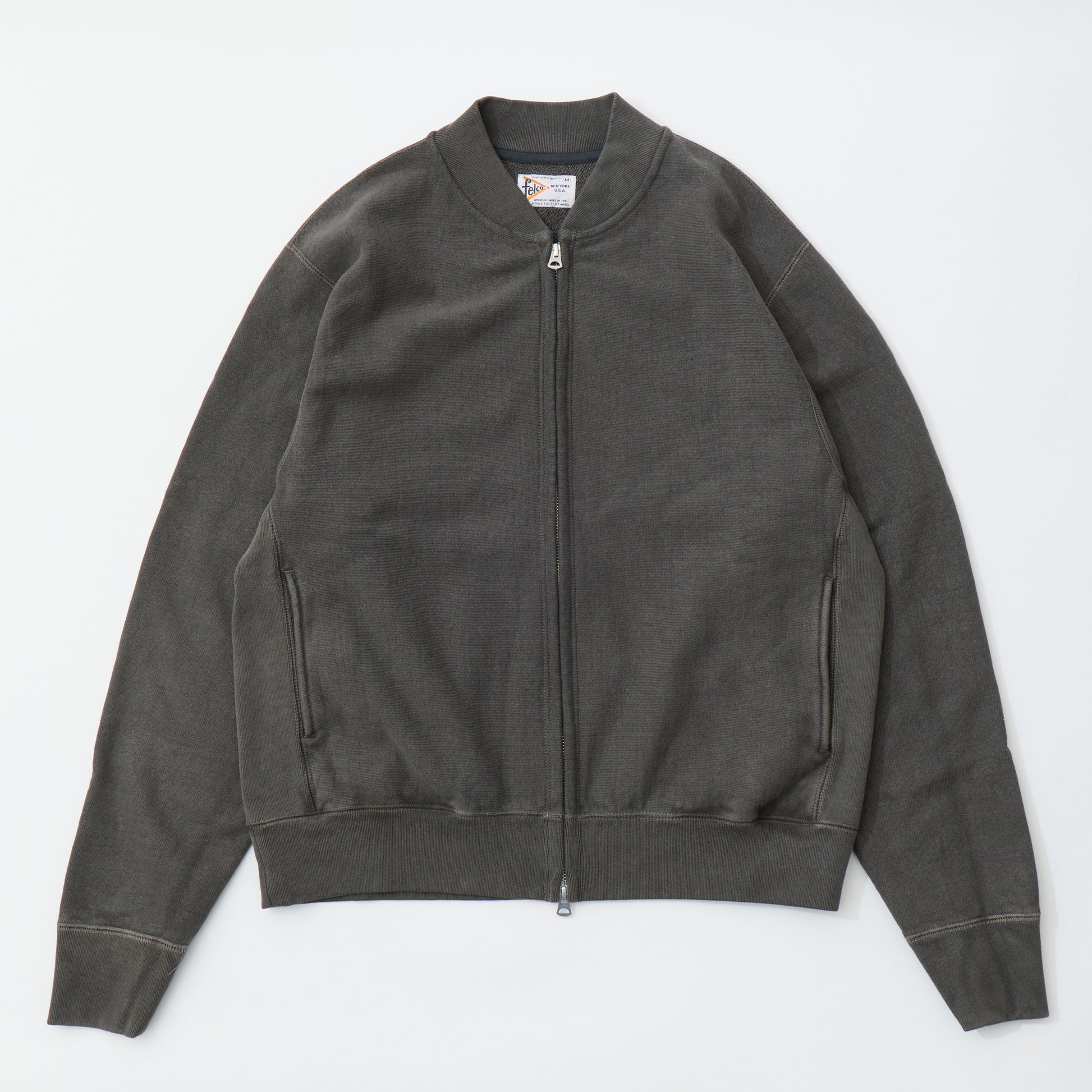 程よい厚みとコシのある16オンスのヘビーウェイトのフレンチテリー(裏起毛していないスウェット生地)素材のジップフロントのベースボールカラージャケット。生地を横向きに使用することで縦縮みを軽減し、サイドリブが横縮み防止と動きやすさを実現したインバースウィーブ仕様。。腰部分の左右にスラッシュポケットを装備。袖と裾のリブは長めのヴィンテージスウェット仕様。全体的にゆとりを持たせたクラシックフィット。