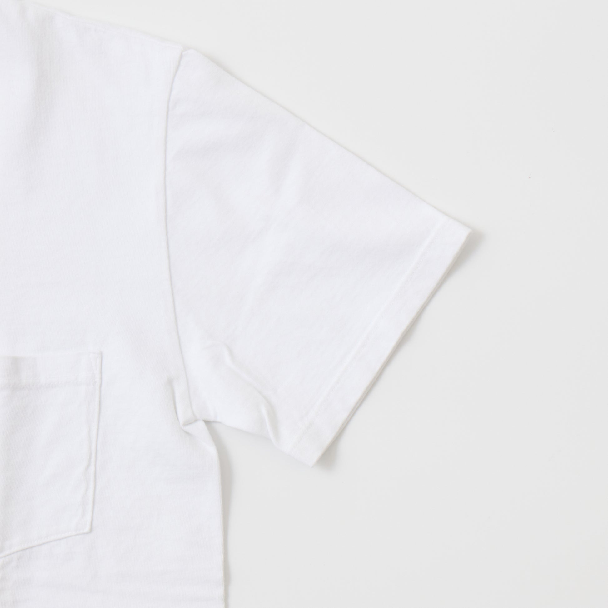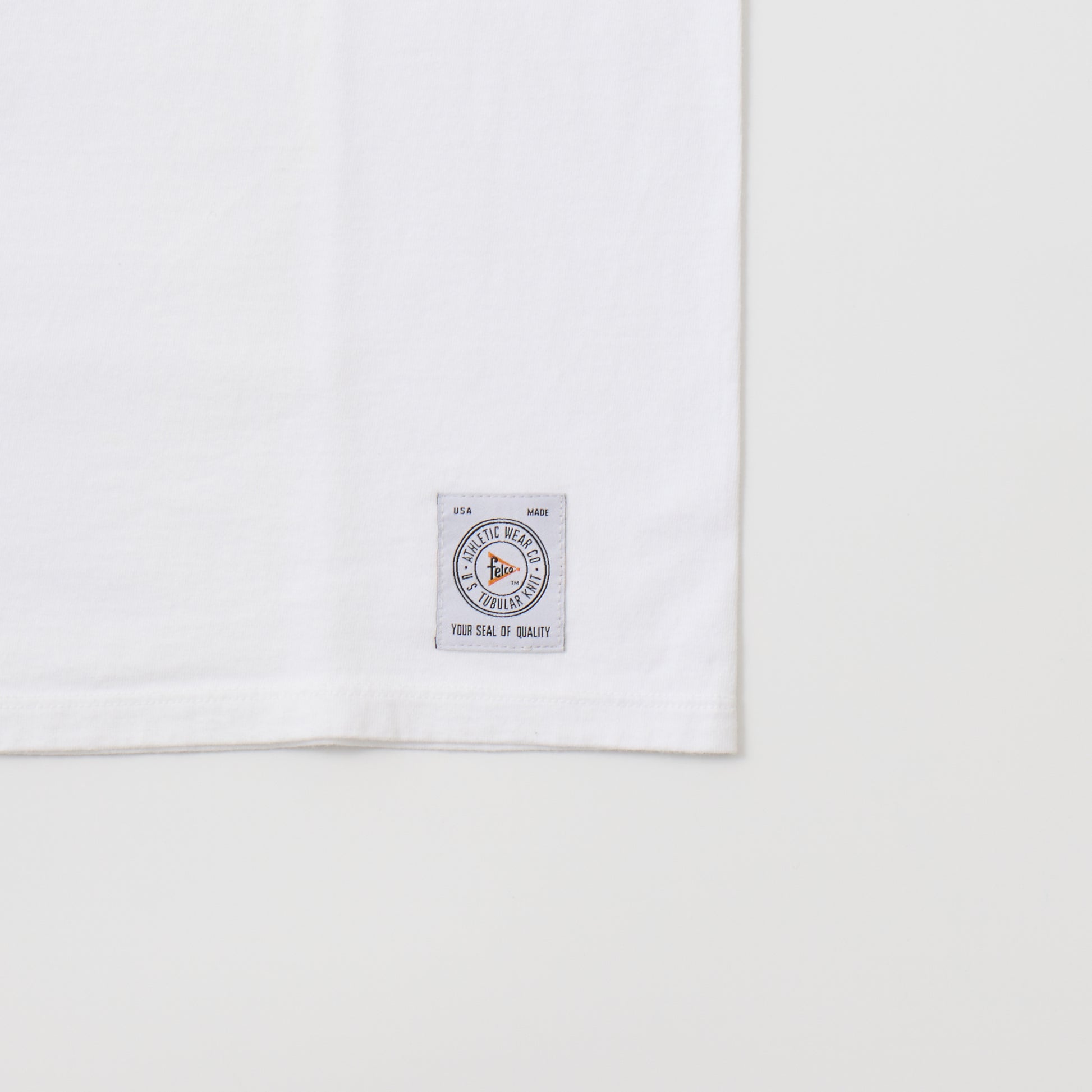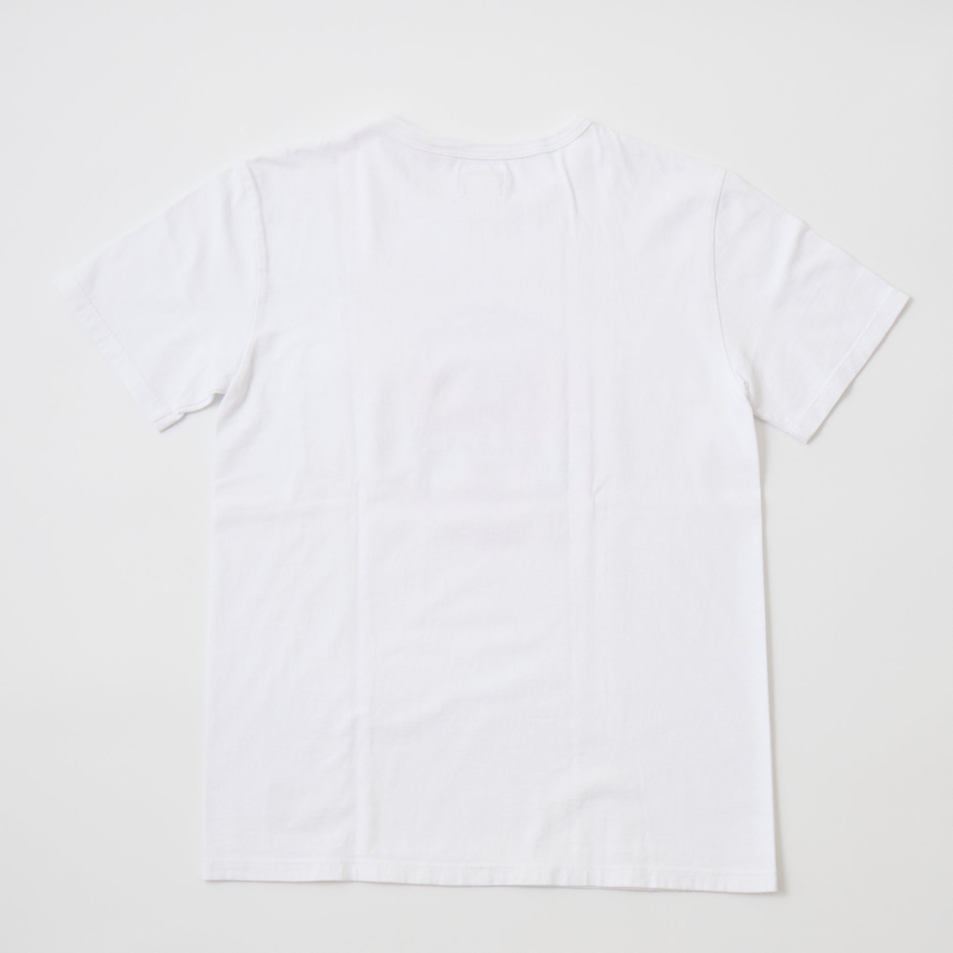 縫い目のない丸胴ボディのアメリカ製のクルーネックポケットT。いかにもアメリカブランドらしい国鳥のイーグルがデザインされていてウォータープリントがされている1枚。やや短めの着丈でリラックス感のある、アメリカらしいボックスシルエットが特徴です。年々減少しつつあるアメリカ製というのも大きな魅力。クルーネック部分はバインダーで伸びにくい仕様になっています。ポケットの上からウォータープリントされていてプリントがかすれて古着にあるようなプリントTシャツです。