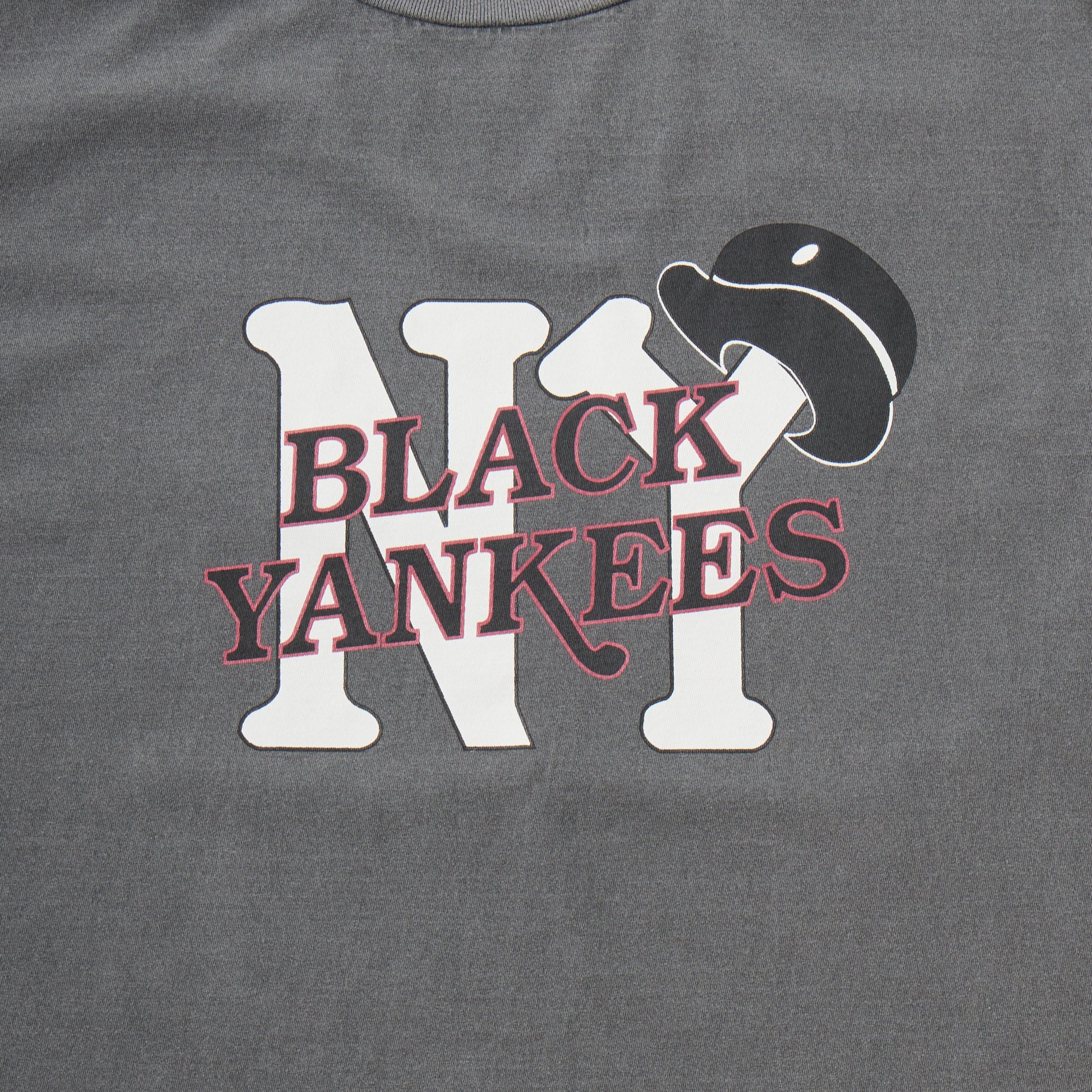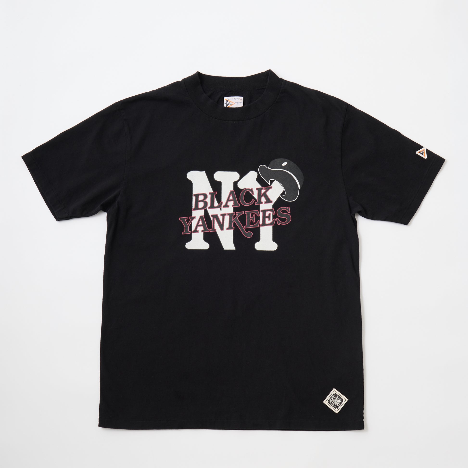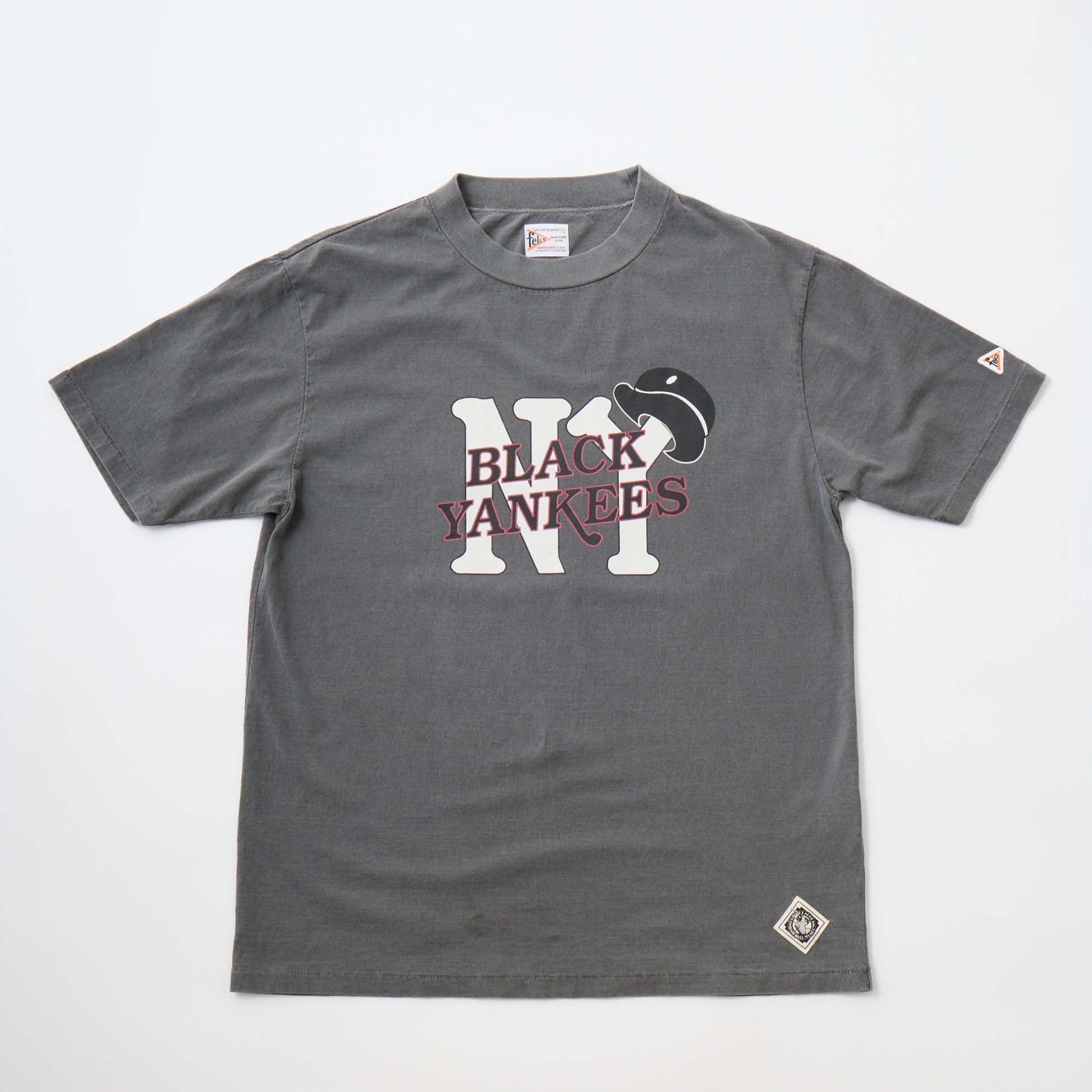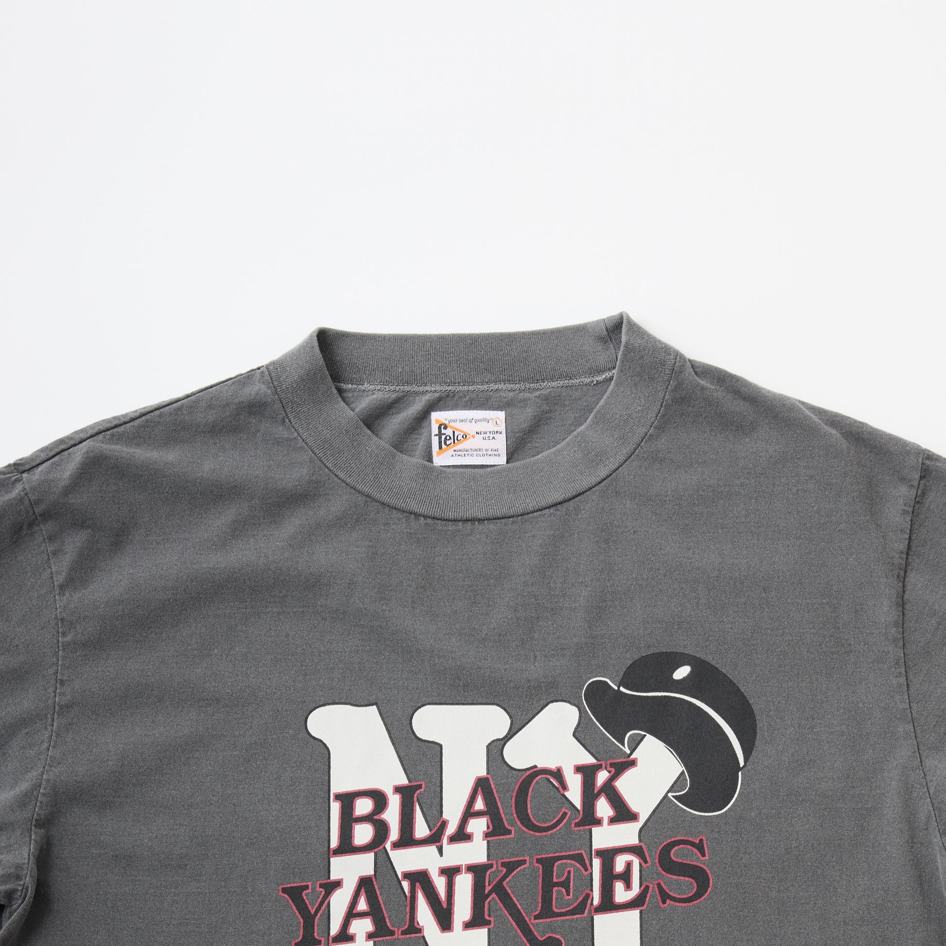 FELCO(フェルコ)の S/S HI-CREW 5oz 30SINGLE CALIFORNIA JERSEY – NEW YORK BLACK YANKEES PRINT2。60年代のアメリカを彷彿とさせるハイクルーの首元、素材はカリフォルニア綿の30番手の細い糸を使用し、人気のガッシリとしたTシャツと逆向した肌触りの柔らかい仕上がりに、アメリカンビンテージ漂うプリントを施しています。