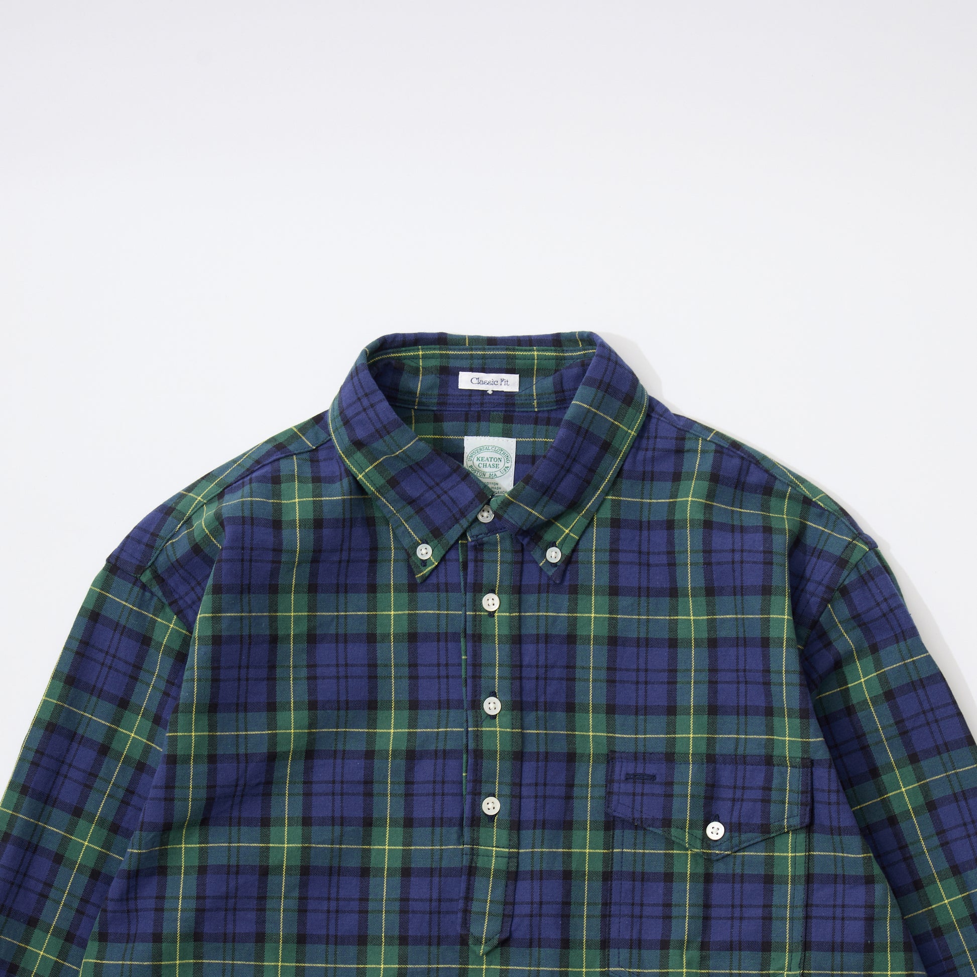 KEATON CHASE USA(キートンチェイスUSA)のL/S CLASSIC FIT PULLOVER BD SHIRT TWILL CHECK。日本生産ラインのプルオーバーの長袖ボタンダウンシャツ。左胸にフラップポケットが配置。背面はボックスプリーツ仕様。襟の後ろにはチョークボタン付き。程よいゆとりのクラシックフィット。素材は落ち着いた色合いのチェック柄のコットンツイル素材を使用。